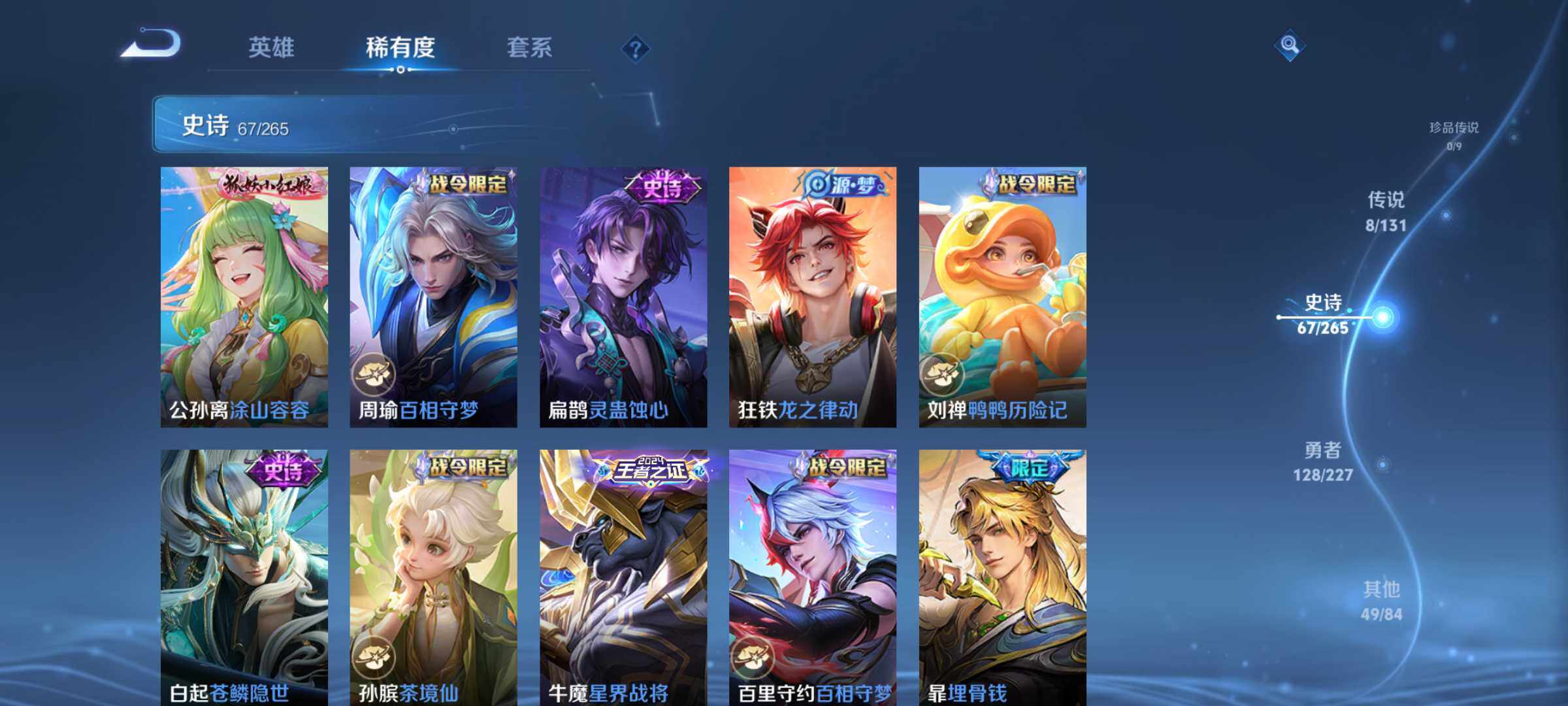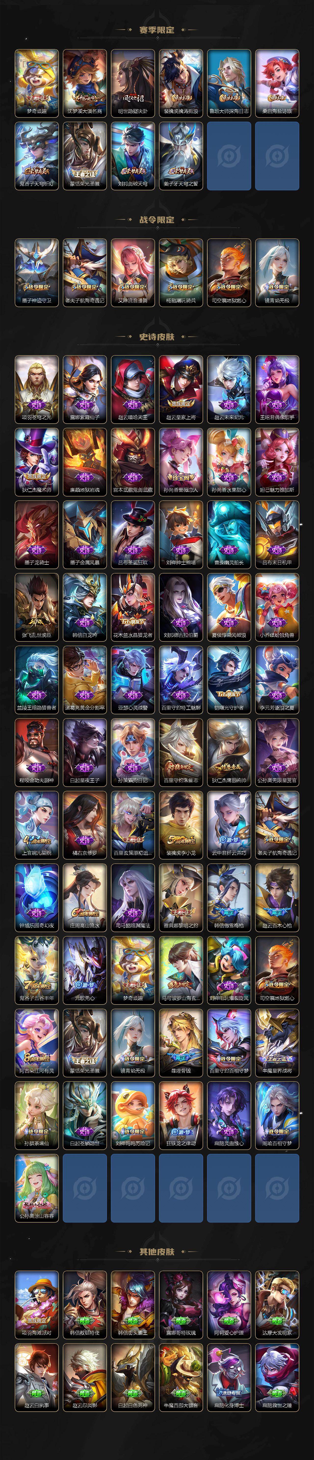 【赛季限定】:狄仁杰万华元夜,达摩沙漠行僧,老夫子醍醐杖,程咬金演武夺筹,兰陵王金庭之子,张良古海寻踪,李元芳云中旅人,钟馗驱傩正仪,雅典娜黎明之约,鬼谷子原初探秘者,苏烈千军破阵,百里玄策原初追逐者,梦奇顽趣,沈梦溪大漠名商,明世隐疑决卦,裴擒虎擒涛扼浪,鲁班大师探海日志,桑启海盐诗旅,鬼谷子天穹祈灯,蒙恬荣光圣徽,刘邦剑破天穹,姜子牙天穹之誓