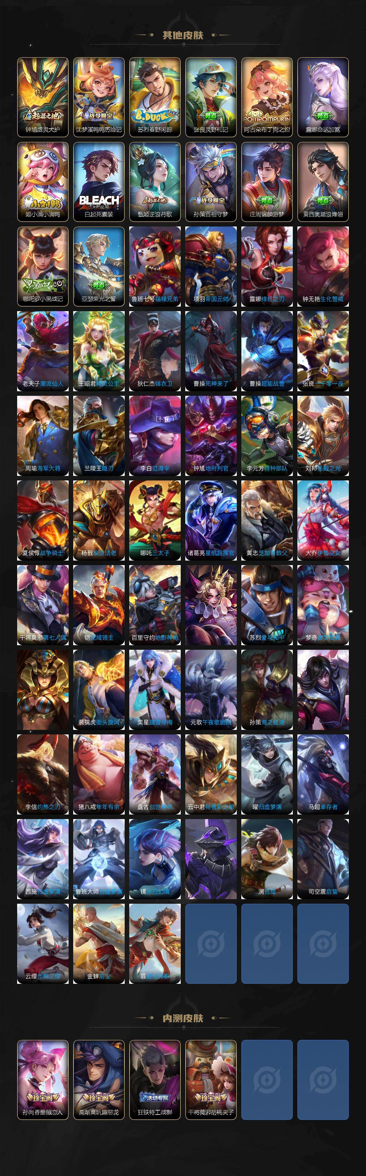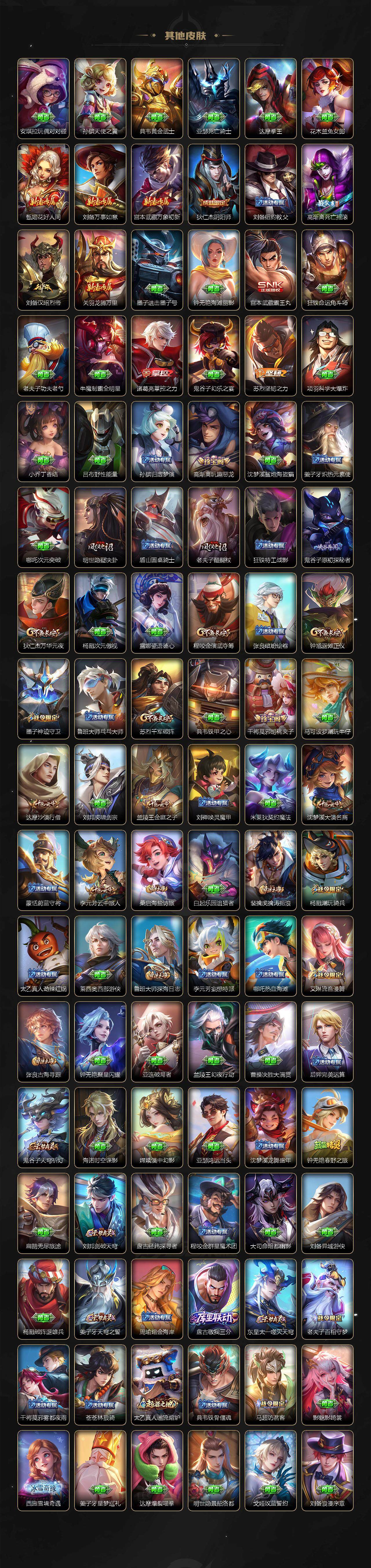 李元芳逐浪之夏,公孙离无限星赏官,孙策猫狗日记,露娜紫霞仙子,诸葛亮黄金分割率,王昭君偶像歌手,韩信白龙吟,项羽苍穹之光,吕布末日机甲,橘右京修罗,墨子龙骑士,刘禅绅士熊喵,白起星夜王子,程咬金功夫厨神,刘邦德古拉伯爵,兰陵王暗隐猎兽者,曹操幽灵船长,宫本武藏鬼剑武藏,司马懿暗渊魔法,亚瑟心灵战警,钟馗乐园奇幻夜,廉颇地狱岩魂,小乔缤纷独角兽,夏侯惇乘风破浪,花木兰水晶猎龙者,铠曙光守护者,墨子金属风暴,百里玄策原初追逐者,吕布圣诞狂欢,百里守约特工魅影,雅典娜黎明之约,刘禅电玩·爆裂旋风,白起苍鳞隐世