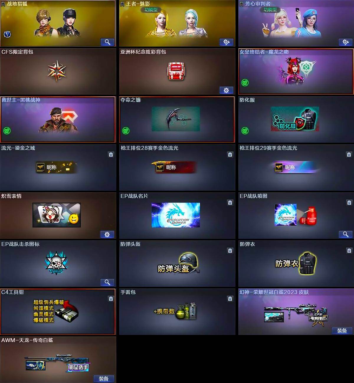 【道具】:CFS限定背包,亚洲杯纪念炫彩背包,女皇终结者-魔龙之吻,救世主-黑桃战神,夺命之镰,防化服,流光-鎏金之域,枪王排位28赛季金色流光,枪王排位29赛季金色流光,炽雪表情,EP战队名片,EP战队喷图,EP战队击杀图标,防弹头盔,防弹衣,C4工具钳,手雷包