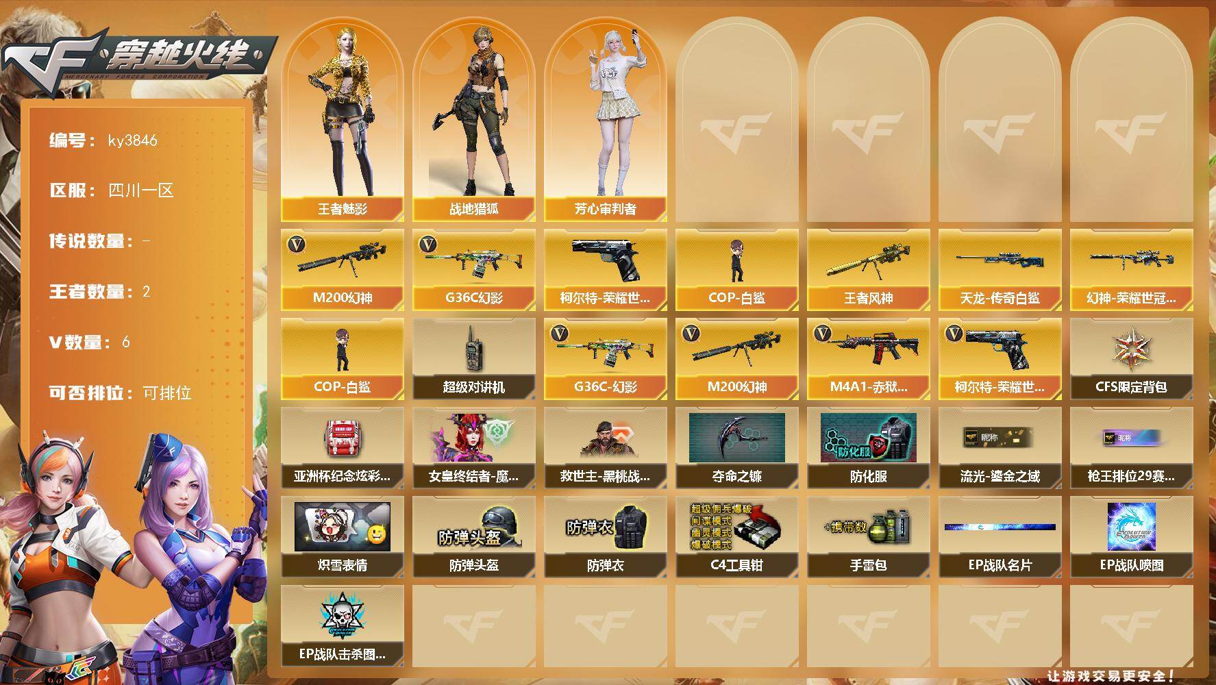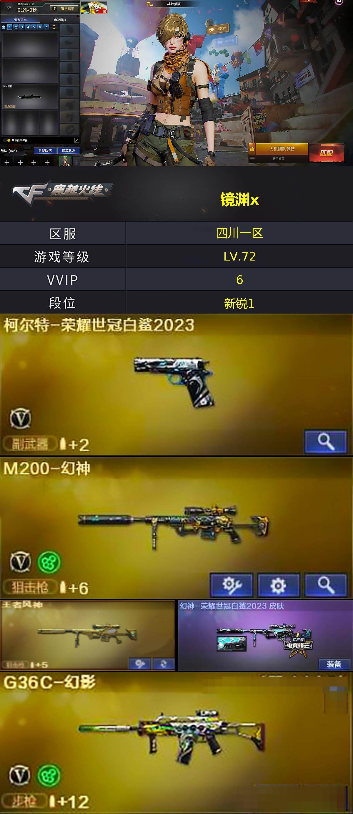[14350050]四川一区-6V-2王者-0炫金 【热门武器】:G36C-幻影,M200-幻神,柯尔特-荣耀世冠白鲨2023,COP-白鲨 【王者炫金武器】:王者风神 【皮肤】:幻神-荣耀世冠白鲨2023 皮肤,AWM-天龙-传奇白鲨 【角色】:战地猎狐,王者-魅影,芳心审判者 【人偶武器】:COP-白鲨 【暴走生化】:超级对讲机 【英雄级武器】:G36C-幻影,M200-幻神,柯尔特-荣耀世冠白鲨2023,M4A1-赤狱骑士 【道具】:CFS限定背包,亚洲杯纪念炫彩背包,女皇终结者-魔龙之吻,救世主-黑桃战神,夺命之镰,防化服,流光-鎏金之域,枪王排位28赛季金色流光,枪王排位29赛季金色流光,炽雪表情,EP战队名片,EP战队喷图,EP战队击杀图标,防弹头盔,防弹衣,C4工具钳,手雷包 【特殊枪械】: