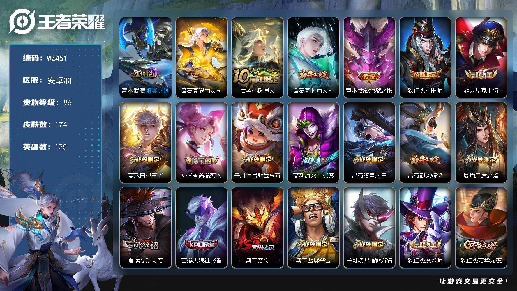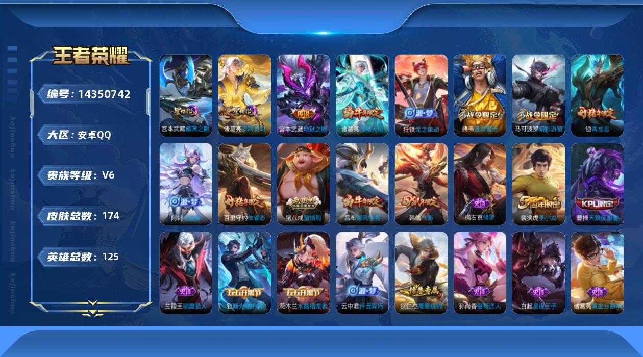 [14350742]万战司马懿,诸葛亮积分夺宝298,安卓Q-174皮肤-3传说-40史诗 【传说皮肤】:后羿神树通天,诸葛亮时雨天司,宫本武藏地狱之眼 【限定皮肤】:狄仁杰阴阳师,赵云皇家上将,嬴政白昼王子,孙尚香蔷薇恋人,鲁班七号狮舞东方,高渐离死亡摇滚,吕布猎兽之王,吕布御风骁将,周瑜赤莲之焰,夏侯惇朔风刀,曹操天狼征服者,典韦穷奇,典韦蓝屏警告,马可波罗暗影游猎,狄仁杰魔术师,狄仁杰万华元夜,达摩沙漠行僧,项羽海滩派对,老夫子醍醐杖,程咬金演武夺筹,韩信飞衡,兰陵王驯魔猎人,牛魔御旌,李元芳银河之约,钟馗神迹守卫,钟馗驱傩正仪,杨玉环遇见飞天,女娲朔望之晖,雅典娜单词大作战,鬼谷子原初探秘者,诸葛亮时雨天司,铠青龙志,苏烈千军破阵,百里玄策原初追逐者,百里守约朱雀志,弈星混沌棋,沈梦溪星空之诺,沈梦溪大漠名商,明世隐疑决卦,裴擒虎李小龙,狂铁御狮,米莱狄御霄,云中君纤云弄巧,盾山御銮,猪八戒西部大镖客,猪八戒猪悟能,上官婉儿梁祝,蒙犽狂想玩偶喵,沈梦溪龙舞盛年 【年限皮肤】:百里守约朱雀志,铠青龙志,吕布御风骁将,诸葛亮时雨天司,韩信飞衡 【赛季限定】:夏侯惇朔风刀,典韦穷奇,狄仁杰万华元夜,达摩沙漠行僧,老夫子醍醐杖,程咬金演武夺筹,牛魔御旌,钟馗驱傩正仪,鬼谷子原初探秘者,苏烈千军破阵,百里玄策原初追逐者,弈星混沌棋,沈梦溪大漠名商,明世隐疑决卦,狂铁御狮,米莱狄御霄,盾山御銮 【战令限定】:嬴政白昼王子,鲁班七号狮舞东方,吕布猎兽之王,周瑜赤莲之焰,典韦蓝屏警告,马可波罗暗影游猎,兰陵王驯魔猎人,李元芳银河之约,钟馗神迹守卫,女娲朔望之晖,雅典娜单词大作战,沈梦溪星空之诺,猪八戒西部大镖客,蒙犽狂想玩偶喵 【史诗皮肤】:赵云皇家上将,王昭君偶像歌手,狄仁杰魔术师,孙尚香蔷薇恋人,孙尚香水果甜心,妲己魅力维加斯,墨子金属风暴,吕布圣诞狂欢,韩信白龙吟,花木兰水晶猎龙者,小乔缤纷独角兽,兰陵王暗隐猎兽者,诸葛亮黄金分割率,铠曙光守护者,李元芳逐浪之夏,白起星夜王子,杨玉环遇见飞天,嬴政白昼王子,孙策猫狗日记,铠青龙志,百里守约朱雀志,典韦蓝屏警告,鲁班七号狮舞东方,狄仁杰鹰眼统帅,兰陵王驯魔猎人,上官婉儿梁祝,曹操天狼征服者,李元芳银河之约,韩信飞衡,橘右京修罗,马可波罗暗影游猎,蒙犽狂想玩偶喵,百里玄策原初追逐者,裴擒虎李小龙,云中君纤云弄巧,吕布御风骁将,猪八戒猪悟能,