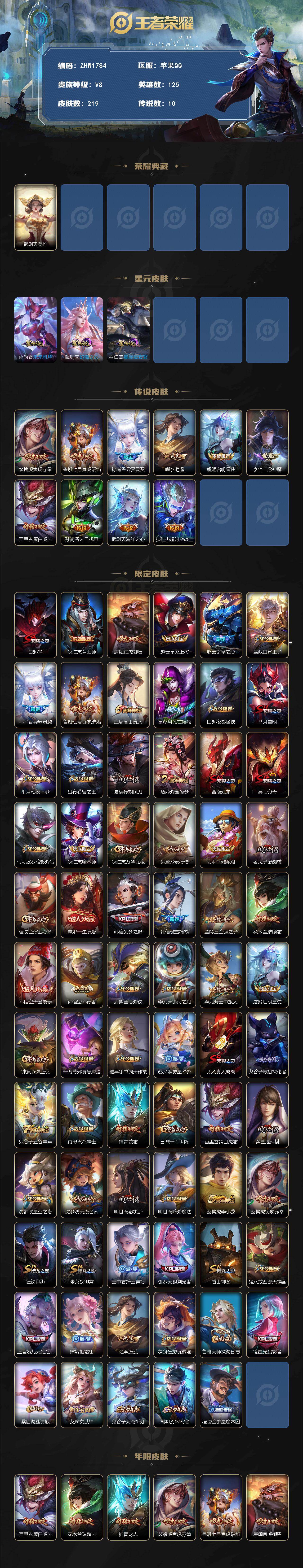 [14352169]可二次,【店主推荐捡漏号!可直接换绑】苹果Q-V8-荣耀黄金I段位-125英雄-219皮肤-1典藏英雄-10传说-64史诗