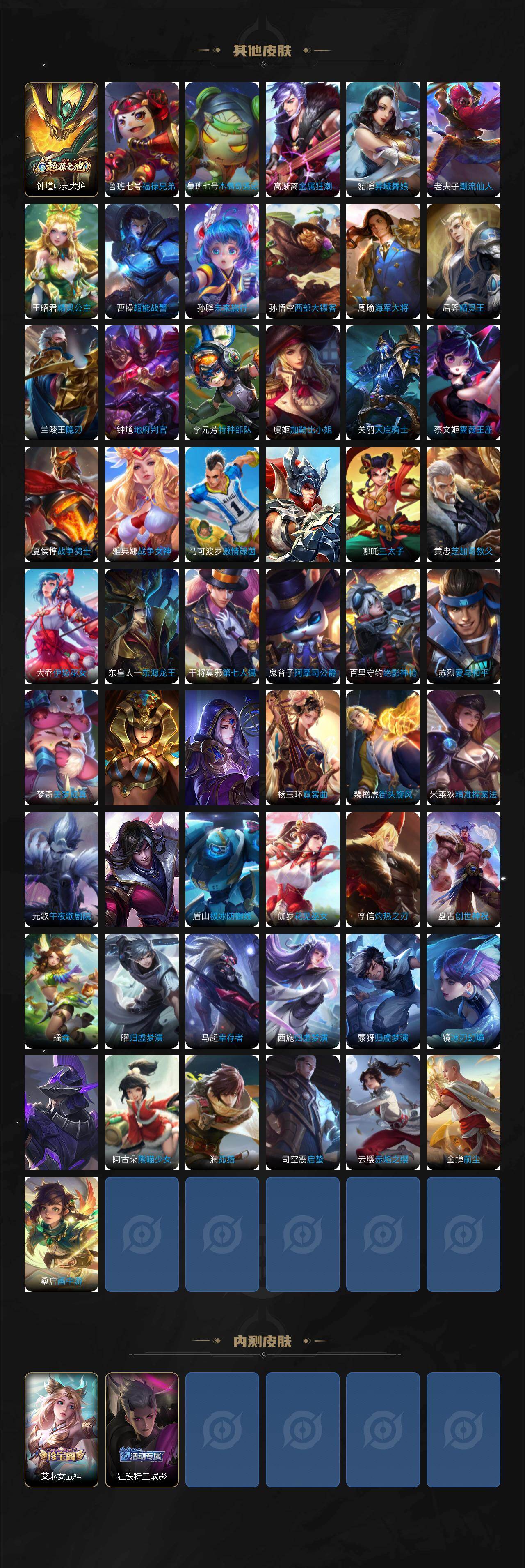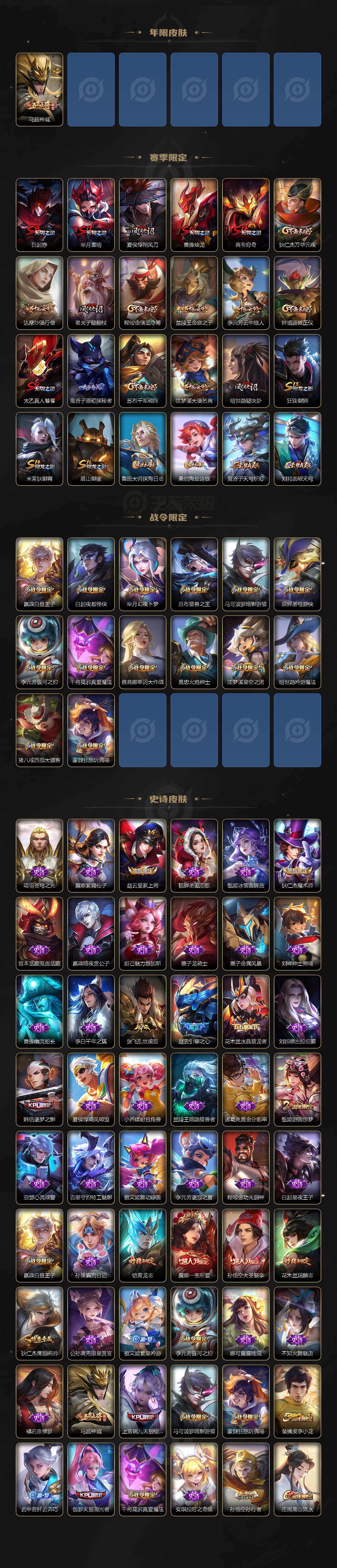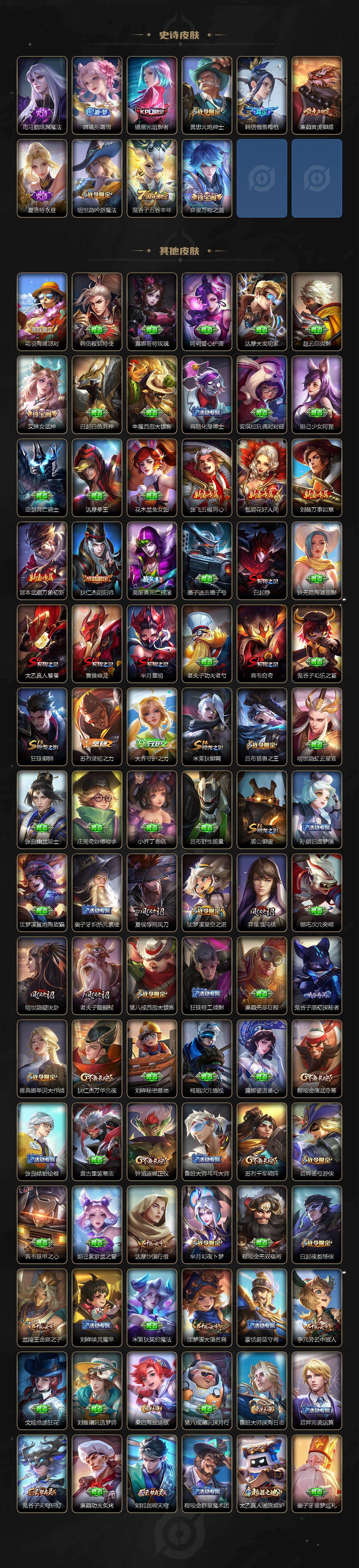 【限定皮肤】:白起狰,狄仁杰阴阳师,廉颇寅虎御盾,赵云皇家上将,赵云引擎之心,嬴政白昼王子,孙尚香异界灵契,鲁班七号寅虎瑞焰,庄周高山流水,高渐离死亡摇滚,白起夜都怪侠,芈月重明,芈月幻夜卜梦,吕布猎兽之王,夏侯惇朔风刀,甄姬游园惊梦,曹操烛龙,典韦穷奇,马可波罗暗影游猎,狄仁杰魔术师,狄仁杰万华元夜,达摩沙漠行僧,项羽海滩派对,老夫子醍醐杖,程咬金演武夺筹,露娜一生所爱,韩信逐梦之影,韩信傲雪梅枪,兰陵王金庭之子,花木兰瑞麟志,孙悟空大圣娶亲,孙悟空孙行者,后羿圣弓游侠,李元芳银河之约,李元芳云中旅人,虞姬启明星使,钟馗驱傩正仪,干将莫邪真爱魔法,雅典娜单词大作战,蔡文姬繁星吟游,太乙真人饕餮,鬼谷子原初探秘者,鬼谷子五谷丰年,黄忠火炮绅士,铠青龙志,苏烈千军破阵,百里玄策白虎志,弈星混沌棋,沈梦溪星空之诺,沈梦溪大漠名商,明世隐疑决卦,明世隐吟游魔法,裴擒虎李小龙,裴擒虎寅虎赤拳,狂铁御狮,米莱狄御霄,云中君纤云弄巧,伽罗天狼溯光者,盾山御銮,猪八戒西部大镖客,上官婉儿天狼绘梦者,嫦娥拒霜思,曜李逍遥 ,蒙犽狂想玩偶喵,鲁班大师探海日志,镜匿光追影者,桑启海盐诗旅,艾琳女武神,鬼谷子天穹祈灯,刘邦剑破天穹,程咬金群星魔术团