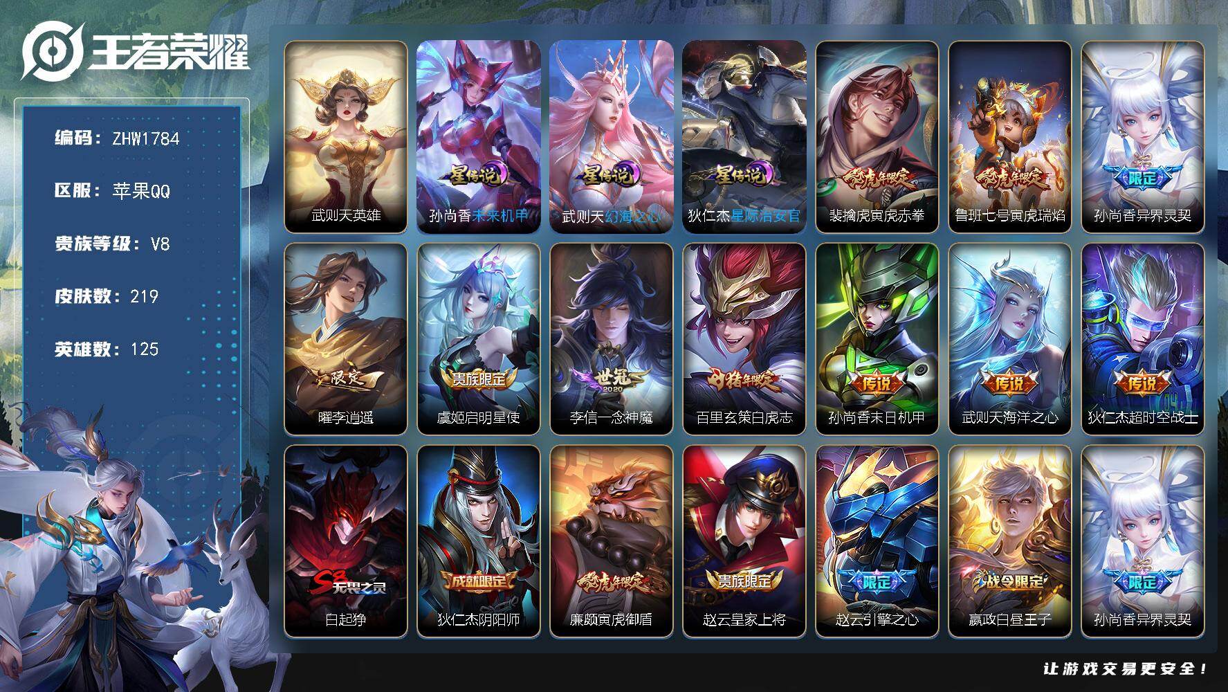 [14352169]可二次,【店主推荐捡漏号!可直接换绑】苹果Q-V8-荣耀黄金I段位-125英雄-219皮肤-1典藏英雄-10传说-64史诗 【荣耀典藏】:武则天英雄 【传说皮肤】:裴擒虎寅虎赤拳,鲁班七号寅虎瑞焰,孙尚香异界灵契,曜李逍遥 ,虞姬启明星使,李信一念神魔,百里玄策白虎志,孙尚香末日机甲,武则天海洋之心,狄仁杰超时空战士 【限定皮肤】:白起狰,狄仁杰阴阳师,廉颇寅虎御盾,赵云皇家上将,赵云引擎之心,嬴政白昼王子,孙尚香异界灵契,鲁班七号寅虎瑞焰,庄周高山流水,高渐离死亡摇滚,白起夜都怪侠,芈月重明,芈月幻夜卜梦,吕布猎兽之王,夏侯惇朔风刀,甄姬游园惊梦,曹操烛龙,典韦穷奇,马可波罗暗影游猎,狄仁杰魔术师,狄仁杰万华元夜,达摩沙漠行僧,项羽海滩派对,老夫子醍醐杖,程咬金演武夺筹,露娜一生所爱,韩信逐梦之影,韩信傲雪梅枪,兰陵王金庭之子,花木兰瑞麟志,孙悟空大圣娶亲,孙悟空孙行者,后羿圣弓游侠,李元芳银河之约,李元芳云中旅人,虞姬启明星使,钟馗驱傩正仪,干将莫邪真爱魔法,雅典娜单词大作战,蔡文姬繁星吟游,太乙真人饕餮,鬼谷子原初探秘者,鬼谷子五谷丰年,黄忠火炮绅士,铠青龙志,苏烈千军破阵,百里玄策白虎志,弈星混沌棋,沈梦溪星空之诺,沈梦溪大漠名商,明世隐疑决卦,明世隐吟游魔法,裴擒虎李小龙,裴擒虎寅虎赤拳,狂铁御狮,米莱狄御霄,云中君纤云弄巧,伽罗天狼溯光者,盾山御銮,猪八戒西部大镖客,上官婉儿天狼绘梦者,嫦娥拒霜思,曜李逍遥 ,蒙犽狂想玩偶喵,鲁班大师探海日志,镜匿光追影者,桑启海盐诗旅,艾琳女武神,鬼谷子天穹祈灯,刘邦剑破天穹,程咬金群星魔术团 【年限皮肤】:百里玄策白虎志,花木兰瑞麟志,铠青龙志,裴擒虎寅虎赤拳,鲁班七号寅虎瑞焰,廉颇寅虎御盾,马超神威 【赛季限定】:白起狰,芈月重明,夏侯惇朔风刀,曹操烛龙,典韦穷奇,狄仁杰万华元夜,达摩沙漠行僧,老夫子醍醐杖,程咬金演武夺筹,兰陵王金庭之子,李元芳云中旅人,钟馗驱傩正仪,太乙真人饕餮,鬼谷子原初探秘者,苏烈千军破阵,弈星混沌棋,沈梦溪大漠名商,明世隐疑决卦,狂铁御狮,米莱狄御霄,盾山御銮,鲁班大师探海日志,桑启海盐诗旅,鬼谷子天穹祈灯,刘邦剑破天穹 【战令限定】:嬴政白昼王子,白起夜都怪侠,芈月幻夜卜梦,吕布猎兽之王,马可波罗暗影游猎,后羿圣弓游侠,李元芳银河之约,干将莫邪真爱魔法,雅典娜单词大作战,黄忠火炮绅士,