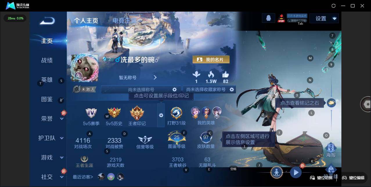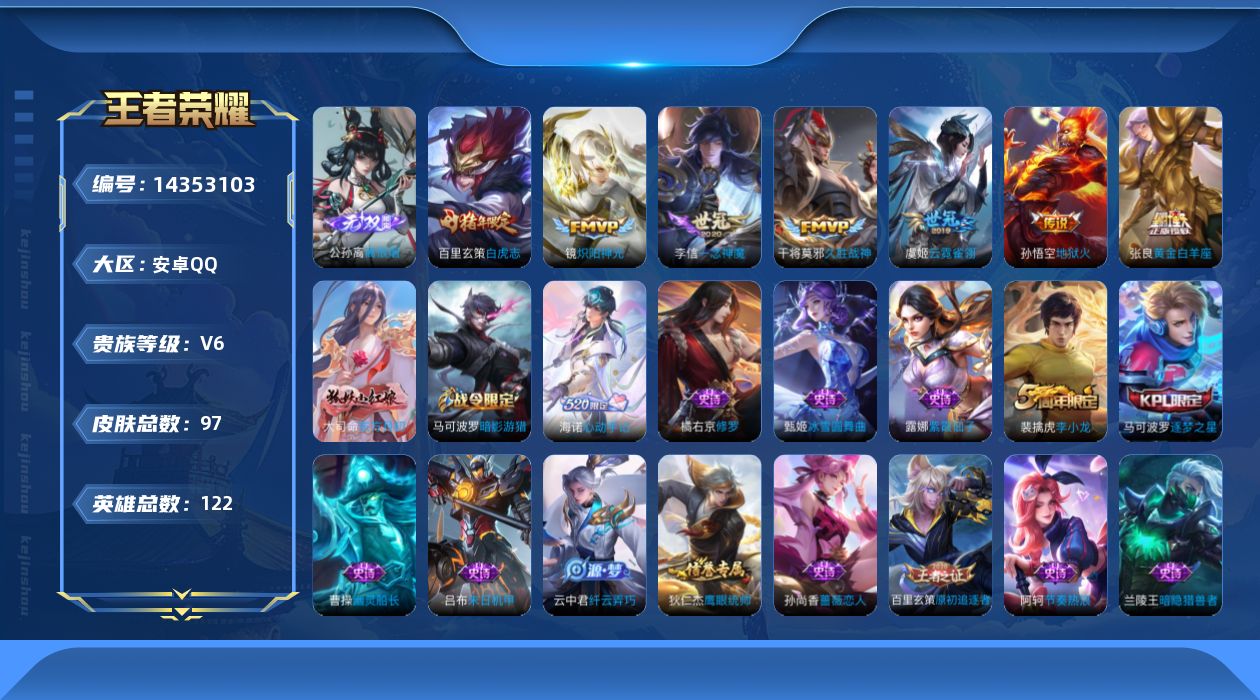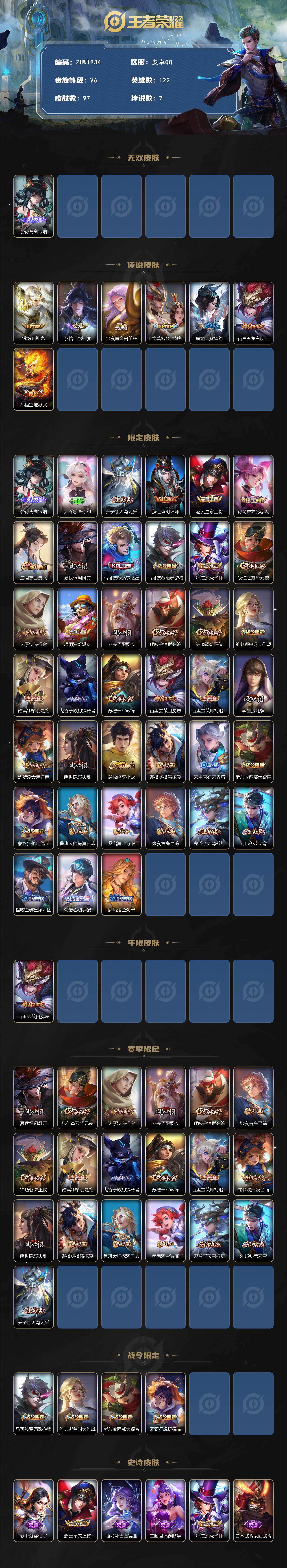 - PX_2085974-贵族等级: V5 英雄数: 117 皮肤数: 105 传说皮: 超时空战士-狄仁杰 限定皮: 武陵仙君,齐天大圣,鸣野蒿