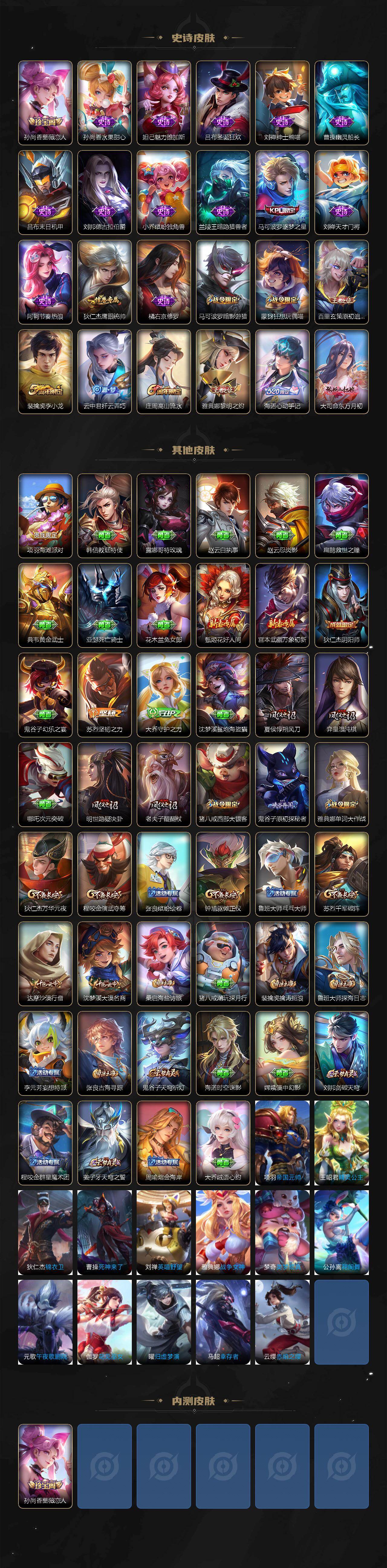 【史诗皮肤】:露娜紫霞仙子,赵云皇家上将,甄姬冰雪圆舞曲,王昭君偶像歌手,狄仁杰魔术师,宫本武藏鬼剑武藏,孙尚香蔷薇恋人,孙尚香水果甜心,妲己魅力维加斯,吕布圣诞狂欢,刘禅绅士熊喵,曹操幽灵船长,吕布末日机甲,刘邦德古拉伯爵,小乔缤纷独角兽,兰陵王暗隐猎兽者,马可波罗逐梦之星,刘禅天才门将,阿轲节奏热浪,狄仁杰鹰眼统帅,橘右京修罗,马可波罗暗影游猎,蒙犽狂想玩偶喵,百里玄策原初追逐者,裴擒虎李小龙,云中君纤云弄巧,庄周高山流水,雅典娜黎明之约,海诺心动手记,大司命东方月初