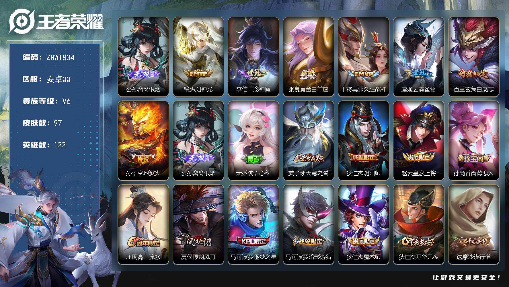 [14353103]【店主推荐捡漏号!可直接换绑】安卓Q-V6-永恒钻石IV段位-122英雄-97皮肤-1无双-7传说-30史诗 【英雄全皮】:海诺全皮 【无双皮肤】:公孙离离恨烟 【传说皮肤】:镜炽阳神光,李信一念神魔,张良黄金白羊座,干将莫邪久胜战神,虞姬云霓雀翎,百里玄策白虎志,孙悟空地狱火 【限定皮肤】:公孙离离恨烟,大乔绒语心约,姜子牙天穹之誓,狄仁杰阴阳师,赵云皇家上将,孙尚香蔷薇恋人,庄周高山流水,夏侯惇朔风刀,马可波罗逐梦之星,马可波罗暗影游猎,狄仁杰魔术师,狄仁杰万华元夜,达摩沙漠行僧,项羽海滩派对,老夫子醍醐杖,程咬金演武夺筹,钟馗驱傩正仪,雅典娜单词大作战,雅典娜黎明之约,鬼谷子原初探秘者,苏烈千军破阵,百里玄策白虎志,百里玄策原初追逐者,弈星混沌棋,沈梦溪大漠名商,明世隐疑决卦,裴擒虎李小龙,裴擒虎擒涛扼浪,云中君纤云弄巧,猪八戒西部大镖客,蒙犽狂想玩偶喵,鲁班大师探海日志,桑启海盐诗旅,张良古海寻踪,鬼谷子天穹祈灯,刘邦剑破天穹,程咬金群星魔术团,海诺心动手记,周瑜熔金海岸 【年限皮肤】:百里玄策白虎志 【赛季限定】:夏侯惇朔风刀,狄仁杰万华元夜,达摩沙漠行僧,老夫子醍醐杖,程咬金演武夺筹,张良古海寻踪,钟馗驱傩正仪,雅典娜黎明之约,鬼谷子原初探秘者,苏烈千军破阵,百里玄策原初追逐者,弈星混沌棋,沈梦溪大漠名商,明世隐疑决卦,裴擒虎擒涛扼浪,鲁班大师探海日志,桑启海盐诗旅,鬼谷子天穹祈灯,刘邦剑破天穹,姜子牙天穹之誓 【战令限定】:马可波罗暗影游猎,雅典娜单词大作战,猪八戒西部大镖客,蒙犽狂想玩偶喵 【史诗皮肤】:露娜紫霞仙子,赵云皇家上将,甄姬冰雪圆舞曲,王昭君偶像歌手,狄仁杰魔术师,宫本武藏鬼剑武藏,孙尚香蔷薇恋人,孙尚香水果甜心,妲己魅力维加斯,吕布圣诞狂欢,刘禅绅士熊喵,曹操幽灵船长,吕布末日机甲,刘邦德古拉伯爵,小乔缤纷独角兽,兰陵王暗隐猎兽者,马可波罗逐梦之星,刘禅天才门将,阿轲节奏热浪,狄仁杰鹰眼统帅,橘右京修罗,马可波罗暗影游猎,蒙犽狂想玩偶喵,百里玄策原初追逐者,裴擒虎李小龙,云中君纤云弄巧,庄周高山流水,雅典娜黎明之约,海诺心动手记,大司命东方月初 【其他皮肤】:项羽海滩派对,韩信教廷特使,露娜哥特玫瑰,赵云白执事,赵云忍炎影,扁鹊救世之瞳,典韦黄金武士,亚瑟死亡骑士,花木兰兔女郎,甄姬花好人间,宫本武藏万象初新,狄仁杰阴阳师,鬼谷子幻乐
