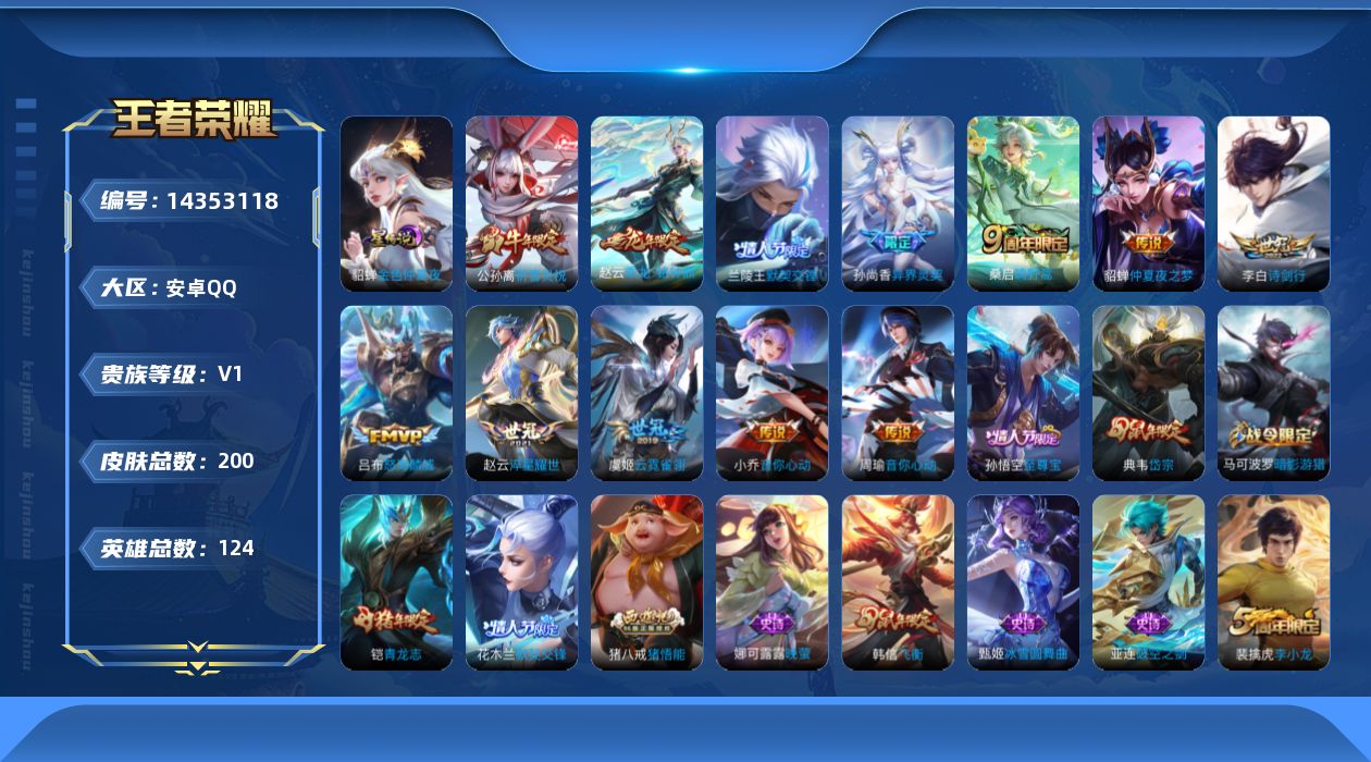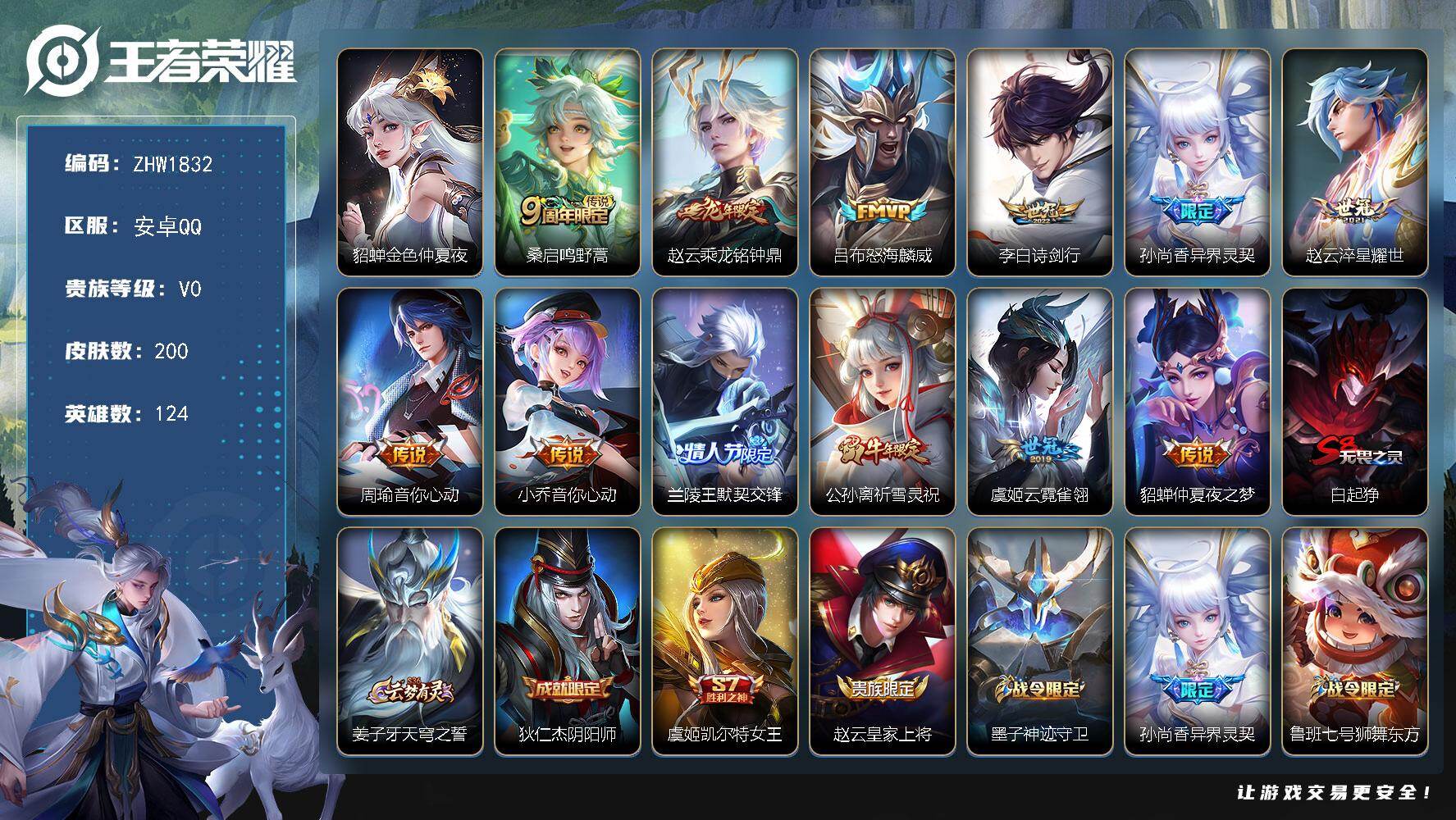 [14353118]可二次,【店主推荐捡漏号!可直接换绑】安卓Q-V0-尊贵铂金I段位-124英雄-200皮肤-1星传说-12传说-58史诗 【英雄全皮】:影全皮 【传说皮肤】:桑启鸣野蒿,赵云乘龙铭钟鼎,吕布怒海麟威,李白诗剑行,孙尚香异界灵契,赵云淬星耀世,周瑜音你心动,小乔音你心动,兰陵王默契交锋,公孙离祈雪灵祝,虞姬云霓雀翎,貂蝉仲夏夜之梦 【限定皮肤】:白起狰,姜子牙天穹之誓,狄仁杰阴阳师,虞姬凯尔特女王,赵云皇家上将,墨子神迹守卫,孙尚香异界灵契,鲁班七号狮舞东方,庄周高山流水,高渐离玩趣恶龙,钟无艳超时空战士,扁鹊炼金王,芈月重明,元歌无心,夏侯惇朔风刀,甄姬落雪兰心,曹操烛龙,典韦穷奇,典韦岱宗,马可波罗暗影游猎,狄仁杰魔术师,狄仁杰万华元夜,达摩星际陆战队,达摩沙漠行僧,项羽海滩派对,老夫子醍醐杖,老夫子航海奇遇记,程咬金演武夺筹,韩信飞衡,兰陵王默契交锋,兰陵王金庭之子,花木兰默契交锋,孙悟空至尊宝,牛魔御旌,后羿圣弓游侠,李元芳云中旅人,钟馗神迹守卫,钟馗驱傩正仪,干将莫邪真爱魔法,雅典娜单词大作战,雅典娜黎明之约,蔡文姬繁星吟游,太乙真人饕餮,鬼谷子原初探秘者,鬼谷子五谷丰年,铠青龙志,苏烈千军破阵,百里玄策原初追逐者,弈星混沌棋,梦奇顽趣,公孙离祈雪灵祝,沈梦溪大漠名商,明世隐疑决卦,裴擒虎李小龙,裴擒虎擒涛扼浪,狂铁御狮,米莱狄御霄,米莱狄胡桃异想国,云中君纤云弄巧,伽罗天狼溯光者,盾山御銮,猪八戒西部大镖客,猪八戒猪悟能,上官婉儿梁祝,嫦娥拒霜思,蒙犽狂想玩偶喵,桑启海盐诗旅,张良古海寻踪,鬼谷子天穹祈灯,赵云乘龙铭钟鼎,沈梦溪龙舞盛年,刘邦剑破天穹,镜青焰无极,项羽苍威无极,周瑜熔金海岸 【年限皮肤】:铠青龙志,公孙离祈雪灵祝,韩信飞衡,典韦岱宗,赵云乘龙铭钟鼎 【赛季限定】:扁鹊炼金王,白起狰,芈月重明,夏侯惇朔风刀,曹操烛龙,典韦穷奇,狄仁杰万华元夜,达摩沙漠行僧,老夫子醍醐杖,程咬金演武夺筹,兰陵王金庭之子,张良古海寻踪,牛魔御旌,李元芳云中旅人,虞姬凯尔特女王,钟馗驱傩正仪,雅典娜黎明之约,太乙真人饕餮,鬼谷子原初探秘者,苏烈千军破阵,百里玄策原初追逐者,弈星混沌棋,梦奇顽趣,沈梦溪大漠名商,明世隐疑决卦,裴擒虎擒涛扼浪,狂铁御狮,米莱狄御霄,盾山御銮,桑启海盐诗旅,鬼谷子天穹祈灯,刘邦剑破天穹,姜子牙天穹之誓 【战令限定】:墨子神迹守卫,鲁班
