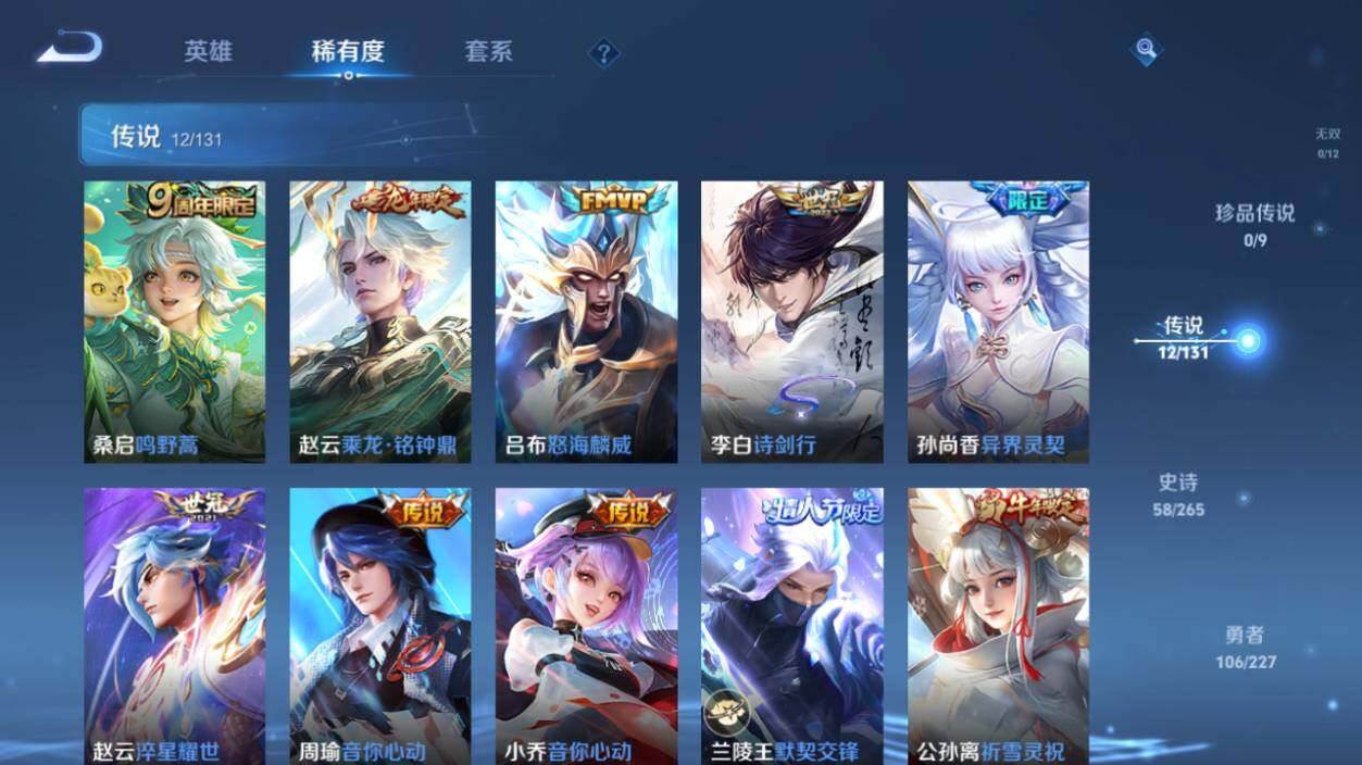 【传说皮肤】:桑启鸣野蒿,赵云乘龙铭钟鼎,吕布怒海麟威,李白诗剑行,孙尚香异界灵契,赵云淬星耀世,周瑜音你心动,小乔音你心动,兰陵王默契交锋,公孙离祈雪灵祝,虞姬云霓雀翎,貂蝉仲夏夜之梦