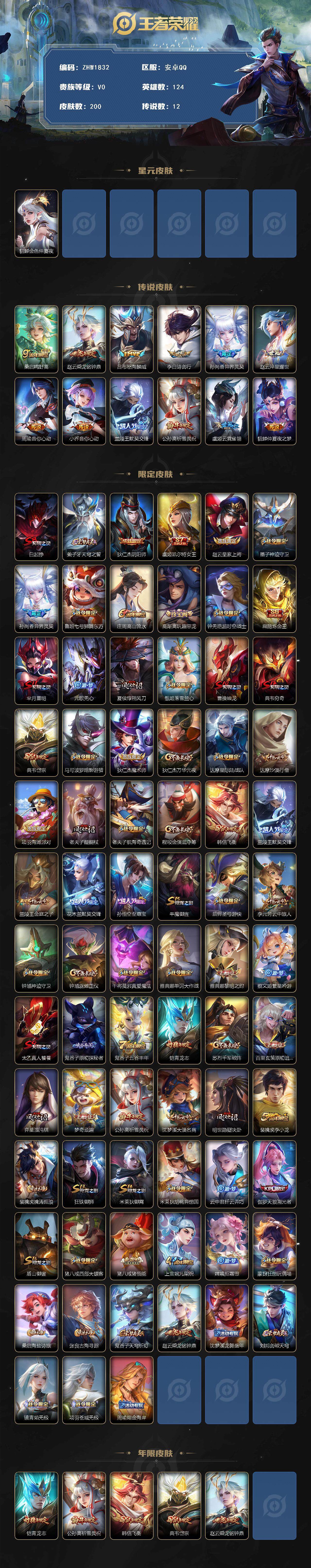 - [12022878]V8 3珍品传说 20传说 125英雄 220皮肤 典藏英雄武则天 可修改实名 优质装备:怪盗基德,朽木白哉,黑崎一护,冠军飞将,久胜战神,炽阳神光,一念神魔,云霓雀翎,末日机甲-孙尚香(绿蚂蚱),地狱火,海洋之心,音你心动-周瑜,乞巧织情,淬星耀世,花朝如约(花篮子),音你闪耀(rap皮),澜逐花归海 传说皮:祥瑞亨通 限定皮:鸣野蒿,至尊宝,凤求凰(白切鸡),凤凰于飞,武陵仙君(小桃花),飞衡(韩信年限),遇见飞天,武圣,游园惊梦,梁祝,天狼征服者,如梦令-后羿 史诗皮:鸭鸭历险记-刘禅,星界战将,龙之律动,石田雨龙,百相守梦-百里守约,紫霞仙子,苍穹之光,白龙吟,黄金分割率,特工魅影,千年之狐,蒙恬荣光圣徽,偶像歌手,龙骑士(小龙虾),暗夜猫娘,魅语,无限星赏官,晚萤,末日机甲-吕布,猫狗日记-孙策,修罗,摇滚巨星,水果甜心,天才门将,心灵骇客,鬼剑武藏,乐园奇幻夜,天秀·启明,舞动绿茵,繁星吟游(呼啦呼啦),缤纷独角兽,乘风破浪,逐浪之夏,水晶猎龙者,曙光守护者,箭羽风息,金属风暴,原初追逐者,圣诞狂欢,圣诞恋歌,鹰眼统帅,王者之锤,魅力维加斯,顽趣-阿古朵