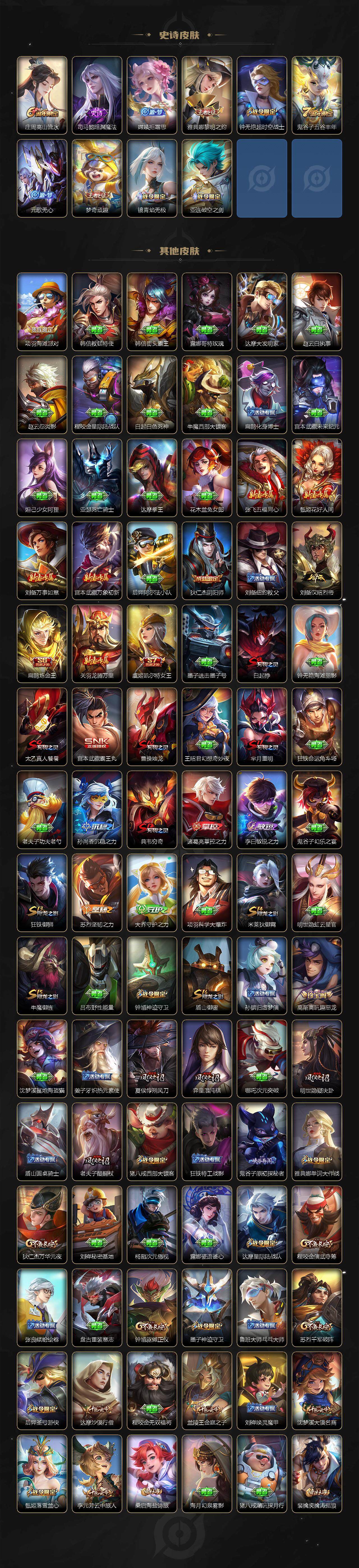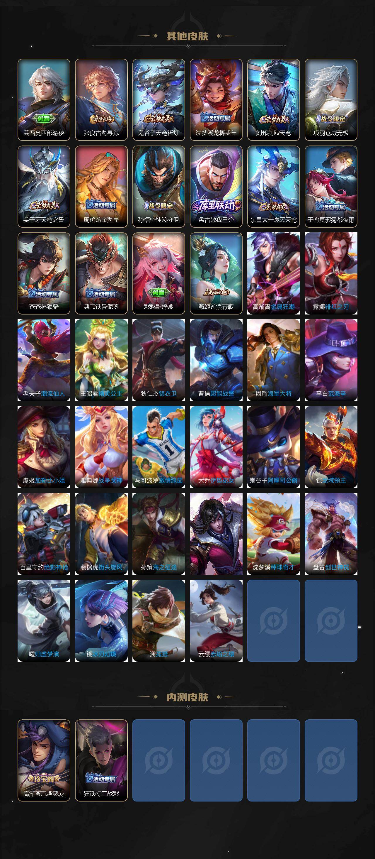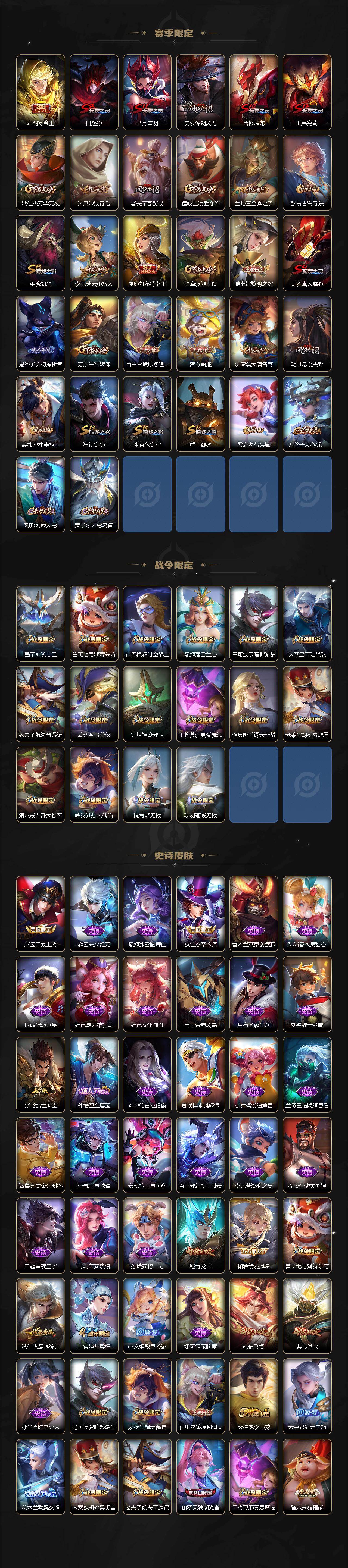 【限定皮肤】:白起狰,姜子牙天穹之誓,狄仁杰阴阳师,虞姬凯尔特女王,赵云皇家上将,墨子神迹守卫,孙尚香异界灵契,鲁班七号狮舞东方,庄周高山流水,高渐离玩趣恶龙,钟无艳超时空战士,扁鹊炼金王,芈月重明,元歌无心,夏侯惇朔风刀,甄姬落雪兰心,曹操烛龙,典韦穷奇,典韦岱宗,马可波罗暗影游猎,狄仁杰魔术师,狄仁杰万华元夜,达摩星际陆战队,达摩沙漠行僧,项羽海滩派对,老夫子醍醐杖,老夫子航海奇遇记,程咬金演武夺筹,韩信飞衡,兰陵王默契交锋,兰陵王金庭之子,花木兰默契交锋,孙悟空至尊宝,牛魔御旌,后羿圣弓游侠,李元芳云中旅人,钟馗神迹守卫,钟馗驱傩正仪,干将莫邪真爱魔法,雅典娜单词大作战,雅典娜黎明之约,蔡文姬繁星吟游,太乙真人饕餮,鬼谷子原初探秘者,鬼谷子五谷丰年,铠青龙志,苏烈千军破阵,百里玄策原初追逐者,弈星混沌棋,梦奇顽趣,公孙离祈雪灵祝,沈梦溪大漠名商,明世隐疑决卦,裴擒虎李小龙,裴擒虎擒涛扼浪,狂铁御狮,米莱狄御霄,米莱狄胡桃异想国,云中君纤云弄巧,伽罗天狼溯光者,盾山御銮,猪八戒西部大镖客,猪八戒猪悟能,上官婉儿梁祝,嫦娥拒霜思,蒙犽狂想玩偶喵,桑启海盐诗旅,张良古海寻踪,鬼谷子天穹祈灯,赵云乘龙铭钟鼎,沈梦溪龙舞盛年,刘邦剑破天穹,镜青焰无极,项羽苍威无极,周瑜熔金海岸