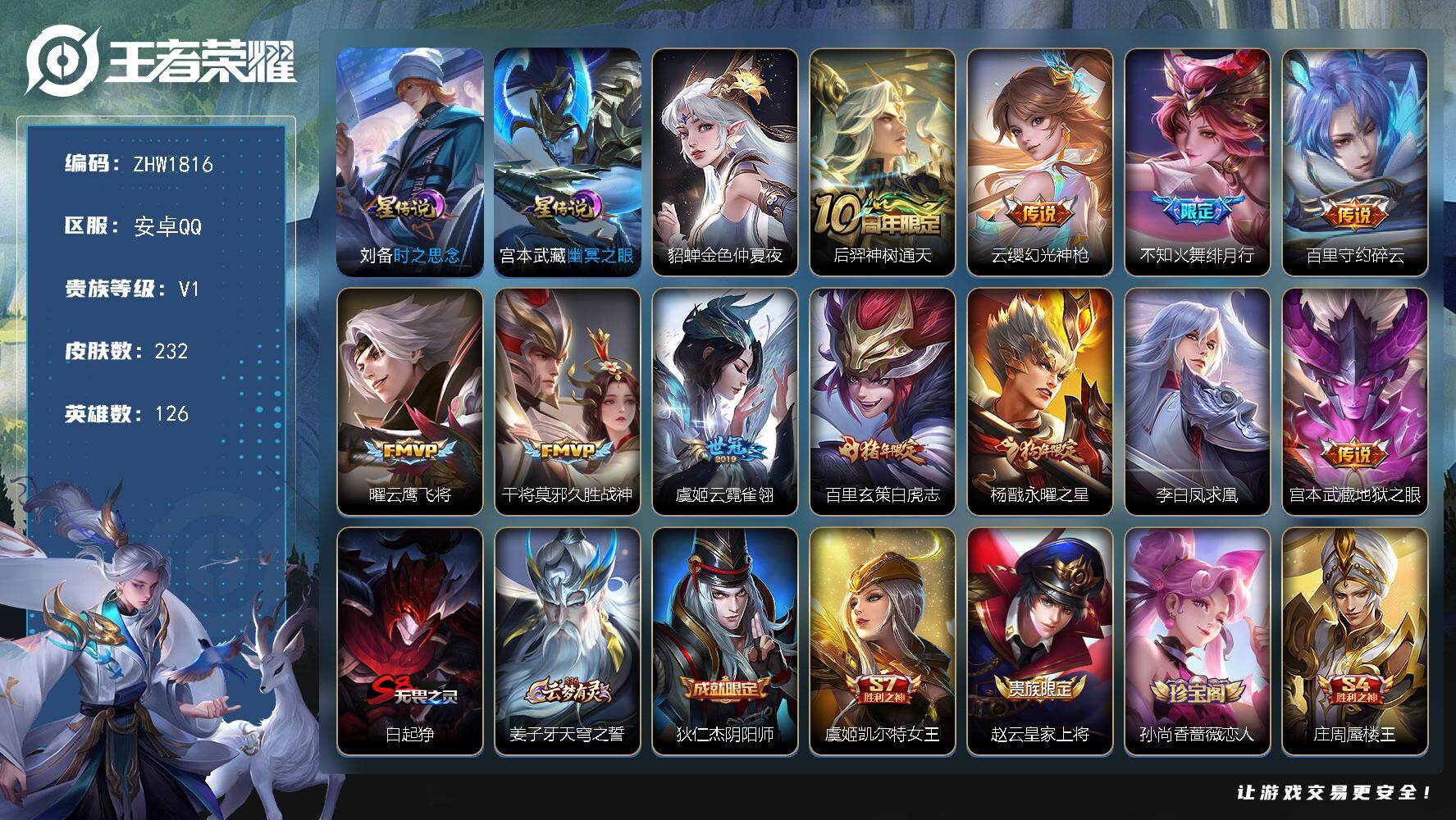 [14353309]可二次【店主推荐捡漏号!可直接换绑】发育路33段,安卓Q-V1-最强王者段位-126英雄-232皮肤-3星传说-11传说-49史诗 【英雄全皮】:鬼谷子全皮 【传说皮肤】:后羿神树通天,云缨幻光神枪,不知火舞绯月行,百里守约碎云,曜云鹰飞将,干将莫邪久胜战神,虞姬云霓雀翎,百里玄策白虎志,杨戬永曜之星,李白凤求凰,宫本武藏地狱之眼 【限定皮肤】:白起狰,姜子牙天穹之誓,狄仁杰阴阳师,虞姬凯尔特女王,赵云皇家上将,孙尚香蔷薇恋人,庄周蜃楼王,庄周高山流水,孙膑妖精王,扁鹊炼金王,元歌无心,夏侯惇朔风刀,甄姬游园惊梦,曹操烛龙,典韦穷奇,狄仁杰魔术师,狄仁杰万华元夜,达摩沙漠行僧,项羽海滩派对,老夫子醍醐杖,程咬金演武夺筹,兰陵王金庭之子,不知火舞绯月行,孙悟空至尊宝,牛魔御旌,李元芳云中旅人,钟馗驱傩正仪,杨玉环遇见飞天,杨戬永曜之星,干将莫邪胡桃夹子,雅典娜单词大作战,雅典娜黎明之约,太乙真人饕餮,鬼谷子原初探秘者,鬼谷子五谷丰年,苏烈千军破阵,百里玄策白虎志,百里玄策原初追逐者,弈星混沌棋,梦奇顽趣,沈梦溪大漠名商,明世隐疑决卦,裴擒虎李小龙,裴擒虎擒涛扼浪,狂铁御狮,米莱狄御霄,盾山御銮,上官婉儿梁祝,蒙犽狂想玩偶喵,鲁班大师探海日志,桑启海盐诗旅,阿古朵江河有灵,张良古海寻踪,蒙恬荣光圣徽,鬼谷子天穹祈灯,沈梦溪龙舞盛年,刘邦剑破天穹,程咬金群星魔术团 【年限皮肤】:百里玄策白虎志,李白凤求凰,杨戬永曜之星 【赛季限定】:庄周蜃楼王,孙膑妖精王,扁鹊炼金王,白起狰,夏侯惇朔风刀,曹操烛龙,典韦穷奇,狄仁杰万华元夜,达摩沙漠行僧,老夫子醍醐杖,程咬金演武夺筹,兰陵王金庭之子,张良古海寻踪,牛魔御旌,李元芳云中旅人,虞姬凯尔特女王,钟馗驱傩正仪,雅典娜黎明之约,太乙真人饕餮,鬼谷子原初探秘者,苏烈千军破阵,百里玄策原初追逐者,弈星混沌棋,梦奇顽趣,沈梦溪大漠名商,明世隐疑决卦,裴擒虎擒涛扼浪,狂铁御狮,米莱狄御霄,盾山御銮,鲁班大师探海日志,桑启海盐诗旅,鬼谷子天穹祈灯,蒙恬荣光圣徽,刘邦剑破天穹,姜子牙天穹之誓 【战令限定】:雅典娜单词大作战,蒙犽狂想玩偶喵 【史诗皮肤】:阿轲暗夜猫娘,赵云皇家上将,赵云未来纪元,甄姬冰雪圆舞曲,王昭君偶像歌手,狄仁杰魔术师,宫本武藏鬼剑武藏,孙尚香蔷薇恋人,孙尚香水果甜心,嬴政摇滚巨星,妲己魅力维加斯,妲己女仆咖啡,墨子金属