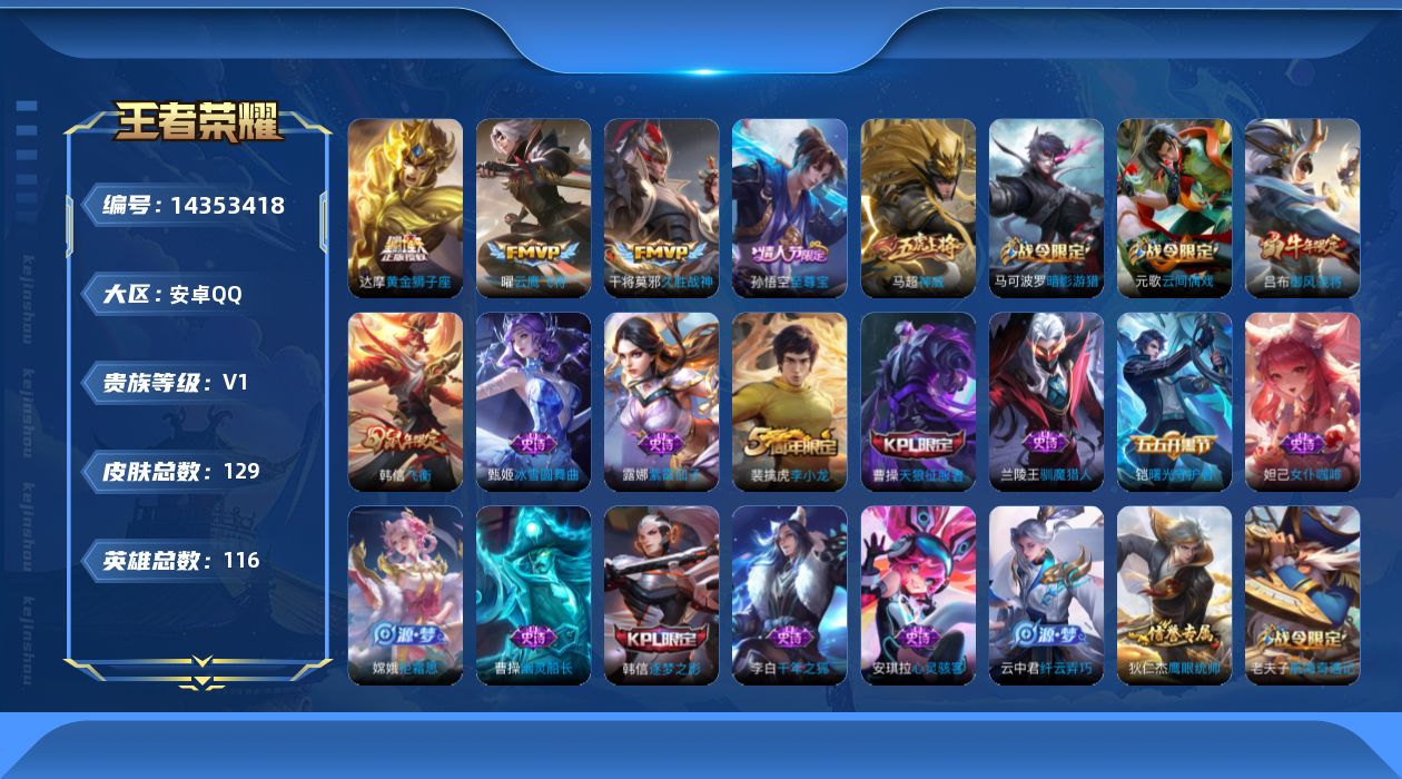 [14353418]可二次,【店主推荐捡漏号!可直接换绑】安卓Q-V0-尊贵铂金II段位-116英雄-129皮肤-3传说-40史诗 【传说皮肤】:曜云鹰飞将,干将莫邪久胜战神,达摩黄金狮子座 【限定皮肤】:狄仁杰阴阳师,赵云皇家上将,墨子神迹守卫,孙尚香蔷薇恋人,阿轲迷踪丽影,吕布御风骁将,周瑜赤莲之焰,元歌云间偶戏,夏侯惇朔风刀,曹操天狼征服者,马可波罗暗影游猎,狄仁杰魔术师,狄仁杰万华元夜,达摩星际陆战队,项羽海滩派对,老夫子醍醐杖,老夫子航海奇遇记,程咬金演武夺筹,刘邦夺宝奇兵,韩信逐梦之影,韩信飞衡,兰陵王驯魔猎人,亚瑟潮玩骑士王,孙悟空至尊宝,李元芳银河之约,钟馗驱傩正仪,雅典娜黎明之约,蔡文姬繁星吟游,鬼谷子原初探秘者,苏烈千军破阵,百里玄策原初追逐者,弈星混沌棋,沈梦溪星空之诺,明世隐疑决卦,裴擒虎李小龙,米莱狄胡桃异想国,云中君纤云弄巧,猪八戒西部大镖客,上官婉儿梁祝,嫦娥拒霜思 【年限皮肤】:吕布御风骁将,韩信飞衡,马超神威 【赛季限定】:夏侯惇朔风刀,狄仁杰万华元夜,老夫子醍醐杖,程咬金演武夺筹,钟馗驱傩正仪,雅典娜黎明之约,鬼谷子原初探秘者,苏烈千军破阵,百里玄策原初追逐者,弈星混沌棋,明世隐疑决卦 【战令限定】:墨子神迹守卫,阿轲迷踪丽影,周瑜赤莲之焰,元歌云间偶戏,马可波罗暗影游猎,达摩星际陆战队,老夫子航海奇遇记,刘邦夺宝奇兵,兰陵王驯魔猎人,亚瑟潮玩骑士王,李元芳银河之约,沈梦溪星空之诺,米莱狄胡桃异想国,猪八戒西部大镖客 【史诗皮肤】:露娜紫霞仙子,赵云皇家上将,貂蝉圣诞恋歌,甄姬冰雪圆舞曲,王昭君偶像歌手,狄仁杰魔术师,孙尚香蔷薇恋人,妲己女仆咖啡,墨子金属风暴,吕布圣诞狂欢,曹操幽灵船长,李白千年之狐,张飞乱世虎臣,韩信白龙吟,孙悟空至尊宝,刘邦德古拉伯爵,韩信逐梦之影,诸葛亮黄金分割率,安琪拉心灵骇客,铠曙光守护者,狄仁杰鹰眼统帅,兰陵王驯魔猎人,上官婉儿梁祝,曹操天狼征服者,蔡文姬繁星吟游,李元芳银河之约,韩信飞衡,阿轲迷踪丽影,马超神威,马可波罗暗影游猎,百里玄策原初追逐者,裴擒虎李小龙,云中君纤云弄巧,元歌云间偶戏,吕布御风骁将,米莱狄胡桃异想国,老夫子航海奇遇记,杨戬天秀启明,嫦娥拒霜思,雅典娜黎明之约 【其他皮肤】:项羽海滩派对,韩信教廷特使,韩信街头霸王,露娜哥特玫瑰,达摩大发明家,赵云忍炎影,程咬金星际陆战队,白起白色死神,扁鹊化身