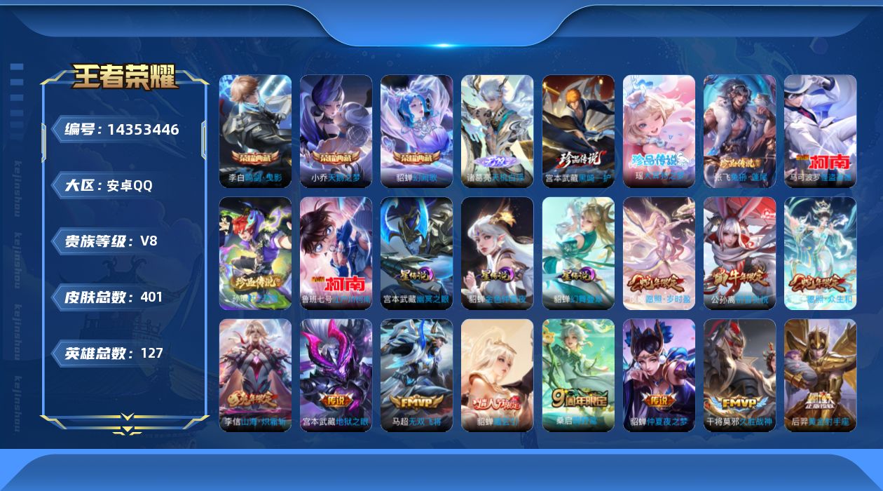 [14353446]可二次,【店主推荐捡漏号!可直接换绑】安卓Q-V8-最强王者段位-127英雄-401皮肤-3典藏皮肤-1无双-6珍品传说-3星传说-17传说-110史诗 【英雄全皮】:刘禅全皮,阿轲全皮,孙权全皮,鬼谷子全皮,蒙恬全皮,戈娅全皮,空空儿全皮,影全皮 【荣耀典藏】:小乔天鹅之梦,李白鸣剑曳影,貂蝉幻阙歌 【无双皮肤】:诸葛亮天机白泽 【珍品传说】:马可波罗怪盗基德,鲁班七号江户川柯南,孙策时之奇旅,张飞兔狲蓬尾,瑶大耳狗之梦,宫本武藏黑崎一护 【传说皮肤】:后羿神树通天,妲己愿照众生和,虞姬愿照岁时盈,嬴政玄雷天君,桑启鸣野蒿,貂蝉曦玄引,李信山海炽霜斩,马超无双飞将,公孙离祈雪灵祝,虞姬启明星使,刘备时之恋人,貂蝉猫影幻舞,干将莫邪久胜战神,后羿黄金射手座,貂蝉仲夏夜之梦,宫本武藏地狱之眼,狄仁杰超时空战士 【限定皮肤】:白起狰,蒙犽顽岩魄,蔡文姬夏日便利店,大乔绒语心约,姜子牙天穹之誓,狄仁杰阴阳师,虞姬凯尔特女王,赵云皇家上将,妲己时之奇旅,孙尚香蔷薇恋人,庄周蜃楼王,庄周玄嵩,高渐离玩趣恶龙,阿轲迷踪丽影,钟无艳超时空战士,孙膑妖精王,扁鹊炼金王,元歌云间偶戏,元歌无心,夏侯惇朔风刀,甄姬游园惊梦,甄姬落雪兰心,典韦穷奇,狄仁杰魔术师,狄仁杰万华元夜,达摩星际陆战队,达摩沙漠行僧,项羽海滩派对,老夫子醍醐杖,关羽冰锋战神,貂蝉逐梦之音,程咬金演武夺筹,韩信傲雪梅枪,兰陵王金庭之子,亚瑟潮玩骑士王,孙悟空至尊宝,孙悟空大圣娶亲,牛魔御旌,李元芳银河之约,李元芳云中旅人,虞姬启明星使,钟馗驱傩正仪,杨戬潮玩骑兵,干将莫邪真爱魔法,雅典娜黎明之约,太乙真人饕餮,鬼谷子原初探秘者,鬼谷子五谷丰年,苏烈千军破阵,百里玄策原初追逐者,弈星混沌棋,梦奇顽趣,公孙离祈雪灵祝,沈梦溪大漠名商,裴擒虎李小龙,裴擒虎擒涛扼浪,狂铁御狮,米莱狄御霄,米莱狄胡桃异想国,瑶山海碧波行,云中君纤云弄巧,李信山海炽霜斩,伽罗天狼溯光者,盾山御銮,上官婉儿梁祝,嫦娥拒霜思,嫦娥暖冬兔眠,西施玲珑珍味,西施至美乘鲤谣,蒙犽狂想玩偶喵,鲁班大师探海日志,桑启海盐诗旅,暃星界游侠,戈娅驭风魔法,艾琳流音漫舞,司空震地狱燃心,阿古朵江河有灵,张良古海寻踪,蒙犽百解令,蒙恬荣光圣徽,高渐离燃音魔法,妲己灵卜魔法,鬼谷子天穹祈灯,伽罗琥珀纪元,貂蝉曦玄引,沈梦溪龙舞盛年,鲁班七号蔬乡物语,李元芳蔬乡物语