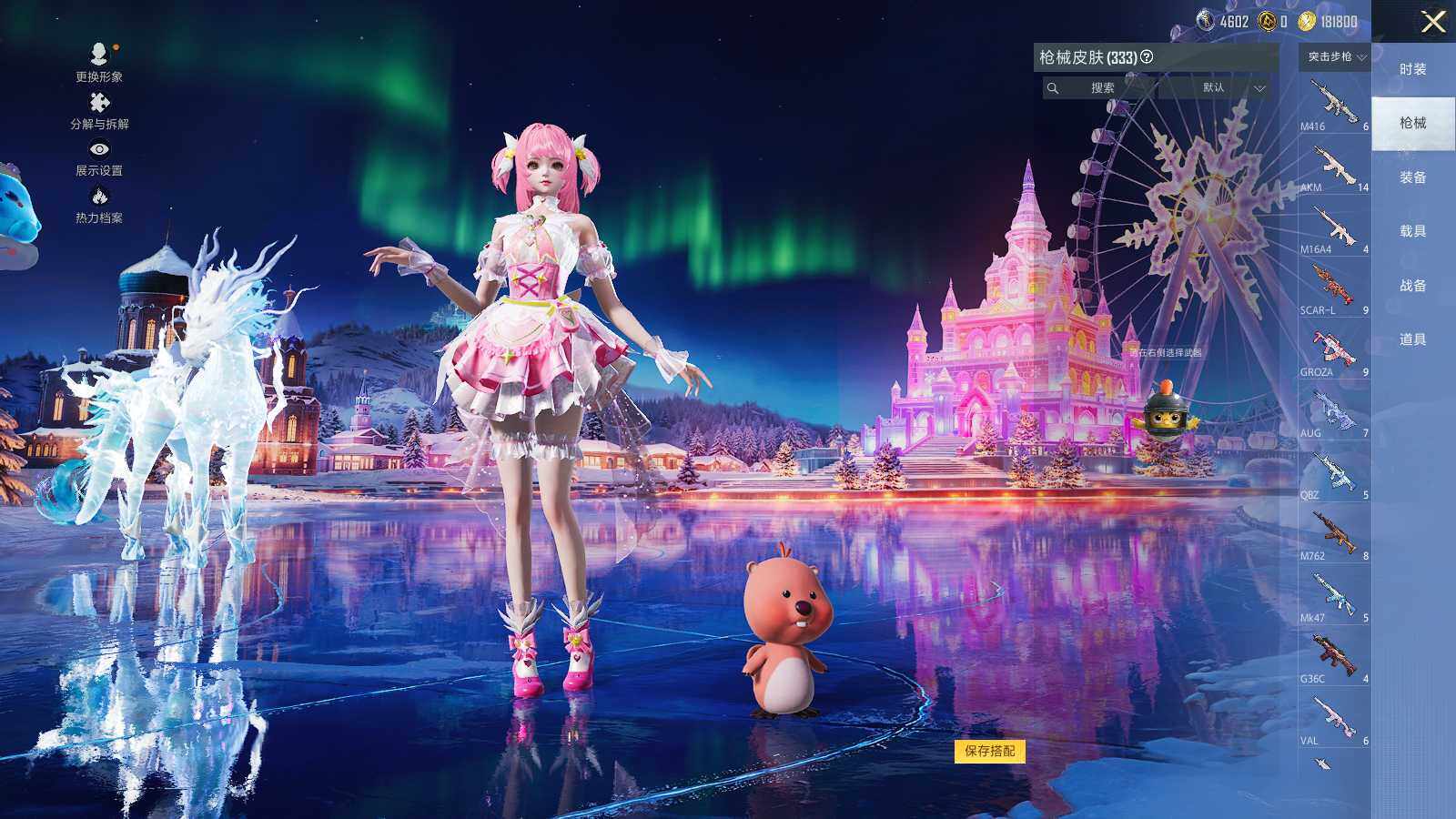 AKM-白勺歌姬,AKM-绿萝繁花,SCAR-L-童趣迷兔,SCAR-L-青春物语,M416-风花雪月,GROZA-旋转彩虹,AUG-星梦奇缘,Vector-飒粉甜心,P90-甜蜜草莓,Kar98K-巳巳如意,Mk14-闲梦青缨,Mk14-精灵梦叶罗丽,MG3-洛神天依,平底锅-仲夏莫吉托,烟雾弹-猫咪绅士