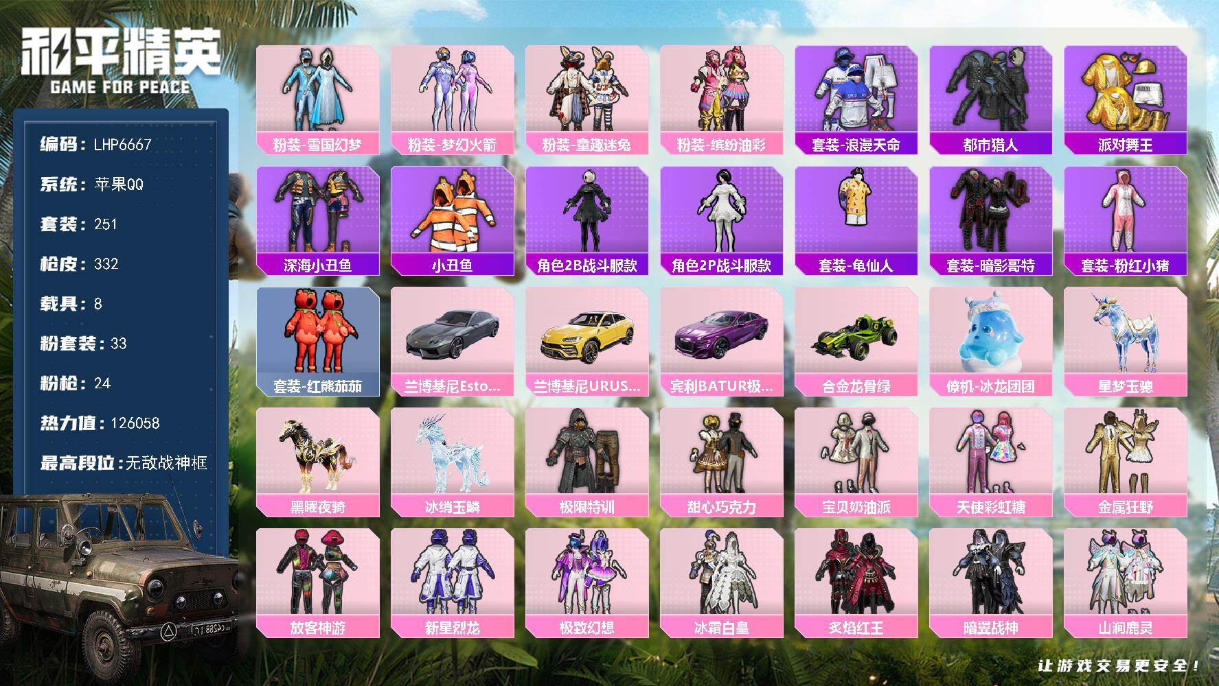 [14353608]【店主推荐捡漏号!可直接换绑】/素材身法号/无敌战神框1/绝世印记1/地铁满天赋 苹果 手Q-无敌战神框-33粉装-24特效枪-8载具-13粉色飞行器-12.6w热力值-19王牌印记-251套装-332枪皮【热门品类】:粉装-雪国幻梦,粉装-梦幻火箭,粉装-童趣迷兔,粉装-缤纷油彩,套装-浪漫天命,套装-都市猎人,套装-派对舞王,套装-深海小丑鱼,套装-小丑鱼,角色-2B战斗服款,角色-2P战斗服款,套装-龟仙人,套装-暗影哥特,套装-粉红小猪,套装-红熊茄茄【粉色载具】:兰博基尼Estoque(银翼灰),兰博基尼URUS(明艳黄),宾利BATUR(极速紫),合金龙骨(绿),僚机-冰龙团团,星梦玉骢,黑曜夜骑,冰绡玉鳞【粉色套装】:粉装-极限特训,粉装-甜心巧克力,粉装-宝贝奶油派,粉装-天使彩虹糖,粉装-雪国幻梦,粉装-梦幻火箭,粉装-金属狂野,粉装-缤纷油彩,粉装-放客神游,粉装-新星烈龙,粉装-极致幻想,粉装-冰霜白皇,粉装-童趣迷兔,粉装-炙焰红王,粉装-暗翼战神,粉装-山涧鹿灵,粉装-沙场疾风,粉装-吟月归客,粉装-碧影闪光,粉装-甜梦小狐,粉装-暖熊萌萌,粉装-垂柳戏鸭,粉装-灵感创作师,粉装-冰川幽秘,粉装-第五大道,角色-呆萌星弥,角色-小蓝,角色-电磁星,粉装-金丰海韵,角色-月影灵韵,角色-荧海星豚,角色-奇迹舞步 美琪,角色-奇迹舞步 美雪【粉色枪皮等级】:AKM-白勺歌姬(七级),AKM-绿萝繁花(五级),SCAR-L-童趣迷兔(七级),SCAR-L-青春物语(六级),SCAR-L-魔童闹海 哪吒(三级),M416-风花雪月(七级),M416-灵猫魔法师(三级),GROZA-旋转彩虹(七级),AUG-星梦奇缘(三级),蜜獾-荧海星豚(二级),UMP45-宁雨蝶(三级),Vector-飒粉甜心(四级),汤姆逊-热量炸弹(五级),AKS-74U-无垠阁(三级),P90-甜蜜草莓(三级),Kar98K-巳巳如意(五级),Mk14-精灵梦叶罗丽(四级),DP-28-豹影疾电(五级),MG3-洛神天依(六级),平底锅-仲夏莫吉托(一级),平底锅-喜羊羊与灰太狼(二级),破片手榴弹-美味星星糖(五级)【粉色飞行器】:梦幻火箭飞行器,神秘黑猫飞行器,相思残雪飞行器,齐天大圣飞行器,千面幻镜飞行器,夜幕颂歌飞行器,绝色倾城飞行器,星空武士飞行器,灵猫魔法师