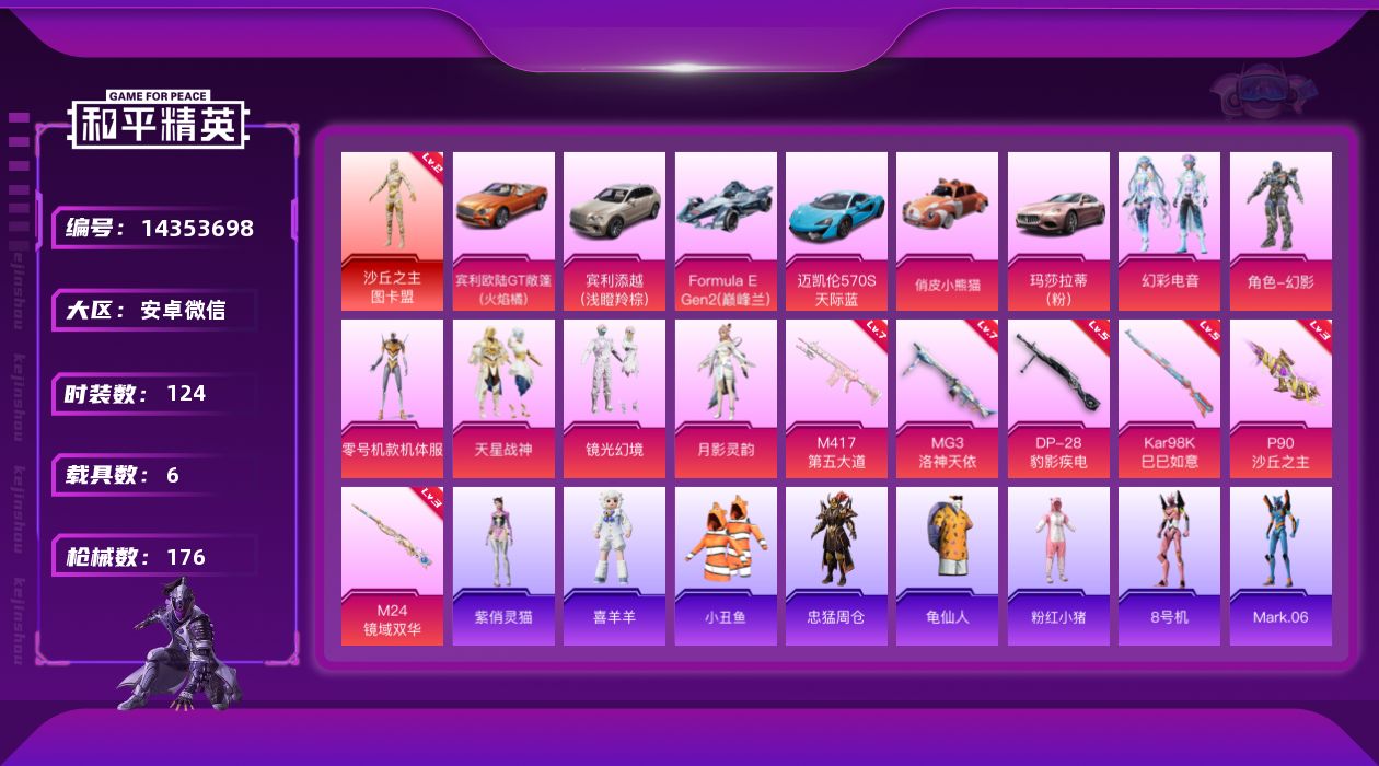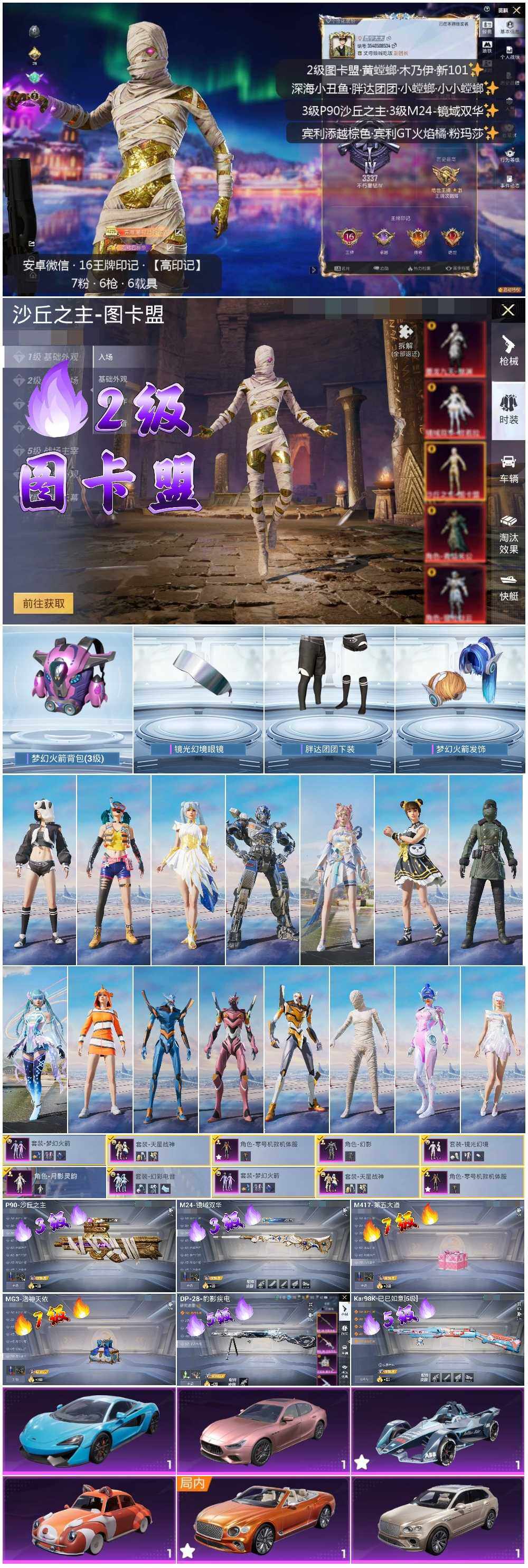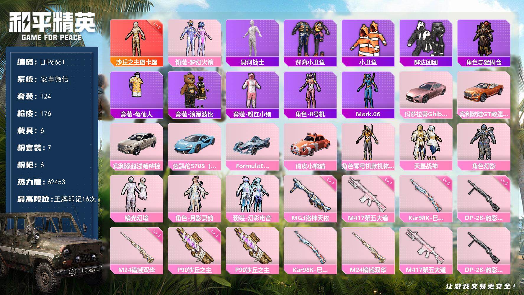[14353698]可二次【店主推荐捡漏号!可直接换绑】/素材身法号/老木乃伊/绝世印记12 安卓 微信-1神装-7粉装-6特效枪-6载具-8粉色飞行器-6.2w热力值-16王牌印记-124套装-176枪皮【红色神装等级】:沙丘之主-图卡盟(二级)【热门品类】:粉装-梦幻火箭,套装-冥河战士,套装-深海小丑鱼,套装-小丑鱼,套装-胖达团团,角色-忠猛周仓,套装-龟仙人,套装-浪漫波比,套装-粉红小猪,角色-8号机,角色-Mark.06【粉色载具】:玛莎拉蒂Ghibli(粉),宾利欧陆GT敞篷(火焰橘),宾利添越(浅瞪羚棕),迈凯伦570S(天际蓝),Formula E Gen2(巅峰兰),俏皮小熊猫【粉色套装】:粉装-梦幻火箭,角色-零号机款机体服,粉装-天星战神,角色-幻影,粉装-镜光幻境,角色-月影灵韵,粉装-幻彩电音【粉色枪皮等级】:P90-沙丘之主(三级),Kar98K-巳巳如意(五级),M24-镜域双华(三级),M417-第五大道(七级),DP-28-豹影疾电(五级),MG3-洛神天依(七级)【粉色飞行器】:酣梦熊熊飞行器,镜光幻境飞行翼,沙丘之主天马,镜域双华-灵镜之阶,龙翔九天飞行器,极意拳锋飞行器