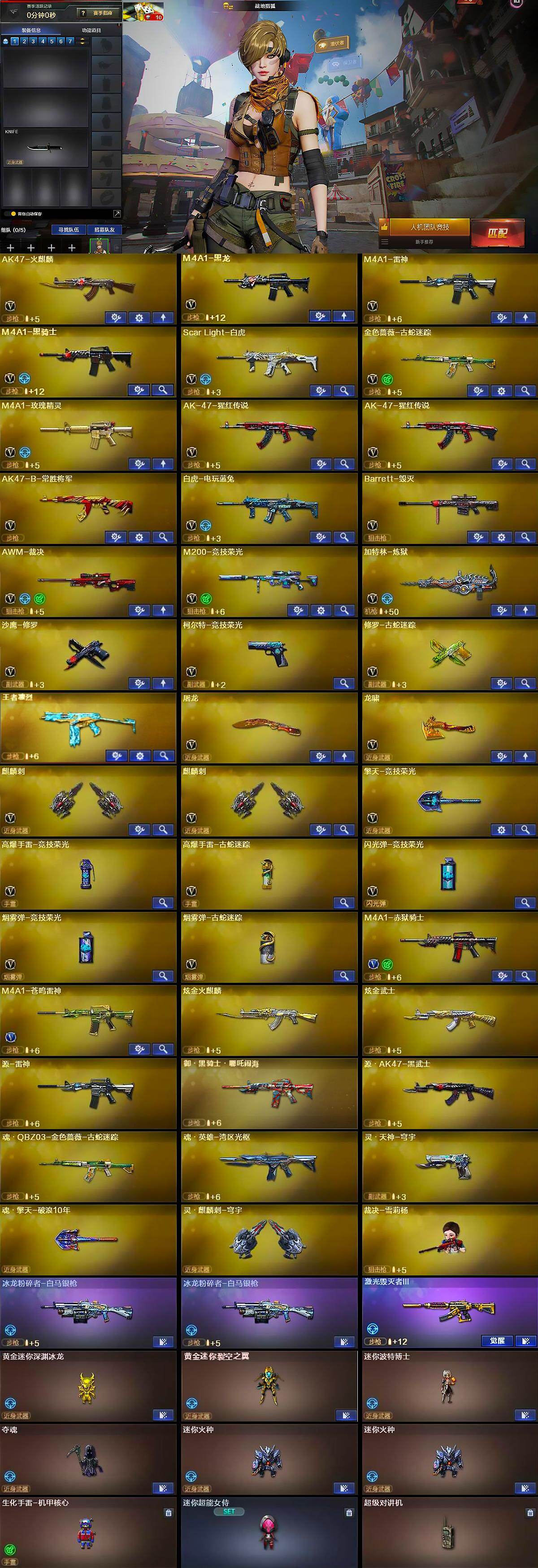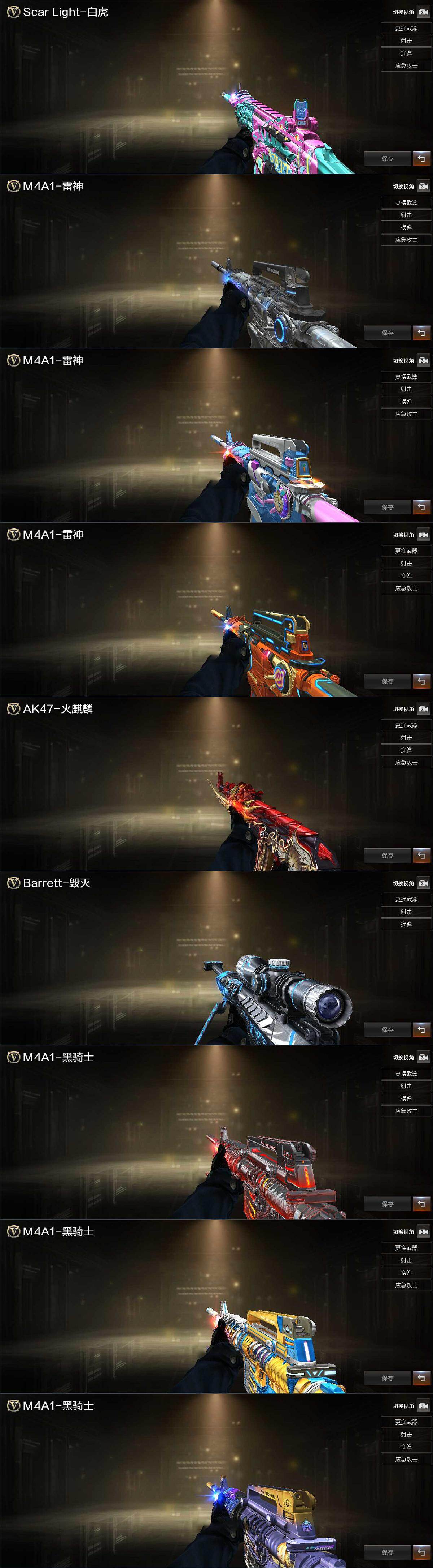 【英雄级武器】:AK47-火麒麟,M4A1-黑龙,M4A1-雷神,M4A1-黑骑士,Scar Light-白虎,金色蔷薇-古蛇迷踪,M4A1-玫瑰精灵,AK-47-猩红传说*2,AK47-B-常胜将军,白虎-电玩蓝兔,Barrett-毁灭,AWM-裁决,M200-竞技荣光,加特林-炼狱,沙鹰-修罗,柯尔特-竞技荣光,修罗-古蛇迷踪,屠龙,龙啸,麒麟刺*2,擎天-竞技荣光,高爆手雷-竞技荣光,高爆手雷-古蛇迷踪,闪光弹-竞技荣光,烟雾弹-竞技荣光,烟雾弹-古蛇迷踪,M4A1-赤狱骑士,M4A1-苍鸣雷神