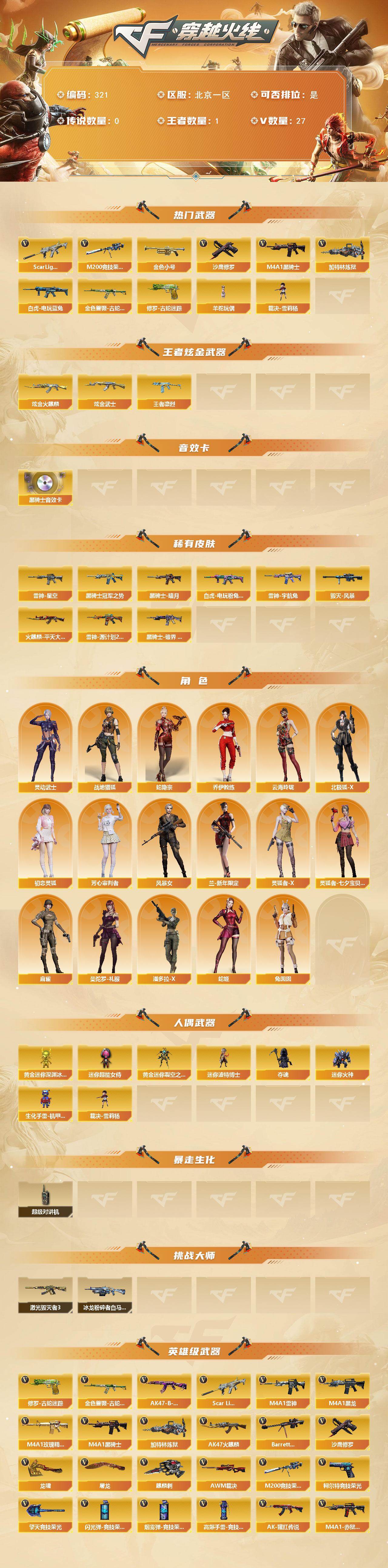 [14355238]北京一区-27V-1王者-2炫金 【热门武器】:Scar Light-白虎,金色蔷薇-古蛇迷踪,修罗-古蛇迷踪,M200-竞技荣光,白虎-电玩蓝兔,金色小号,M4A1-黑骑士,加特林-炼狱,羊驼玩偶,裁决-雪莉杨,沙鹰-修罗 【王者炫金武器】:王者凛烈,炫金火麒麟,炫金武士 【音效卡】:M4A1-黑骑士音效卡 【皮肤】:白虎-电玩粉兔皮肤,雷神-星空,雷神-宇航兔皮肤,雷神-源计划2.0专属 皮肤,火麒麟-平天大圣*2,毁灭-风暴,黑骑士-暗月,黑骑士-冠军之势,黑骑士-破界 皮肤 【角色】:战地猎狐,蛇隐宗,乔伊教练,云海玲珑,北极狐-X,初恋灵狐,芳心审判者,风暴女,兰-新年限定,灵动武士,灵狐者-X,灵狐者-七夕宝贝,麻雀,曼陀罗-礼服,潘多拉-X,蛇姬,兔囡囡 【人偶武器】:裁决-雪莉杨,黄金迷你深渊冰龙,黄金迷你裂空之翼,迷你波特博士,夺魂,迷你火种*2,生化手雷-机甲核心,迷你超能女侍 【暴走生化】:超级对讲机 【挑战大师】:冰龙粉碎者-白马银枪*2,激光毁灭者III 【英雄级武器】:AK47-火麒麟,M4A1-黑龙,M4A1-雷神,M4A1-黑骑士,Scar Light-白虎,金色蔷薇-古蛇迷踪,M4A1-玫瑰精灵,AK-47-猩红传说*2,AK47-B-常胜将军,白虎-电玩蓝兔,Barrett-毁灭,AWM-裁决,M200-竞技荣光,加特林-炼狱,沙鹰-修罗,柯尔特-竞技荣光,修罗-古蛇迷踪,屠龙,龙啸,麒麟刺*2,擎天-竞技荣光,高爆手雷-竞技荣光,高爆手雷-古蛇迷踪,闪光弹-竞技荣光,烟雾弹-竞技荣光,烟雾弹-古蛇迷踪,M4A1-赤狱骑士,M4A1-苍鸣雷神 【道具】:BS战队炫彩背包,CFS限定背包,亚洲杯纪念炫彩背包,古蛇迷踪炫彩背包,炫彩背包,超级背包,黄金曼提柯尔的背包,女皇终结者-魔龙之吻,救世主-黑桃战神,绿色巨人,灵魂忍者,迷雾幽灵,夺命之镰,防化服*4,金色流光-枪王排位,星辰流光-枪王排位,流光-再燃火线,枪王排位28赛季金色流光,枪王排位29赛季金色流光,古蛇迷踪打击特效,蛇隐宗表情,电玩兔兔表情,动感闪耀表情,EP战队名片,EP战队喷图,防弹头盔,防弹衣,C4工具钳,手雷包 【特殊枪械】:1白虎,1黑骑士,1炼狱