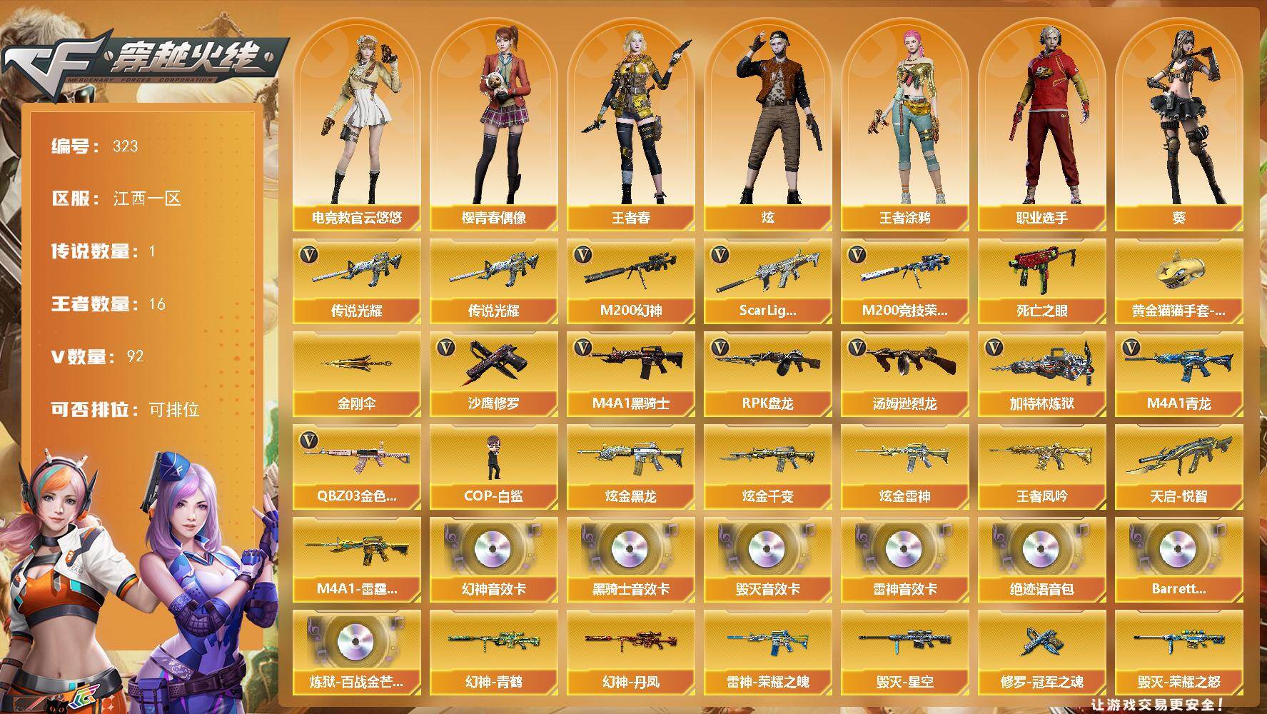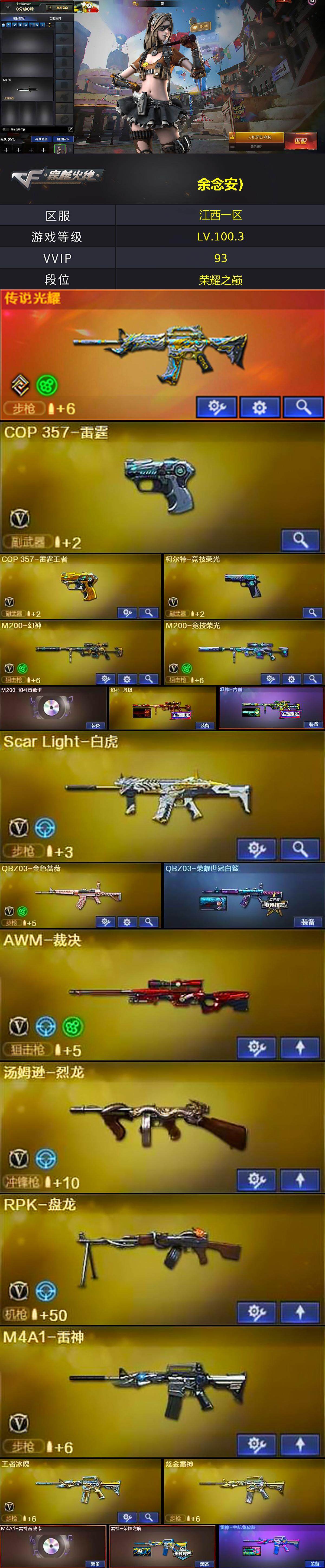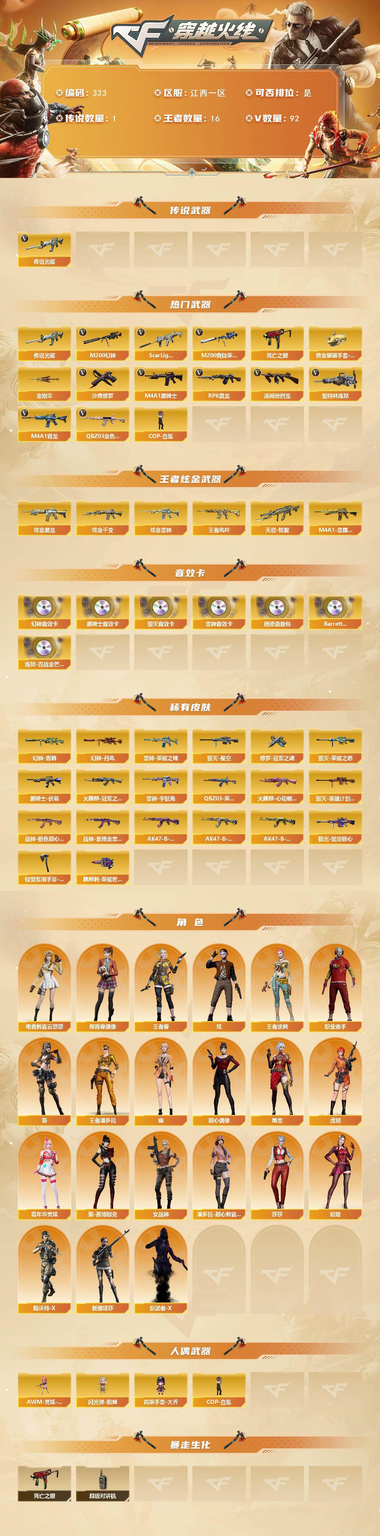 [14355778]江西一区-92V-16王者-3炫金 【传说武器】:传说光耀 【热门武器】:传说光耀,QBZ03-金色蔷薇,Scar Light-白虎,M4A1-青龙,M200-幻神,M200-竞技荣光,死亡之眼,M4A1-黑骑士,汤姆逊-烈龙,RPK-盘龙,加特林-炼狱,COP-白鲨,沙鹰-修罗*2,黄金猫猫手套-白鲨,金刚伞 【王者炫金武器】:天启-悦智,M4A1-雷霆王者,王者凤吟,炫金黑龙,炫金千变,炫金雷神 【音效卡】:M200-幻神音效卡,M4A1-雷神音效卡,M4A1-黑骑士音效卡,Barrett-毁灭音效卡,绝迹语音包,Barrett-碧霄极光音效卡,炼狱-百战金芒-庆典舞曲音效卡 【皮肤】:幻神-丹凤,幻神-青鹤,QBZ03-荣耀世冠白鲨,雷神-荣耀之魄,雷神-宇航兔皮肤,火麒麟-冠军之心,火麒麟-心动糖果,毁灭-荣耀之怒,毁灭-星空,毁灭-英雄计划 皮肤,黑骑士-伏羲,战神-粉色甜心皮肤,战神-紫绶金章皮肤,AK47-B-常胜将军-曹操,AK47-B-常胜将军-刘备,AK47-B-常胜将军-孙权,极光-能量核心,修罗-冠军之魂,轻型军用手斧-再燃火线,麒麟刺-荣耀世冠白鲨 【角色】:葵,炫,电竞教官-云悠悠,王者春,王者涂鸦,王者潘多拉,虎妞,嘉年华灵狐,葵-赛博朋克,女战神,潘多拉-甜心教官,莎莎,蛇姬,斯沃特-X,甜心偶像,蜀雪,新娜塔莎,樱-青春偶像,影武者-X,幽,职业选手 【人偶武器】:COP-白鲨,AWM-灵狐-15周年嘉年华,闪光弹-貂蝉,高爆手雷-大乔 【暴走生化】:死亡之眼,超级对讲机 【挑战大师】:冰龙粉碎者-白马银枪 【英雄级武器】:M4A1-千变,AK47-火麒麟*2,M4A1-黑龙,M4A1-雷神,M4A1-黑骑士,AK12-天启,M4A1-武圣,AK47-机械迷城,AK47-黑鲨,M4A1-青龙,Scar Light-白虎,黑武士-锦绣游龙,QBZ03-金色蔷薇,王者之势-觉醒版,AK-47-猩红传说,AK47-B-战神,王者冰魄-觉醒版,AK47-B-常胜将军,王者风势-觉醒版,AWM-天龙,Barrett-毁灭,Barrett-极光,AWM-裁决,M200-幻神,M200-竞技荣光,RPK-盘龙,加特林-炼狱,悦蓝-惊涛骇浪-觉醒版,汤姆逊-烈龙,沙鹰-修罗*2,沙鹰-天神*3,COP-雷霆,COP 357-雷霆王者-觉醒版,柯尔