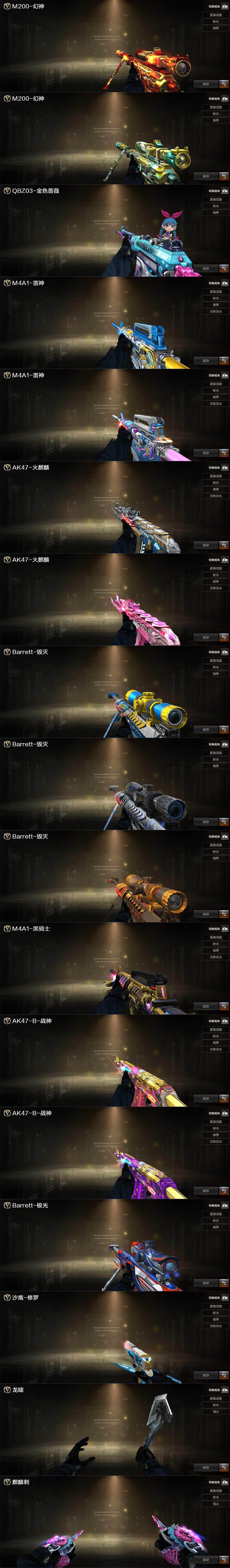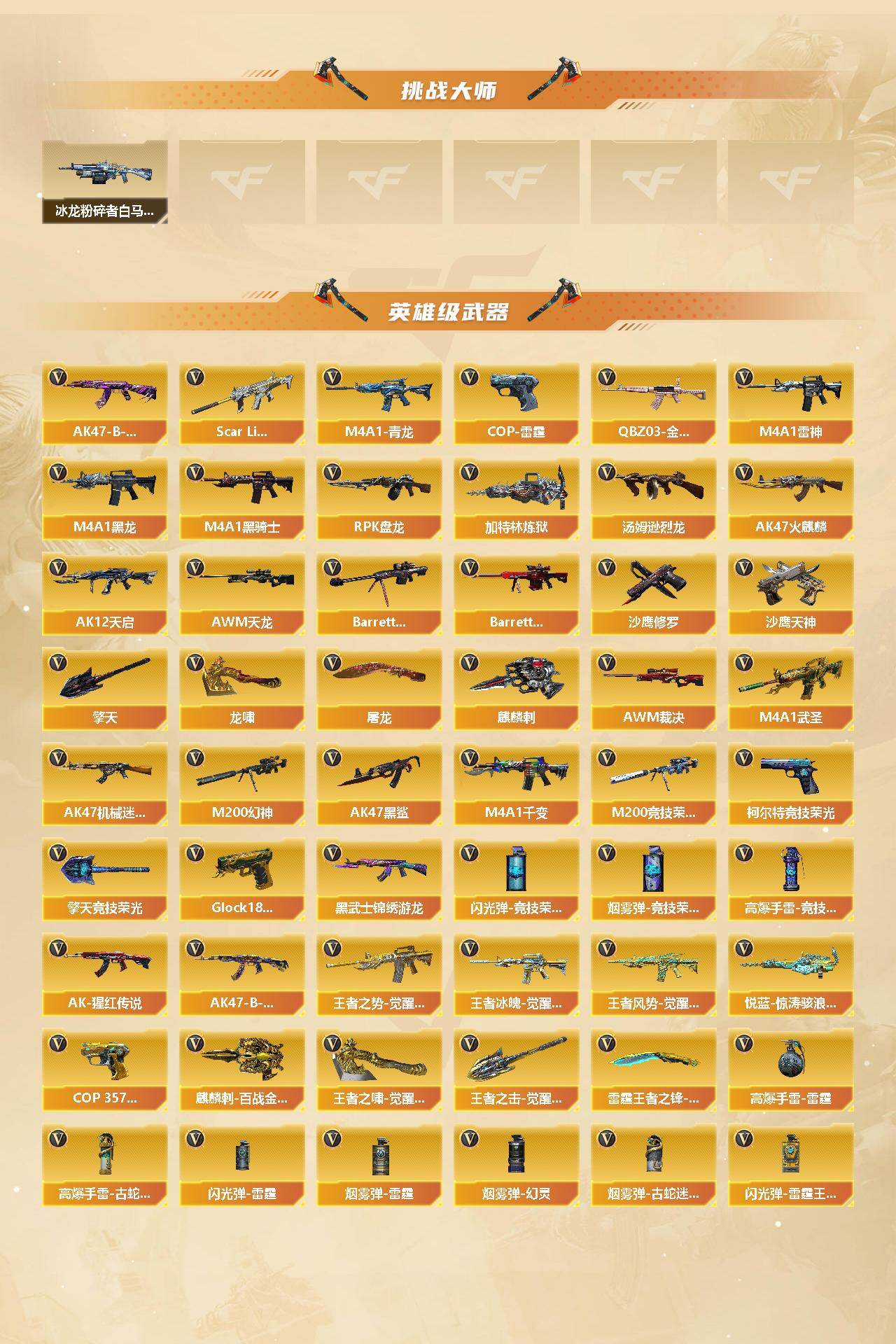 【英雄级武器】:M4A1-千变,AK47-火麒麟*2,M4A1-黑龙,M4A1-雷神,M4A1-黑骑士,AK12-天启,M4A1-武圣,AK47-机械迷城,AK47-黑鲨,M4A1-青龙,Scar Light-白虎,黑武士-锦绣游龙,QBZ03-金色蔷薇,王者之势-觉醒版,AK-47-猩红传说,AK47-B-战神,王者冰魄-觉醒版,AK47-B-常胜将军,王者风势-觉醒版,AWM-天龙,Barrett-毁灭,Barrett-极光,AWM-裁决,M200-幻神,M200-竞技荣光,RPK-盘龙,加特林-炼狱,悦蓝-惊涛骇浪-觉醒版,汤姆逊-烈龙,沙鹰-修罗*2,沙鹰-天神*3,COP-雷霆,COP 357-雷霆王者-觉醒版,柯尔