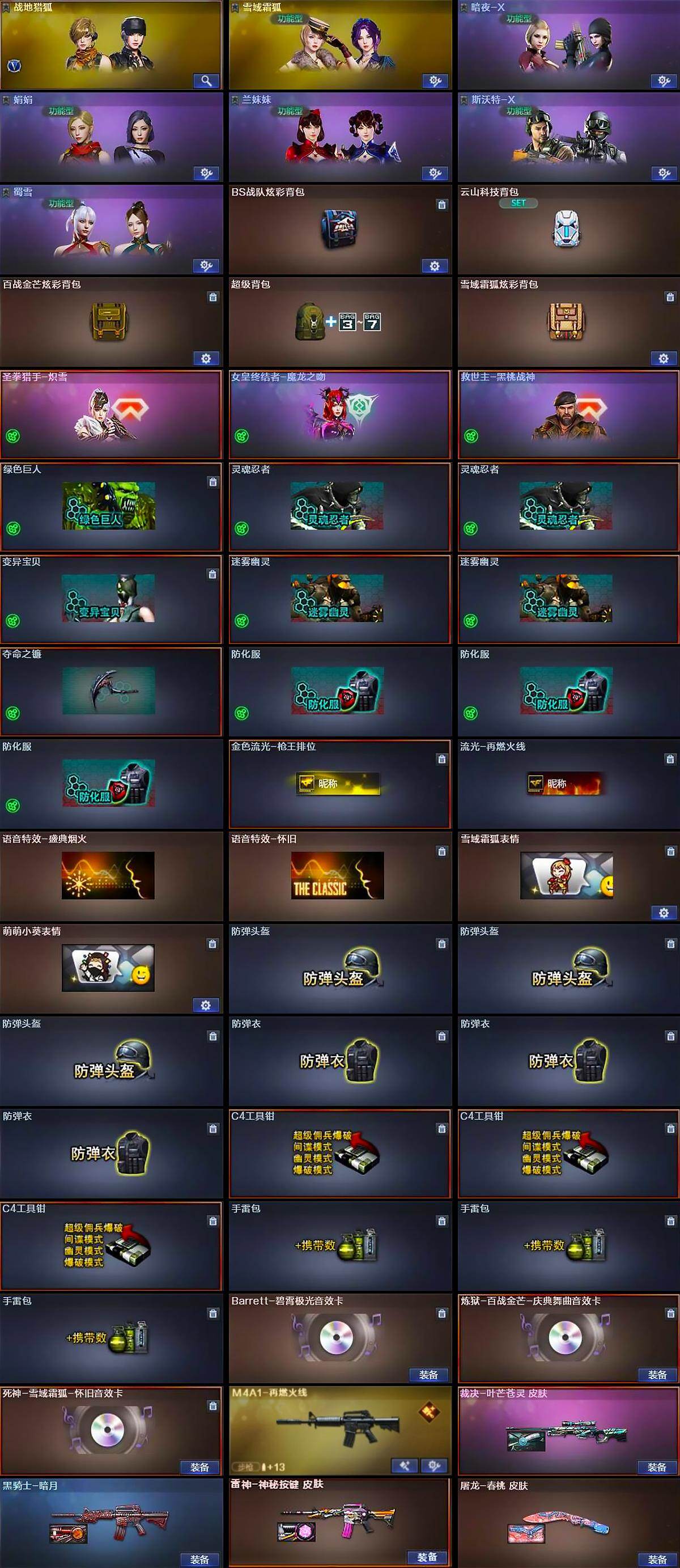 【道具】:BS战队炫彩背包,云山科技背包,百战金芒炫彩背包,超级背包,雪域霜狐炫彩背包,圣拳猎手-炽雪,女皇终结者-魔龙之吻,救世主-黑桃战神,绿色巨人,灵魂忍者*2,变异宝贝,迷雾幽灵*2,夺命之镰,防化服*3,金色流光-枪王排位,流光-再燃火线,语音特效-盛典烟火,语音特效-怀旧,雪域霜狐表情,萌萌小葵表情,防弹头盔*3,防弹衣*3,C4工具钳*3,手雷包*3