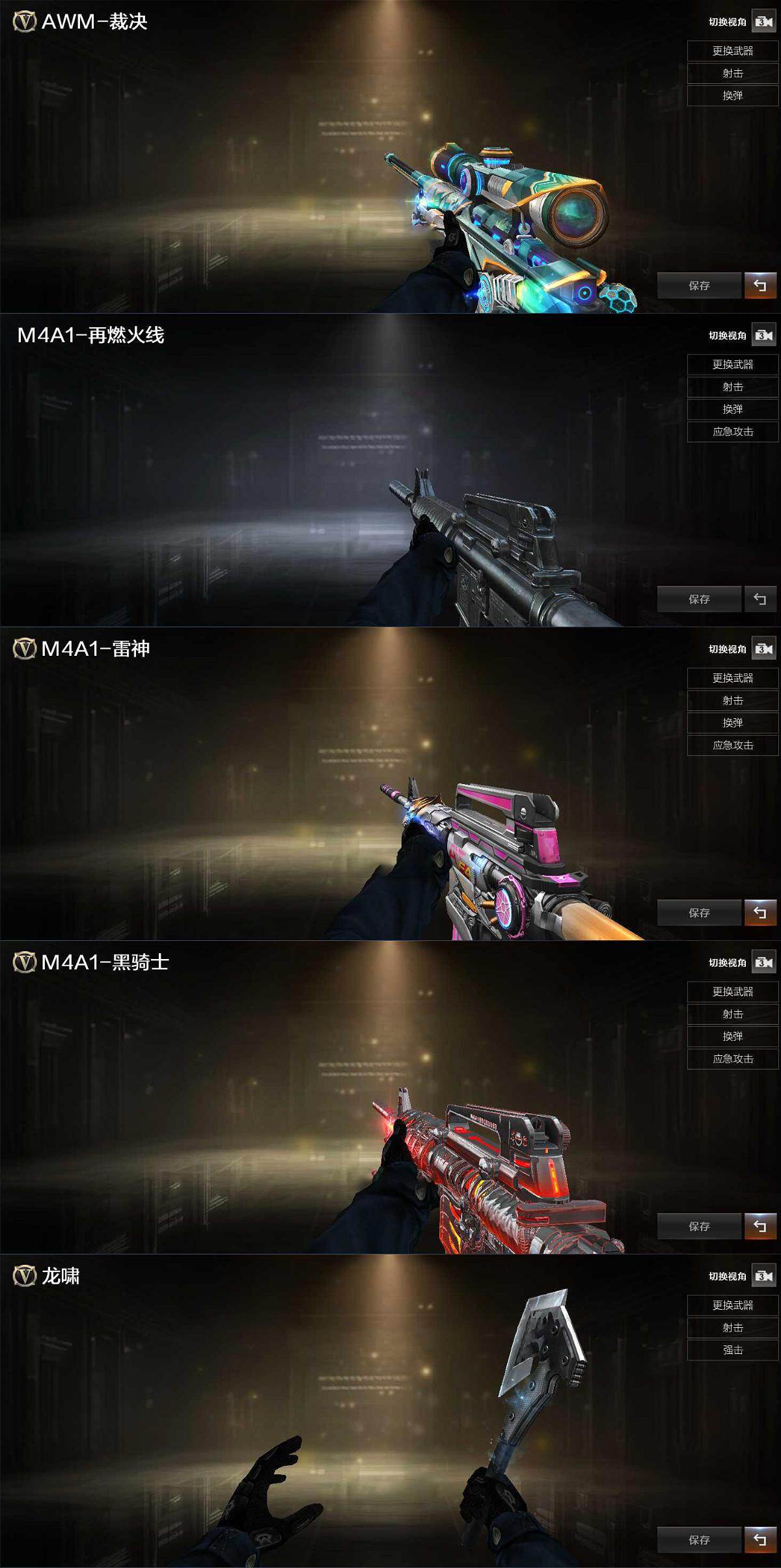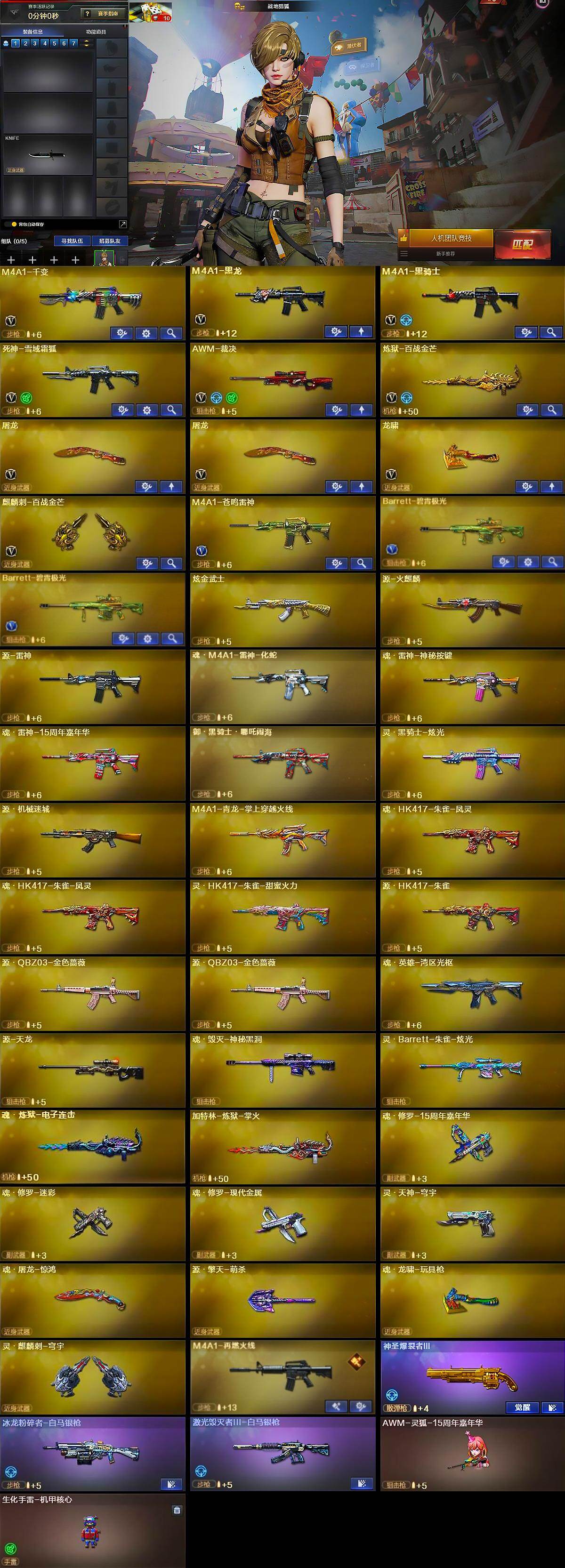 【英雄级武器】:M4A1-千变,M4A1-黑龙,M4A1-黑骑士,死神-雪域霜狐,AWM-裁决,炼狱-百战金芒,屠龙*2,龙啸,麒麟刺-百战金芒,M4A1-苍鸣雷神,Barrett-碧霄极光*2