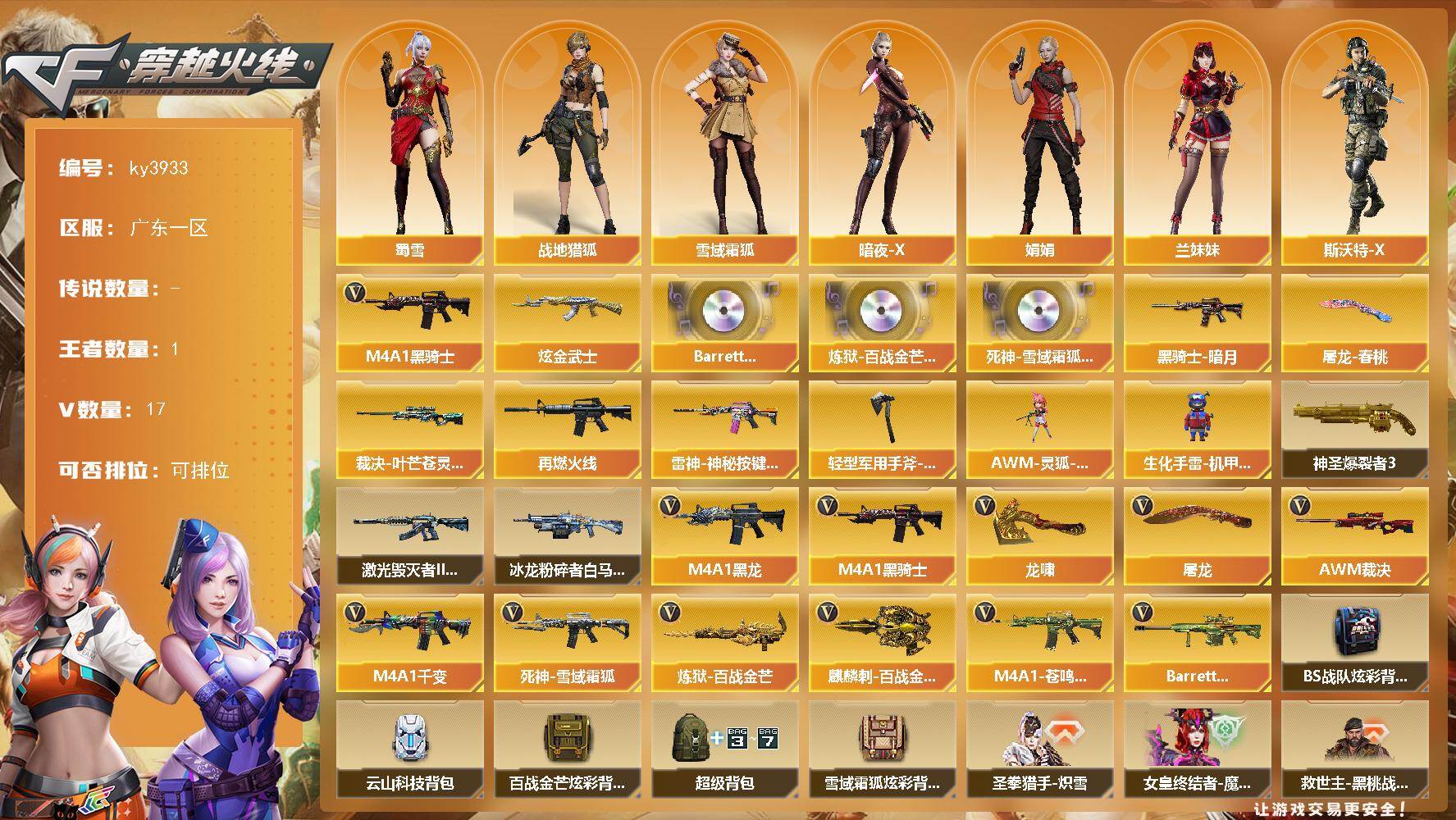 [14356597]广东一区-17V-1王者-1炫金 【热门武器】:M4A1-黑骑士 【王者炫金武器】:炫金武士 【音效卡】:Barrett-碧霄极光音效卡,炼狱-百战金芒-庆典舞曲音效卡,死神-雪域霜狐-怀旧音效卡 【皮肤】:裁决-叶芒苍灵 皮肤,M4A1-再燃火线,雷神-神秘按键 皮肤,黑骑士-暗月,屠龙-春桃 皮肤,轻型军用手斧-再燃火线 【角色】:战地猎狐,雪域霜狐,暗夜-X,娟娟,兰妹妹,斯沃特-X,蜀雪 【人偶武器】:AWM-灵狐-15周年嘉年华,生化手雷-机甲核心 【挑战大师】:神圣爆裂者III,冰龙粉碎者-白马银枪,激光毁灭者III-白马银枪 【英雄级武器】:M4A1-千变,M4A1-黑龙,M4A1-黑骑士,死神-雪域霜狐,AWM-裁决,炼狱-百战金芒,屠龙*2,龙啸,麒麟刺-百战金芒,M4A1-苍鸣雷神,Barrett-碧霄极光*2 【道具】:BS战队炫彩背包,云山科技背包,百战金芒炫彩背包,超级背包,雪域霜狐炫彩背包,圣拳猎手-炽雪,女皇终结者-魔龙之吻,救世主-黑桃战神,绿色巨人,灵魂忍者*2,变异宝贝,迷雾幽灵*2,夺命之镰,防化服*3,金色流光-枪王排位,流光-再燃火线,语音特效-盛典烟火,语音特效-怀旧,雪域霜狐表情,萌萌小葵表情,防弹头盔*3,防弹衣*3,C4工具钳*3,手雷包*3 【特殊枪械】:1黑骑士