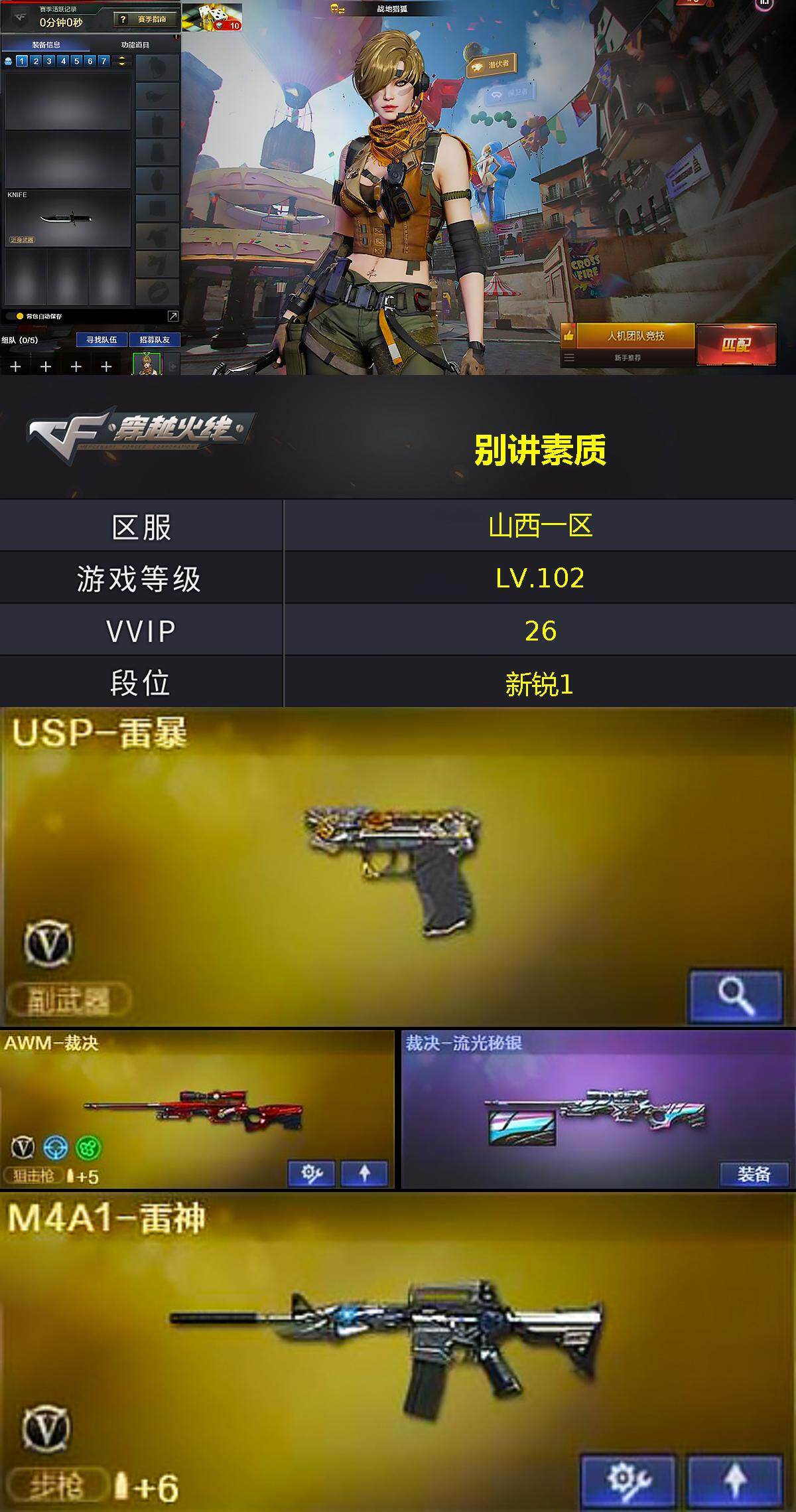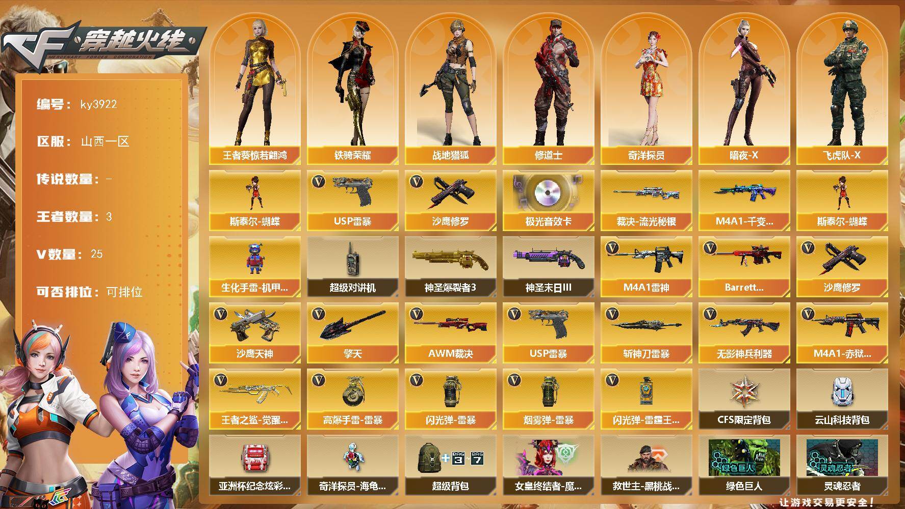 [14358054]山西一区-25V-3王者-0炫金 【热门武器】:斯泰尔-蝴蝶,USP-雷暴,沙鹰-修罗 【音效卡】:Barrett-极光音效卡 【皮肤】:裁决-流光秘银,M4A1-千变-孔明皮肤 【角色】:战地猎狐,王者葵-惊若翩鸿,奇洋探员,修道士,暗夜-X,飞虎队-X,嘉年华灵狐,娟娟,兰妹妹,灵狐者-X,灵狐者-黄金海岸,潘多拉-甜心教官,斯沃特-X,铁骑荣耀,兔囡囡,维纳斯,夜玫瑰-宠粉,樱-战斗天使,游珑儿 【人偶武器】:斯泰尔-蝴蝶,生化手雷-机甲核心*3 【暴走生化】:超级对讲机 【挑战大师】:神圣爆裂者III*2,神圣爆裂者-末日III 【英雄级武器】:M4A1-雷神,无影-神兵利器,王者之鲨-觉醒版,Barrett-极光,AWM-裁决,沙鹰-修罗,沙鹰-天神,USP-雷暴,擎天,斩神刀-雷暴,高爆手雷-雷暴*4,闪光弹-雷暴*6,闪光弹-雷霆王者-觉醒版,烟雾弹-雷暴*4,M4A1-赤狱骑士 【道具】:CFS限定背包,云山科技背包,亚洲杯纪念炫彩背包,奇洋探员-海龟背包,超级背包,女皇终结者-魔龙之吻,救世主-黑桃战神,黄金生化钩,绿色巨人,灵魂忍者*2,变异宝贝,迷雾幽灵*2,生化弹匣,夺命之镰,防化服*3,金色流光-枪王排位*2,星辰流光-枪王排位,流光-鎏金之域,流光-再燃火线,枪王排位28赛季金色流光,枪王排位29赛季金色流光,电玩兔兔表情,EP战队名片,EP战队喷图,EP战队击杀图标,C4-再燃火线,防弹头盔*5,防弹衣*5,C4工具钳*5,手雷包*5 【特殊枪械】:蝴蝶斯泰尔+0烈龙,1蝴蝶斯泰尔