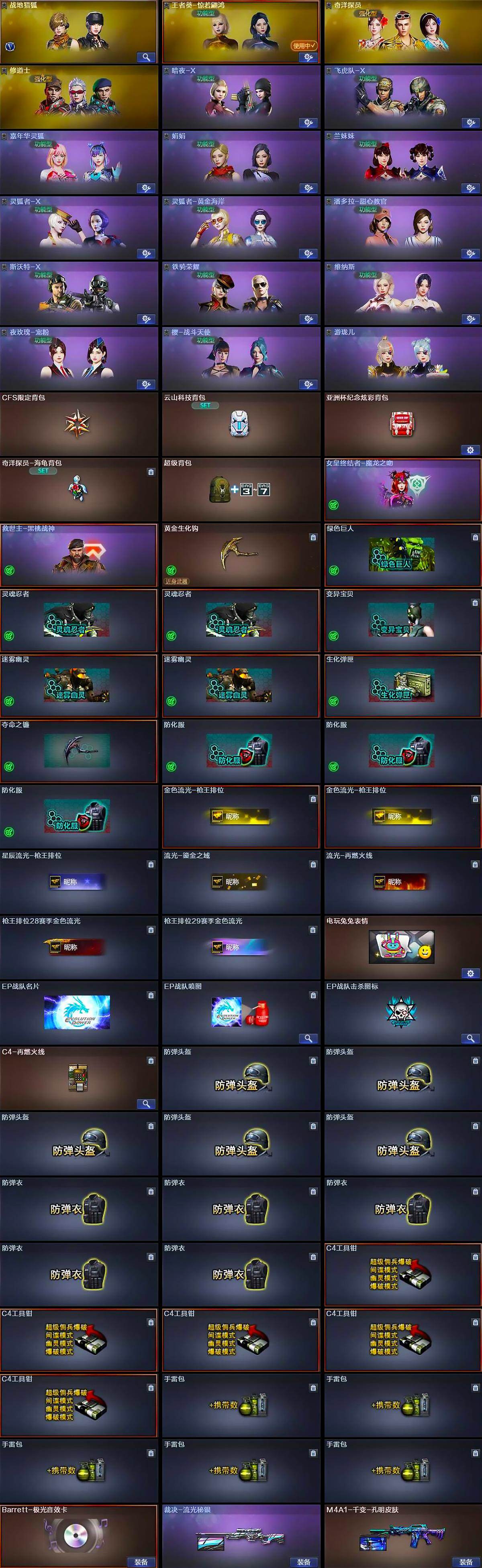 【道具】:CFS限定背包,云山科技背包,亚洲杯纪念炫彩背包,奇洋探员-海龟背包,超级背包,女皇终结者-魔龙之吻,救世主-黑桃战神,黄金生化钩,绿色巨人,灵魂忍者*2,变异宝贝,迷雾幽灵*2,生化弹匣,夺命之镰,防化服*3,金色流光-枪王排位*2,星辰流光-枪王排位,流光-鎏金之域,流光-再燃火线,枪王排位28赛季金色流光,枪王排位29赛季金色流光,电玩兔兔表情,EP战队名片,EP战队喷图,EP战队击杀图标,C4-再燃火线,防弹头盔*5,防弹衣*5,C4工具钳*5,手雷包*5