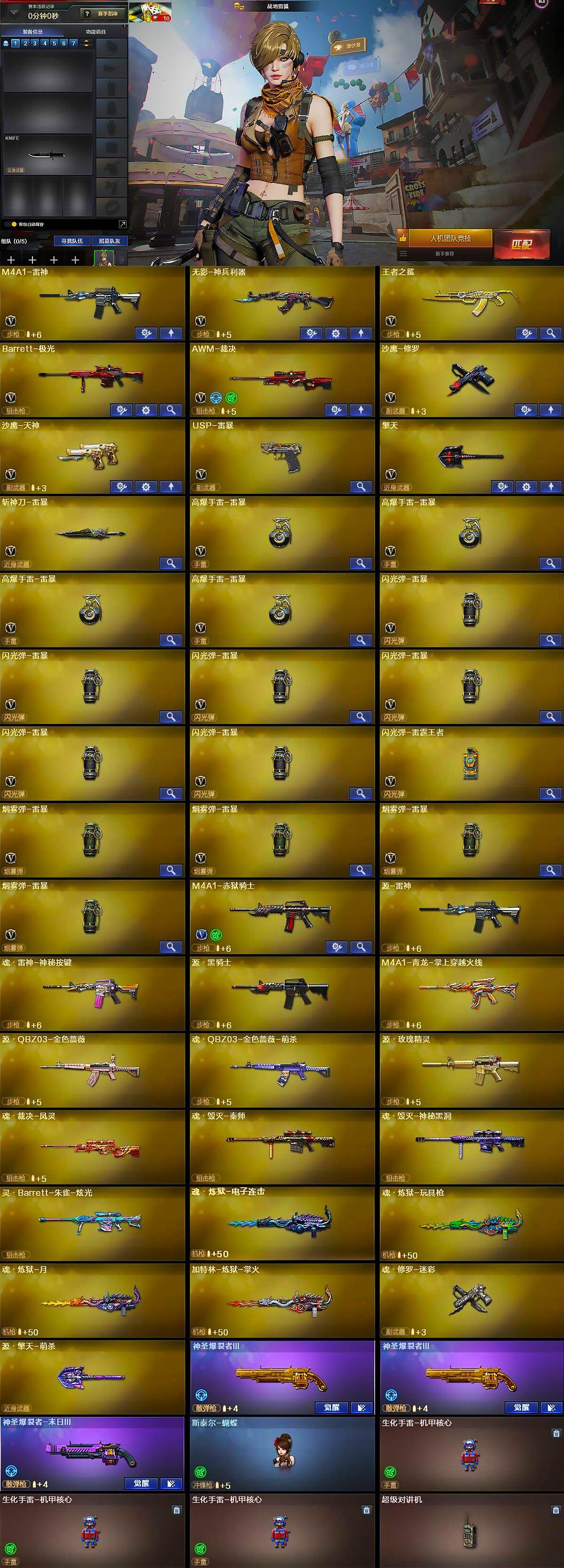 【英雄级武器】:M4A1-雷神,无影-神兵利器,王者之鲨-觉醒版,Barrett-极光,AWM-裁决,沙鹰-修罗,沙鹰-天神,USP-雷暴,擎天,斩神刀-雷暴,高爆手雷-雷暴*4,闪光弹-雷暴*6,闪光弹-雷霆王者-觉醒版,烟雾弹-雷暴*4,M4A1-赤狱骑士