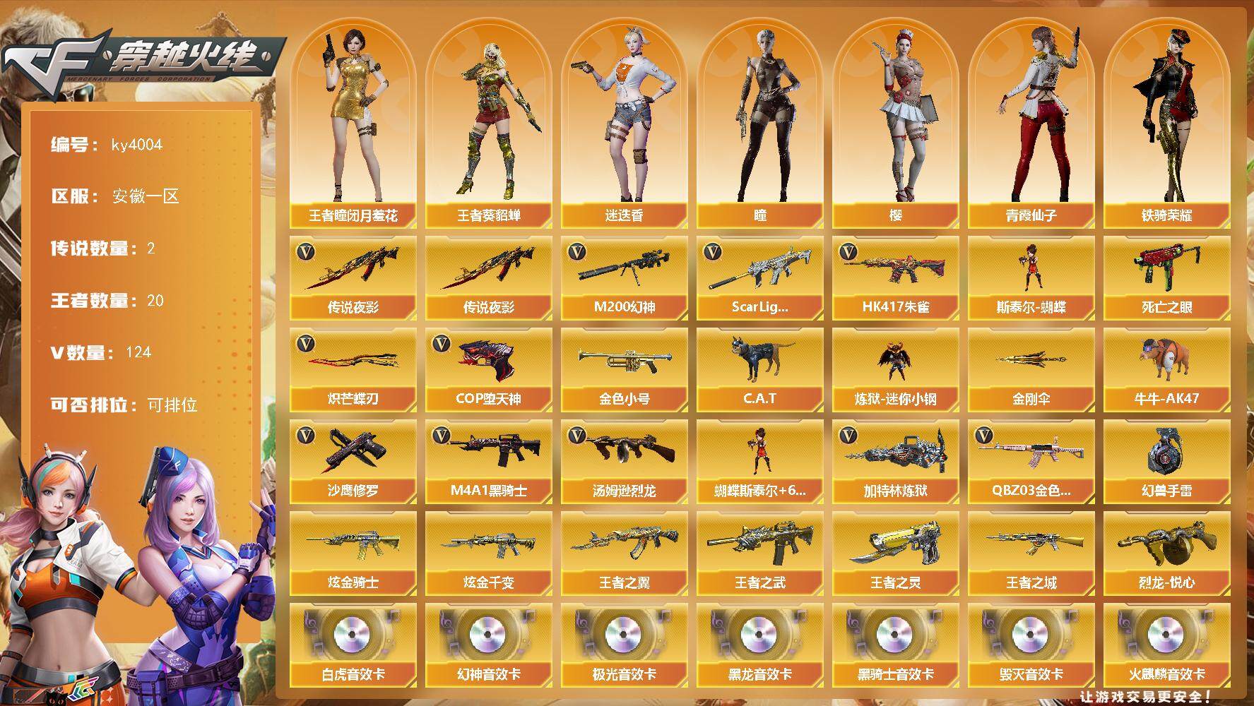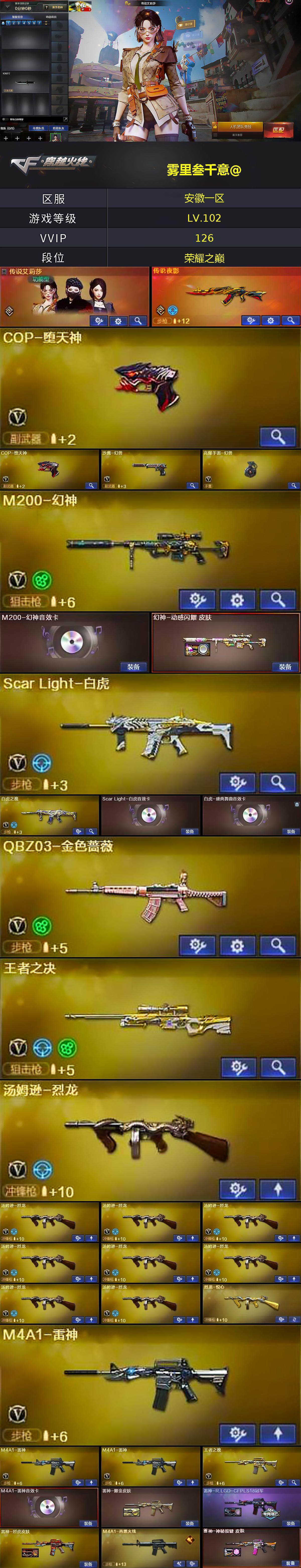 - [15657139]陕西一区-88V-12王者-11炫金 【热门武器】:QBZ03-金色蔷薇*2,Scar Light-白虎,HK417-朱雀,M200-幻神,死亡之眼*2,白虎-电玩蓝兔,金色小号,C.A.T,毒蜂,牛牛-AK47,M4A1-黑骑士,汤姆逊-烈龙*2,RPK-盘龙,加特林-炼狱*2,炼狱-秦师,火麒麟-绝迹,COP-白鲨,沙鹰-修罗*4,炽芒蝶刃-荣耀世冠白鲨2023 皮肤 【王者炫金武器】:王者之戮,超新星-悦享,王者之武,王者之心,王者星霆,炼狱-悦蓝,炫金骑士*2,炫金无影,炫金黑龙,炫金雷神,炫金毁灭*3,炫金天龙*2,炫金修罗 【音效卡】:AK47-火麒麟音效卡,M4A1-雷神音效卡,M4A1-黑龙音效卡,M4A1-黑骑士音效卡,Barrett-毁灭音效卡,N9语音包,死神-雪域霜狐-怀旧音效卡 【皮肤】:幻神-AG-CFPL S24冠军 皮肤,QBZ03-AG-CFPLS19冠军,裁决-巅峰荣耀 皮肤,雷神-能量核心,雷神-星空,雷神-宠儿-2019MVP,雷神-R.LGD-CFPLS18冠军,雷神-机甲刑天皮肤,雷神-宇航兔皮肤,火麒麟-冠军之心,火麒麟-平天大圣,火麒麟-百城*2,火麒麟-巅峰荣耀,毁灭耀金皮肤,毁灭-星空,毁灭-冠军之怒,毁灭-CFS2020,毁灭-航天科技皮肤,M4A1-千变-孔明皮肤,黑龙-能量核心,黑龙-暗月,黑骑士-冠军之势,黑骑士-CFS2021,黑骑士-破浪10年皮肤,无影耀金皮肤,AK47-黑武士-361,战神-粉色甜心皮肤*2,战神-紫绶金章皮肤*2,战神-流金岁月皮肤*3,AK47-B-常胜将军-孙权*2,修罗耀金皮肤,天神-暗月,屠龙-春桃 皮肤,炽芒蝶刃-荣耀世冠白鲨2023 皮肤 【角色】:零,樱,魅影,战地猎狐,王者-葵-貂蝉,雪域霜狐,奇洋探员,乔伊教练,修道士,云海玲珑,空,暗夜-X,初恋灵狐,电竞少女,芳心审判者,风暴女,嘉年华灵狐,疾风,娟娟,兰-空鹰,灵动武士,灵狐-花神,麻雀,萌儿,潜龙队-X,青霞仙子,蜀雪,兔囡囡,维纳斯,雪莉杨,雪莉杨-摸金校尉,夜玫瑰-幻能朋克,樱-战斗天使,影武者-X 【人偶武器】:炼狱-秦师,火麒麟-绝迹,COP-白鲨,火麒麟-灵狐*2,COP-赤龙-刀锋,AWM-灵狐-15周年嘉年华,C.A.T,牛牛-AK47,迷你深渊冰龙*2,夺魂,生化手雷-机甲核心,闪光弹-小