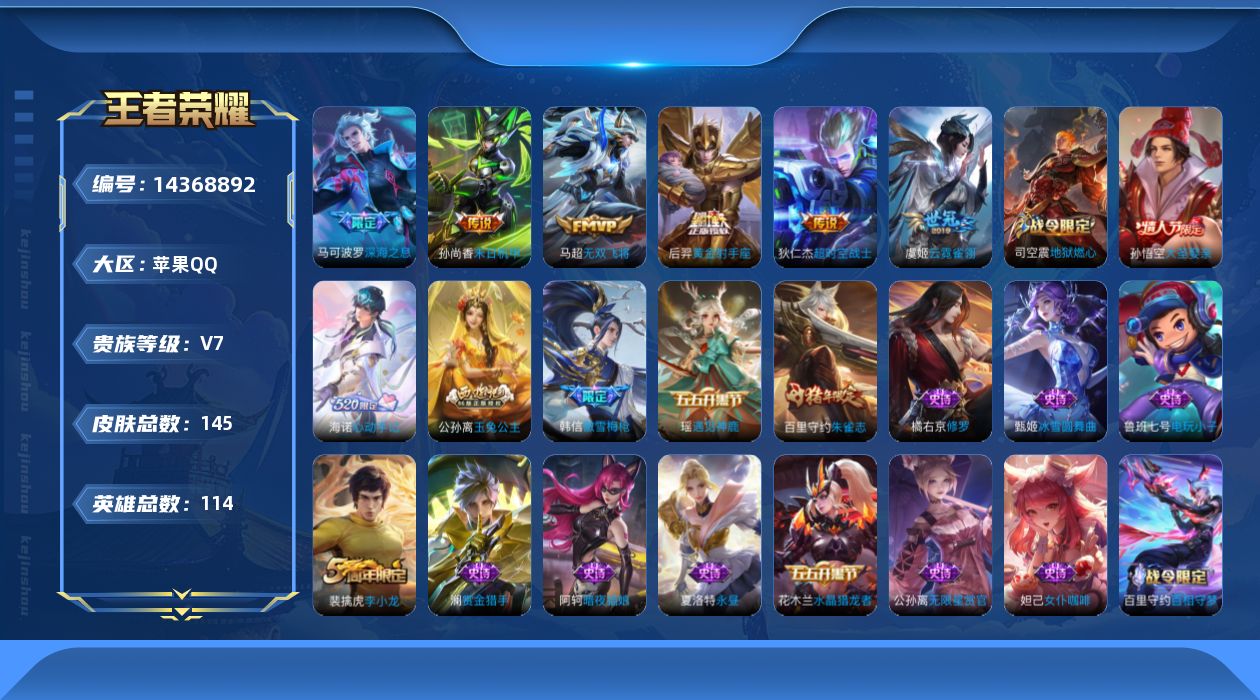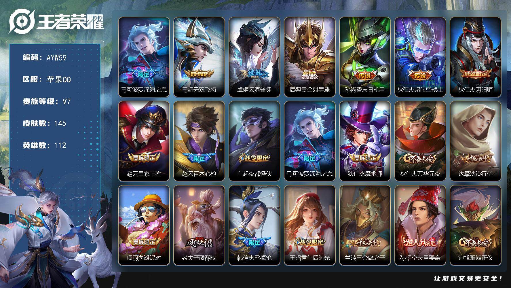 [14368892]可二次【店主推荐捡漏号!可直接换绑】苹果Q-V7-荣耀黄金II段位-112英雄-145皮肤-6传说-47史诗