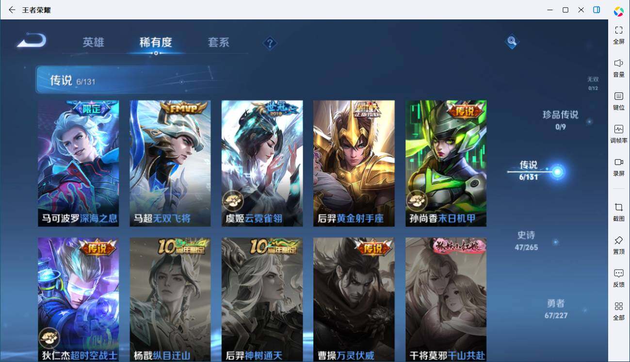 【传说皮肤】:马可波罗深海之息,马超无双飞将,虞姬云霓雀翎,后羿黄金射手座,孙尚香末日机甲,狄仁杰超时空战士