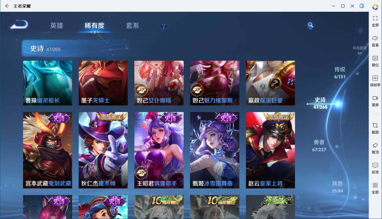 【史诗皮肤】:鲁班七号电玩小子,阿轲暗夜猫娘,赵云皇家上将,甄姬冰雪圆舞曲,王昭君偶像歌手,狄仁杰魔术师,宫本武藏鬼剑武藏,嬴政摇滚巨星,妲己魅力维加斯,妲己女仆咖啡,墨子龙骑士,曹操幽灵船长,张飞乱世虎臣,花木兰水晶猎龙者,夏侯惇乘风破浪,小乔缤纷独角兽,兰陵王暗隐猎兽者,安琪拉心灵骇客,蔡文姬舞动绿茵,刘禅天才门将,李元芳逐浪之夏,白起星夜王子,孙策猫狗日记,百里守约朱雀志,孙悟空大圣娶亲,伽罗箭羽风息,狄仁杰鹰眼统帅,公孙离无限星赏官,橘右京修罗,瑶遇见神鹿,裴擒虎李小龙,百里玄策热力回旋,杨戬天秀启明,嫦娥拒霜思,韩信傲雪梅枪,夏洛特永昼,赵云百木心枪,公孙离玉兔公主,澜赏金猎手,艾琳奇遇舞章,明世隐吟游魔法,司空震地狱燃心,妲己灵卜魔法,镜青焰无极,海诺心动手记,黄忠怒海争锋,芈月浮光幕影,百里守约百相守梦