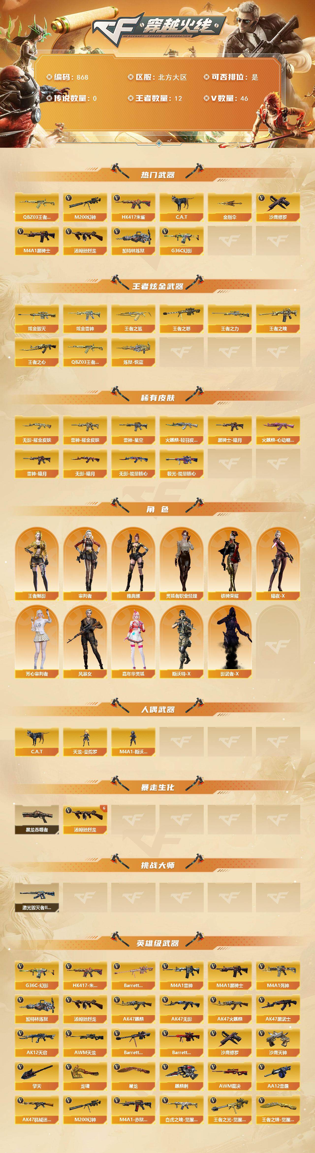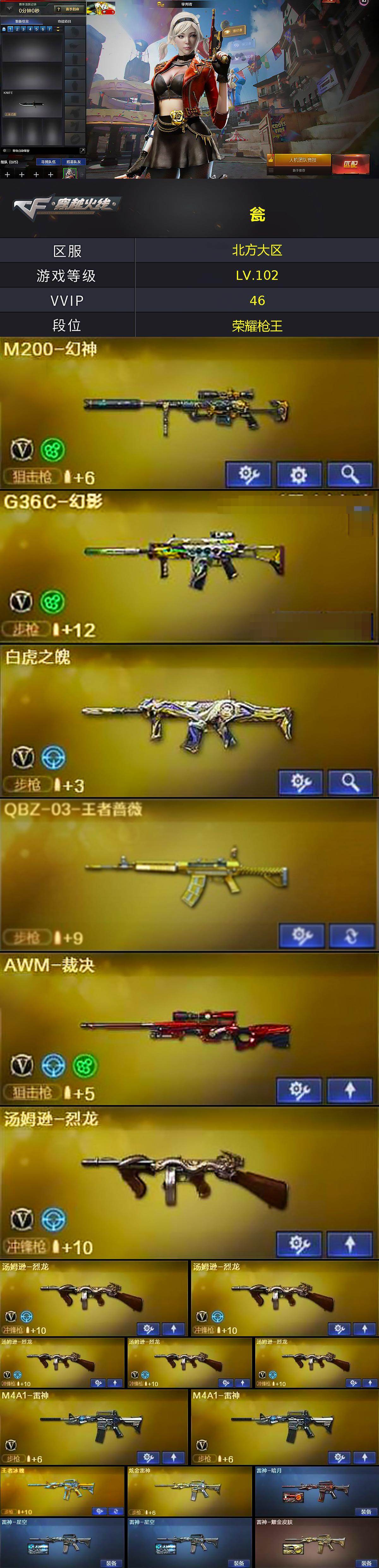 [14379072]北方大区-46V-12王者-3炫金 【热门武器】:G36C-幻影,HK417-朱雀,M200-幻神,QBZ-03-王者蔷薇,C.A.T,M4A1-黑骑士*3,汤姆逊-烈龙*6,加特林-炼狱,沙鹰-修罗*7,金刚伞 【王者炫金武器】:王者之鲨,王者之魄,王者之心,QBZ-03-王者蔷薇,王者之怒,王者之力,炼狱-悦蓝,炫金雷神,炫金毁灭*2 【皮肤】:雷神-暗月,雷神-星空*2,雷神-耀金皮肤,火麒麟-轻羽皮肤,火麒麟-心动糖果,黑骑士-暗月,无影-暗月,无影-能量核心,无影耀金皮肤,极光-能量核心 【角色】:审判者,王者-魅影,暗夜-X,芳心审判者,风暴女,嘉年华灵狐,灵狐者-职业经理,斯沃特-X,铁骑荣耀,影武者-X,雅典娜 【人偶武器】:天龙-曼陀罗,C.A.T,M4A1-斯沃特 【暴走生化】:黑龙吞噬者 【挑战大师】:激光毁灭者III-白马银枪 【英雄级武器】:AK47-火麒麟,AK47-麒麟,M4A1-雷神*2,M4A1-黑骑士*3,AK47-无影,M4A1-死神,AK47-黑武士,AK12-天启,AK47-机械迷城,HK417-朱雀,G36C-幻影,白虎之魄-觉醒版,AWM-天龙,Barrett-毁灭,Barrett-极光,AWM-裁决,M200-幻神,Barrett-金色蔷薇,王者之光-觉醒版,加特林-炼狱,汤姆逊-烈龙*6,AA-12-雷霆,沙鹰-修罗*7,沙鹰-天神,屠龙,龙啸,擎天*2,麒麟刺*3,王者之锋-觉醒版,M4A1-赤狱骑士 【道具】:战舰背包,炫彩背包,虎牙炫彩背包,超级背包,绿色巨人,灵魂忍者,变异宝贝,迷雾幽灵,夺命之镰,防化服*3,枪王排位29赛季金色流光,循环实验表情,防弹头盔*3,防弹衣*3,C4工具钳*3,手雷包*3 【特殊枪械】:3黑骑士,6烈龙,1炼狱
