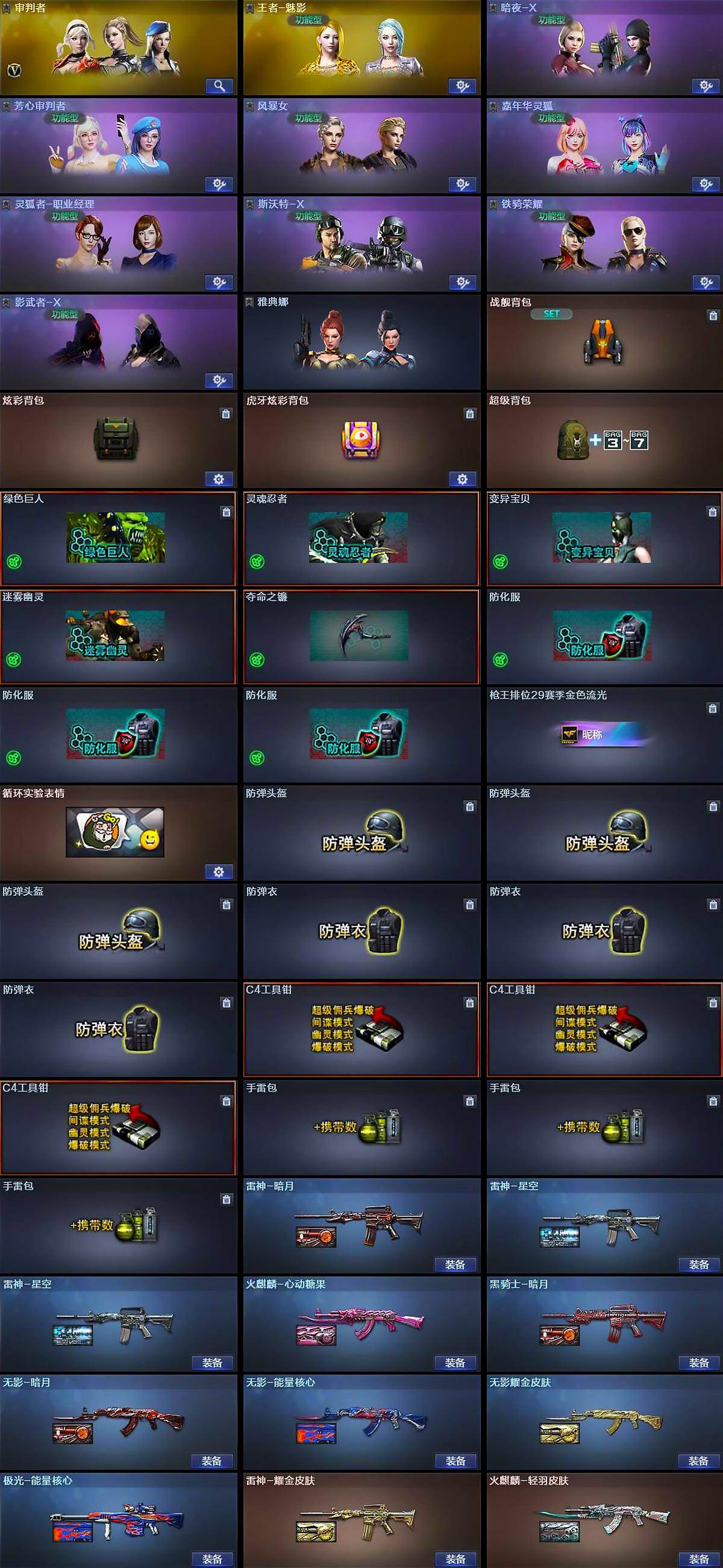 【道具】:战舰背包,炫彩背包,虎牙炫彩背包,超级背包,绿色巨人,灵魂忍者,变异宝贝,迷雾幽灵,夺命之镰,防化服*3,枪王排位29赛季金色流光,循环实验表情,防弹头盔*3,防弹衣*3,C4工具钳*3,手雷包*3