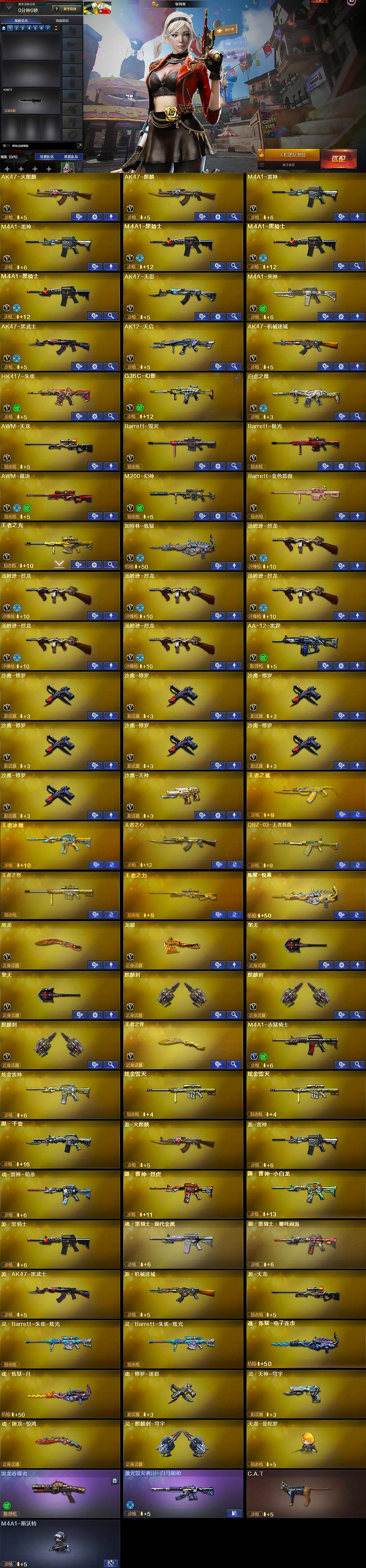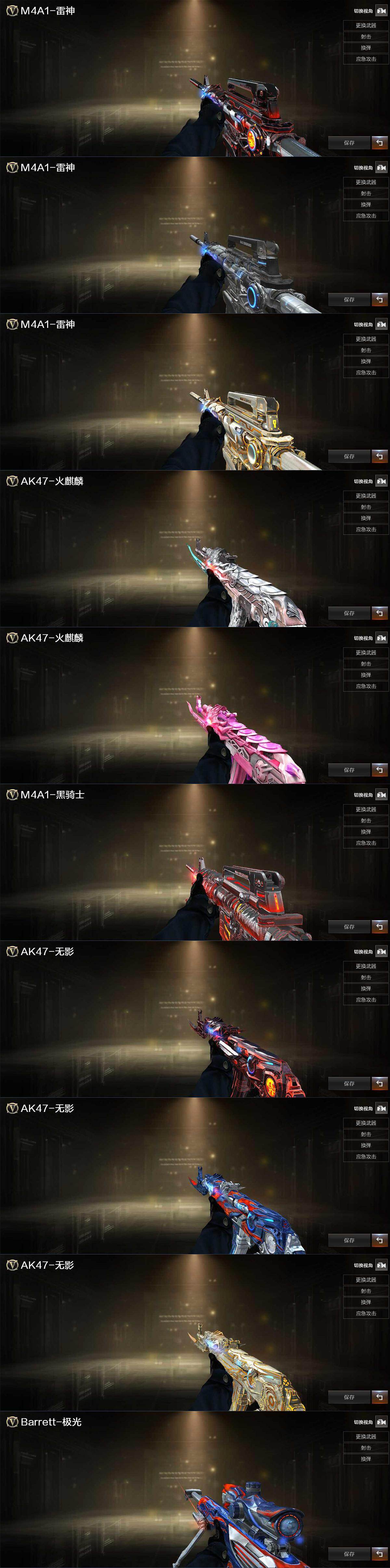 【英雄级武器】:AK47-火麒麟,AK47-麒麟,M4A1-雷神*2,M4A1-黑骑士*3,AK47-无影,M4A1-死神,AK47-黑武士,AK12-天启,AK47-机械迷城,HK417-朱雀,G36C-幻影,白虎之魄-觉醒版,AWM-天龙,Barrett-毁灭,Barrett-极光,AWM-裁决,M200-幻神,Barrett-金色蔷薇,王者之光-觉醒版,加特林-炼狱,汤姆逊-烈龙*6,AA-12-雷霆,沙鹰-修罗*7,沙鹰-天神,屠龙,龙啸,擎天*2,麒麟刺*3,王者之锋-觉醒版,M4A1-赤狱骑士