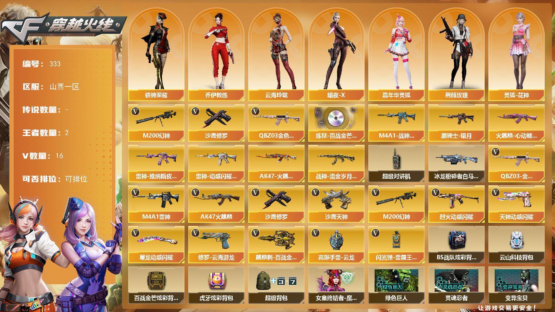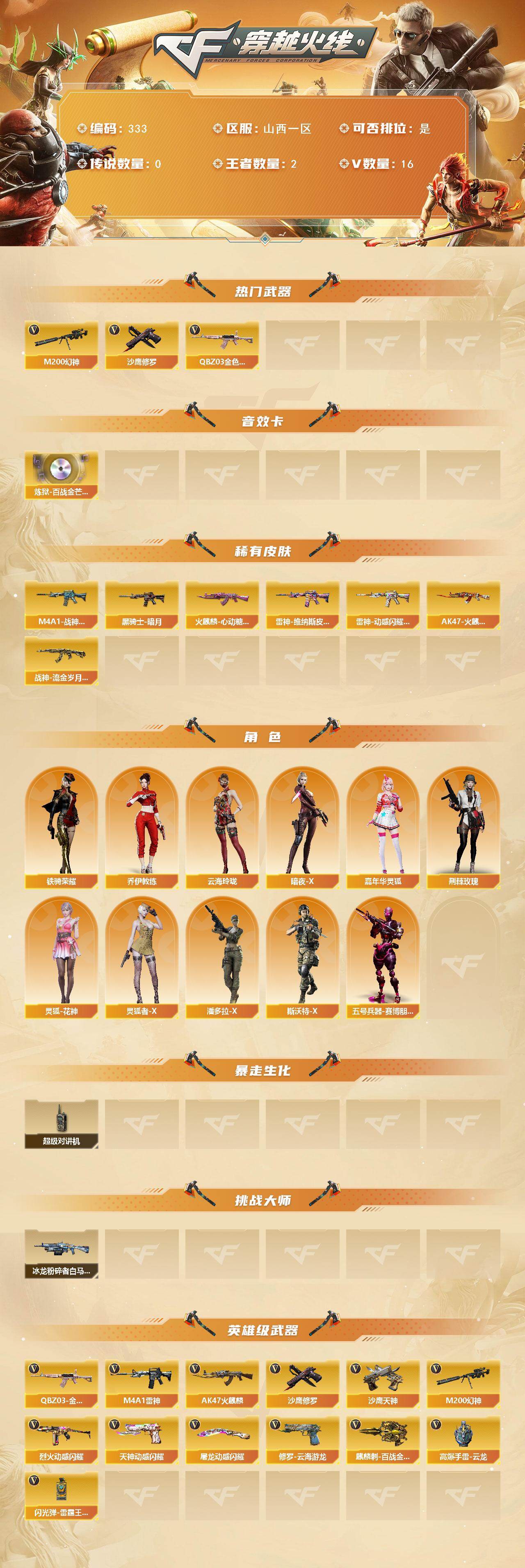 [14381914]山西一区-16V-2王者-0炫金 【热门武器】:QBZ03-金色蔷薇,M200-幻神,沙鹰-修罗 【音效卡】:炼狱-百战金芒-庆典舞曲音效卡 【皮肤】:M4A1-战神赵云,雷神-维纳斯皮肤,雷神-动感闪耀 皮肤,火麒麟-心动糖果,AK47-火麒麟-百城23冠军皮肤,黑骑士-暗月,战神-流金岁月皮肤 【角色】:乔伊教练,云海玲珑,暗夜-X,嘉年华灵狐,荆棘玫瑰,灵狐-花神,灵狐者-X,潘多拉-X,斯沃特-X,铁骑荣耀,五号兵器-赛博朋克 【暴走生化】:超级对讲机 【挑战大师】:冰龙粉碎者-白马银枪 【英雄级武器】:AK47-火麒麟,M4A1-雷神,QBZ03-金色蔷薇,烈火-动感闪耀,M200-幻神,沙鹰-修罗,沙鹰-天神*2,天神-动感闪耀,修罗-云海游龙,屠龙-动感闪耀,麒麟刺-百战金芒,高爆手雷-云龙*2,闪光弹-雷霆王者-觉醒版*2 【道具】:BS战队炫彩背包,云山科技背包,百战金芒炫彩背包,虎牙炫彩背包,超级背包,女皇终结者-魔龙之吻,绿色巨人,灵魂忍者,变异宝贝,迷雾幽灵,夺命之镰,防化服*2,金色流光-枪王排位*2,星辰流光-枪王排位,语音特效-盛典烟火,萌萌小葵表情,动感闪耀表情,EP战队名片,EP战队喷图,EP战队击杀图标,防弹头盔*4,防弹衣*4,C4工具钳*4,手雷包*4 【特殊枪械】:
