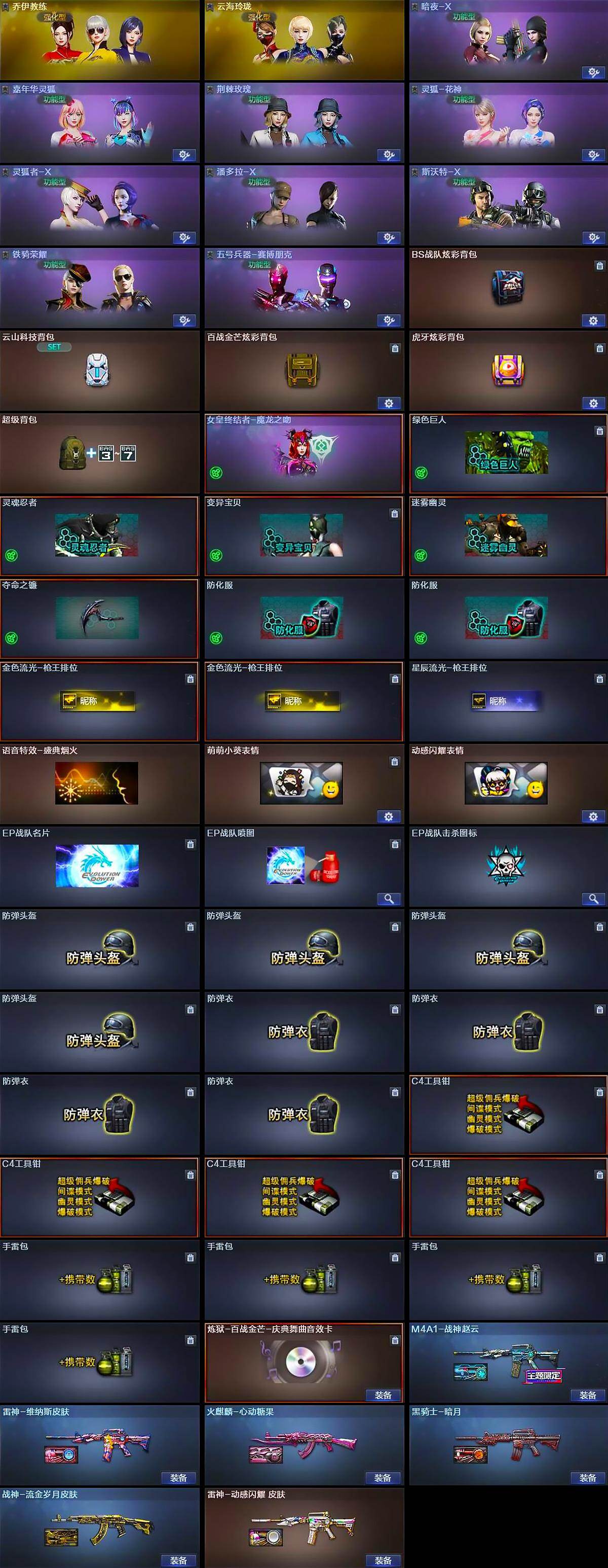 【道具】:BS战队炫彩背包,云山科技背包,百战金芒炫彩背包,虎牙炫彩背包,超级背包,女皇终结者-魔龙之吻,绿色巨人,灵魂忍者,变异宝贝,迷雾幽灵,夺命之镰,防化服*2,金色流光-枪王排位*2,星辰流光-枪王排位,语音特效-盛典烟火,萌萌小葵表情,动感闪耀表情,EP战队名片,EP战队喷图,EP战队击杀图标,防弹头盔*4,防弹衣*4,C4工具钳*4,手雷包*4