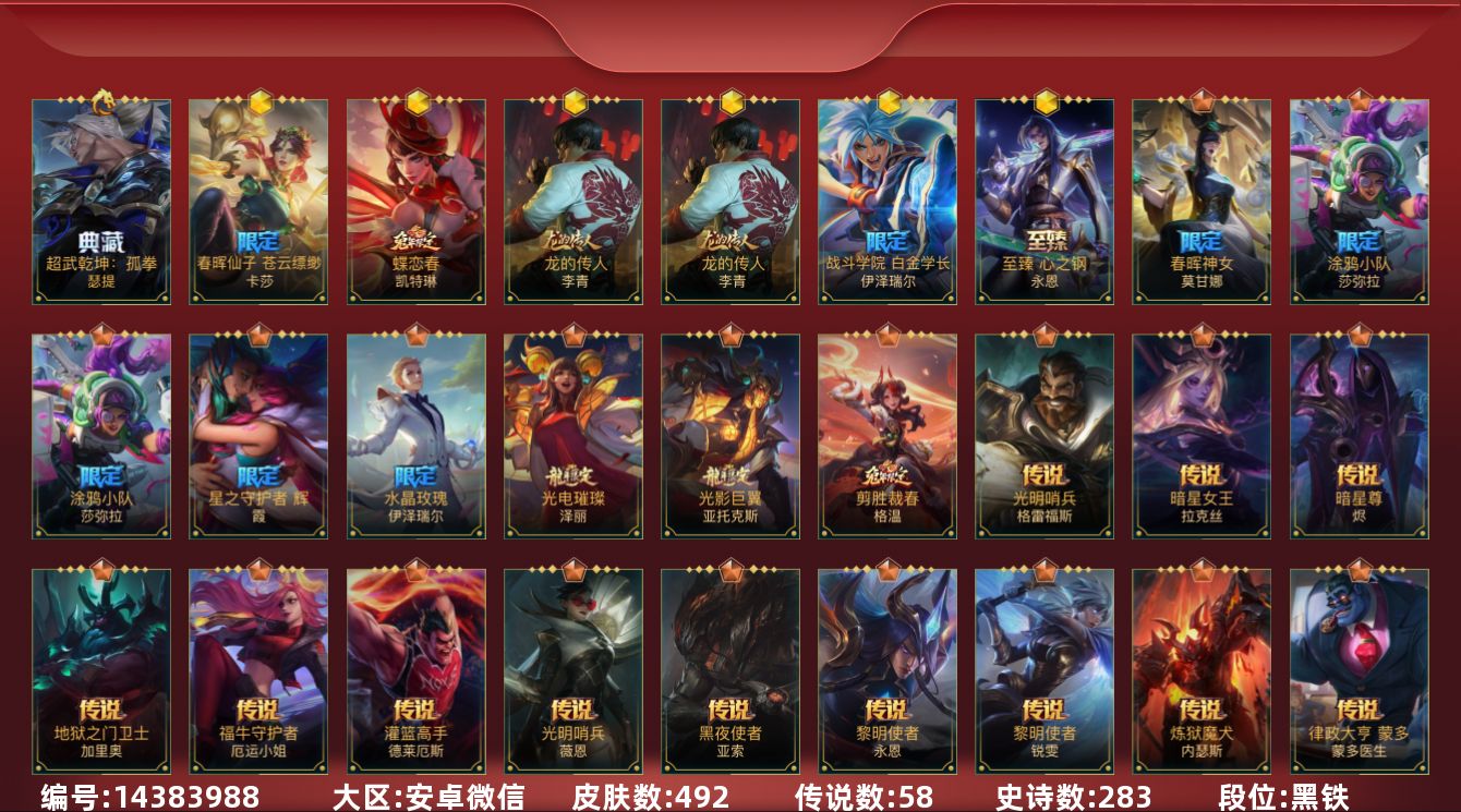 [14383988]有二次!社交限制可解!9套收集黑龙回城!8.3w收藏!492皮肤1典藏超武瑟提7神话58传说283史诗!超武孤拳!满龙年-满兔年-至臻心之钢永恩-战斗纹章冰糖葫芦! 神话:春晖仙子卡莎 至臻心之钢永恩 战斗学院伊泽瑞尔 蝶恋春 龙的传人 ,超武乾坤:孤拳 瑟提,黎明使者 破晓之殇 佛耶戈,神王 盖伦,神龙尊者 驭风啸龙,桃映暖春 灼灼芳菲 拉克丝,春晖仙子 苍云缥缈 卡莎,至臻 心之钢 永恩,战斗学院 白金学长 伊泽瑞尔,蝶恋春 凯特琳,龙的传人 李青,光影巨翼 亚托克斯,战斗学院 凯特琳,太空律动 “猫猫”布里和里茨 布里茨,西部魔影 大小姐 蕾欧娜,月蚀骑士 蕾欧娜,驯龙炮手 崔丝塔娜,光电璀璨 泽丽,春晖神女 莫甘娜,暗星女王 拉克丝,最终BOSS 维迦,源计划:毁灭 派克,福牛守护者 厄运小姐,跳跳倩影 厄运小姐,灵魂莲华 瑟提,光明哨兵 格雷福斯,星域武神 贾克斯,魔女 伊芙琳,霸天零式 赛恩,地狱之门卫士 加里奥,星之守护者 卡莎,未来战士 凯特琳,斗魂无双 亚索,黑夜使者 亚索,源计划:泯灭 雷克顿,黎明使者 永恩,律政大亨 蒙多医生,炼狱魔犬 内瑟斯,女主播 迦娜,战斗学院 伊泽瑞尔,星之守护者 阿狸,日蚀骑士 蕾欧娜,剪胜裁春 格温,神拳 李青,涂鸦小队 莎弥拉,星域游侠 崔斯特,星之守护者 辉 霞,星之守护者 落 霞,星之守护者 金克丝,暗星尊 烬,光明哨兵 薇恩,源计划:净化 薇恩,天煞 劫,星之守护者 陨 洛,欧米伽小队 幽灵特工 提莫,黎明使者 锐雯,西部天使 赛娜,西部魔影 卢锡安,西部天使 艾希,灌篮高手 德莱厄斯,神王 德莱厄斯,水晶玫瑰 伊泽瑞尔,源计划:联合 艾希,神龙尊者 驭风啸龙 易