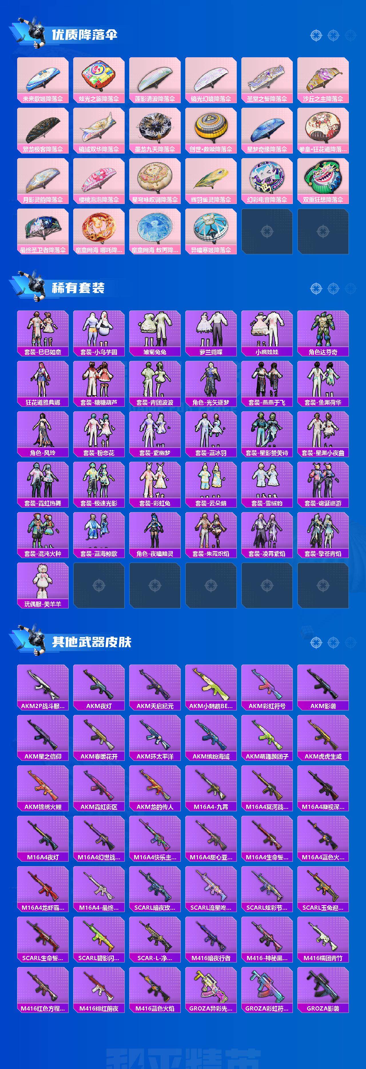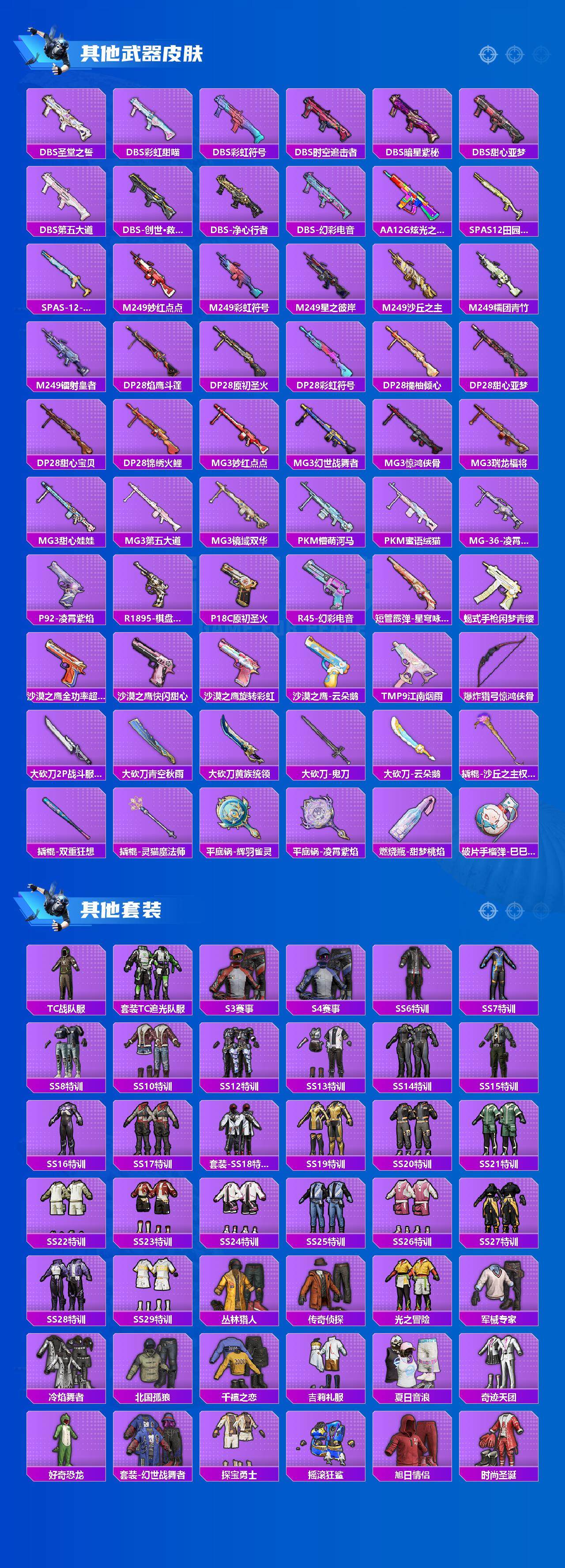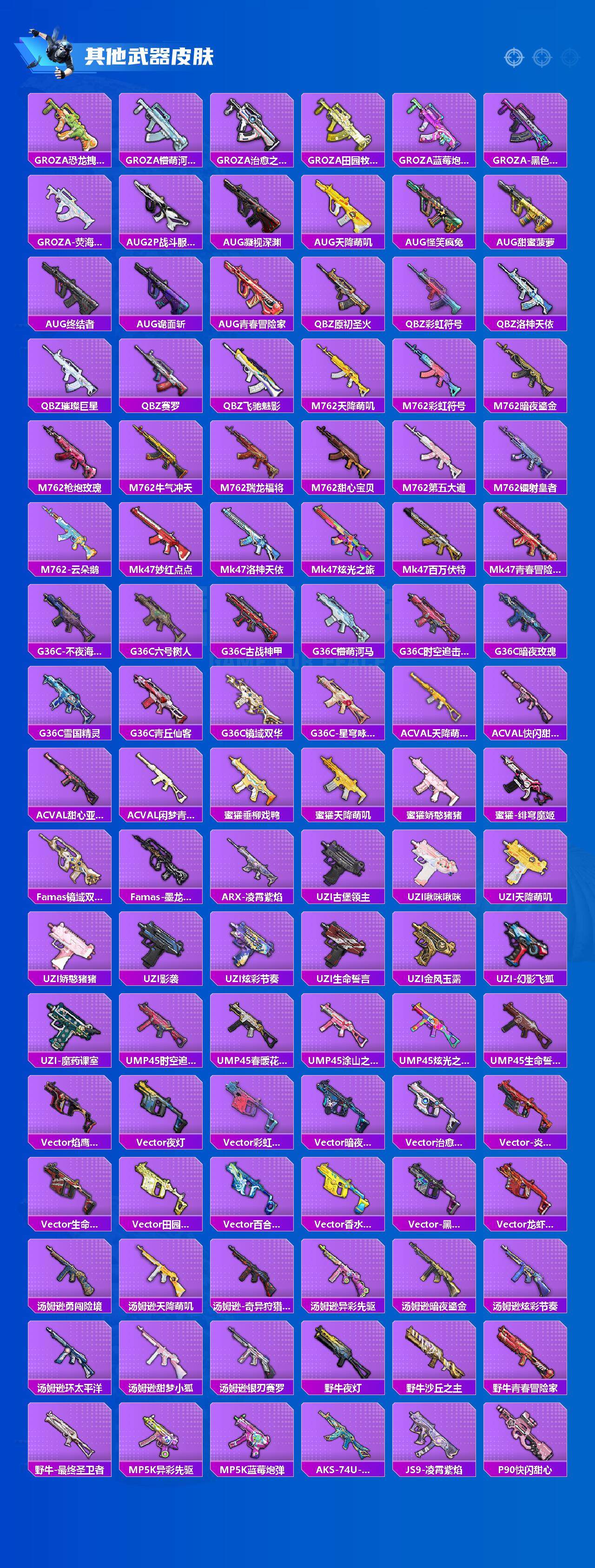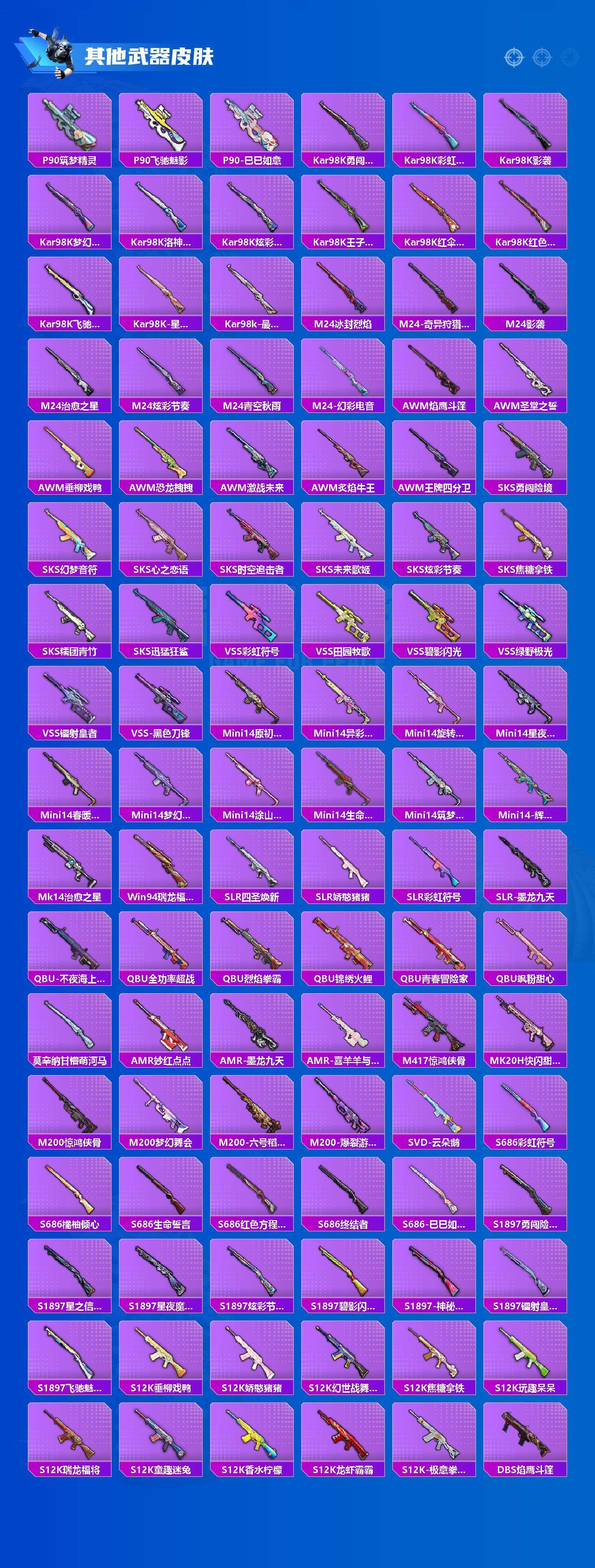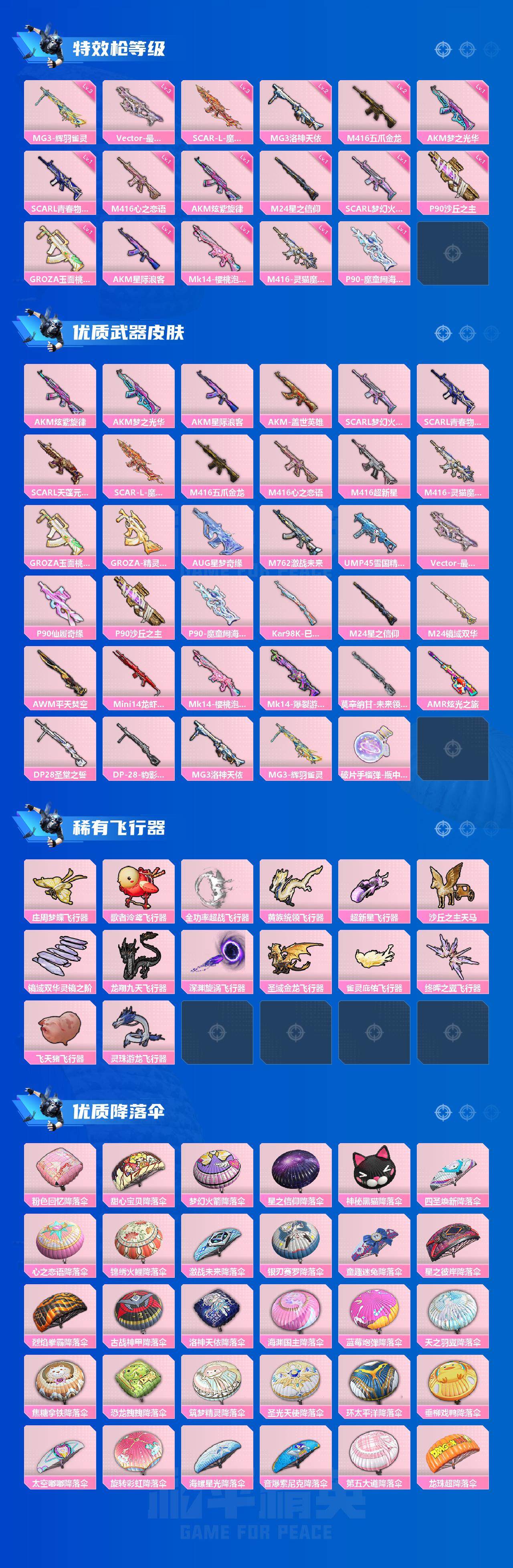 AKM-炫紫旋律,AKM-梦之光华,AKM-星际浪客,AKM-盖世英雄,SCAR-L-梦幻火箭,SCAR-L-青春物语,SCAR-L-天蓬元帅,M416-五爪金龙,M416-心之恋语,M416-超新星,GROZA-玉面桃花,GROZA-精灵之光,AUG-星梦奇缘,M762-激战未来,UMP45-雪国精灵,P90-仙履奇缘,P90-沙丘之主,Kar98K-巳巳如意,M24-星之信仰,M24-镜域双华,AWM-平天焚空,Mini14-龙虾霸霸,Mk14-樱桃泡泡,莫辛纳甘-未来领航者,AMR-炫光之旅,DP-28-圣堂之誓,MG3-洛神天依