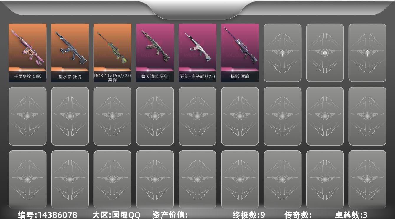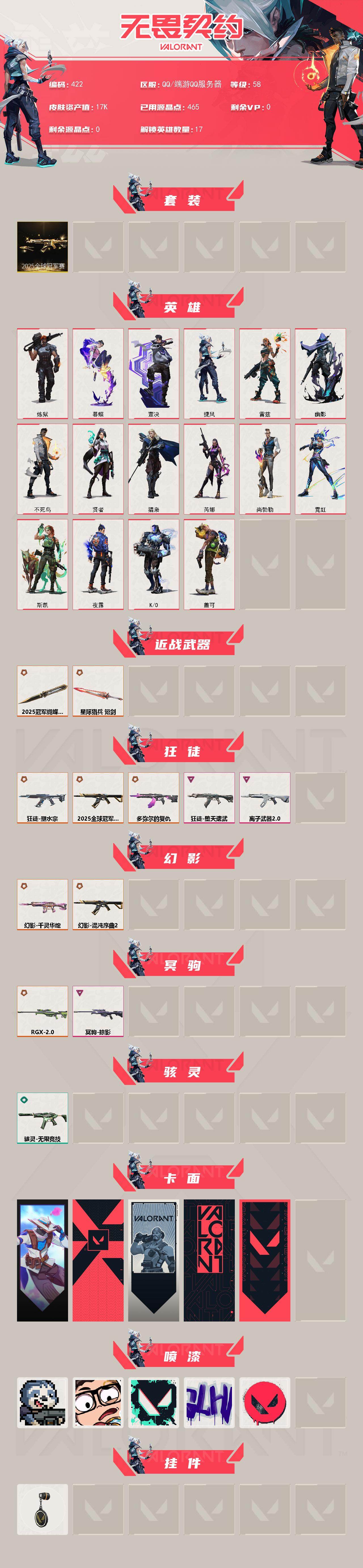 [14386078]【套装】:2025全球冠军赛套装 【英雄】:炼狱,暮蝶,壹决,捷风,雷兹,幽影,不死鸟,贤者,猎枭,芮娜,尚勃勒,霓虹,斯凯,夜露,K/O,盖可 【近战 武器】:近战武器-2025全球冠军赛 蝴蝶刀,近战武器-星际猎兵 短剑 【狂徒】:狂徒-2025全球冠军赛,狂徒-塑水宗,狂徒-多弥尔的复仇,狂徒-堕天遗武,狂徒-离子武器//2.0 【幻影】:幻影-千灵华绽,幻影-混沌序曲//2.0 【冥驹】:冥驹-RGX 11z Pro//2.0,冥驹-掠影 【骇灵】:骇灵-无限竞技 【卡面】:无畏契约GO!第一卷:零 卡面,代号红色 卡面,新兵报到 卡面,V契约 卡面,无畏契约 卡面 【喷漆】:审判之爪 喷漆,新潮流 喷漆,胜利属于无畏契约 喷漆,GLHF 喷漆,无畏契约 喷漆 【挂饰】:无畏契约 纪念币 挂饰