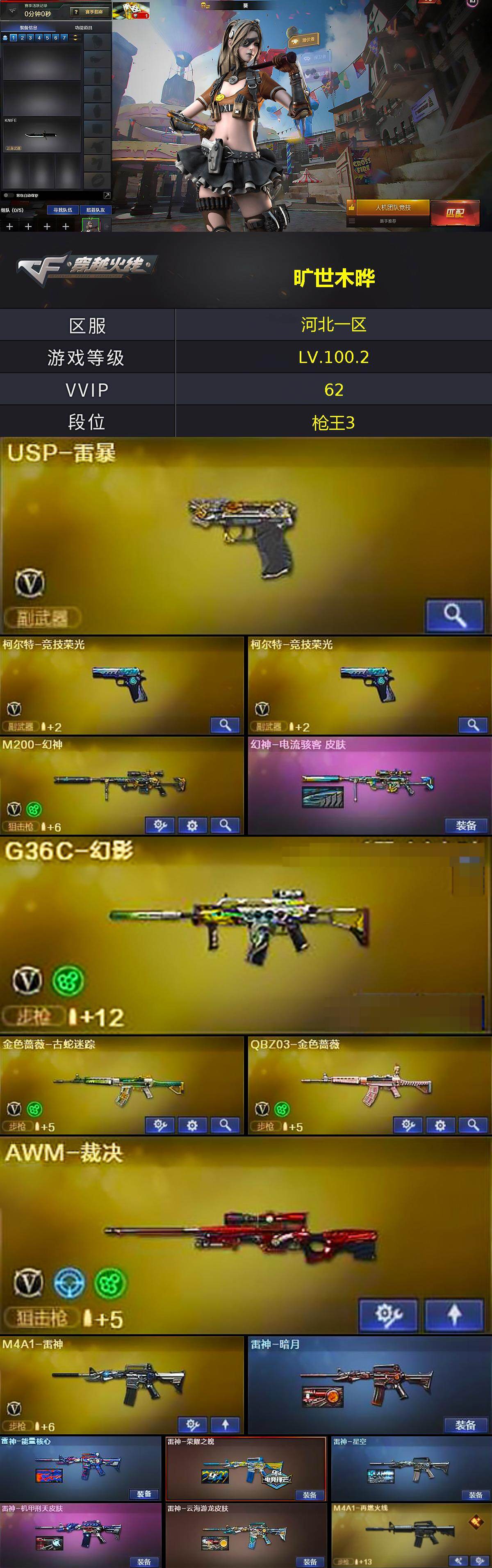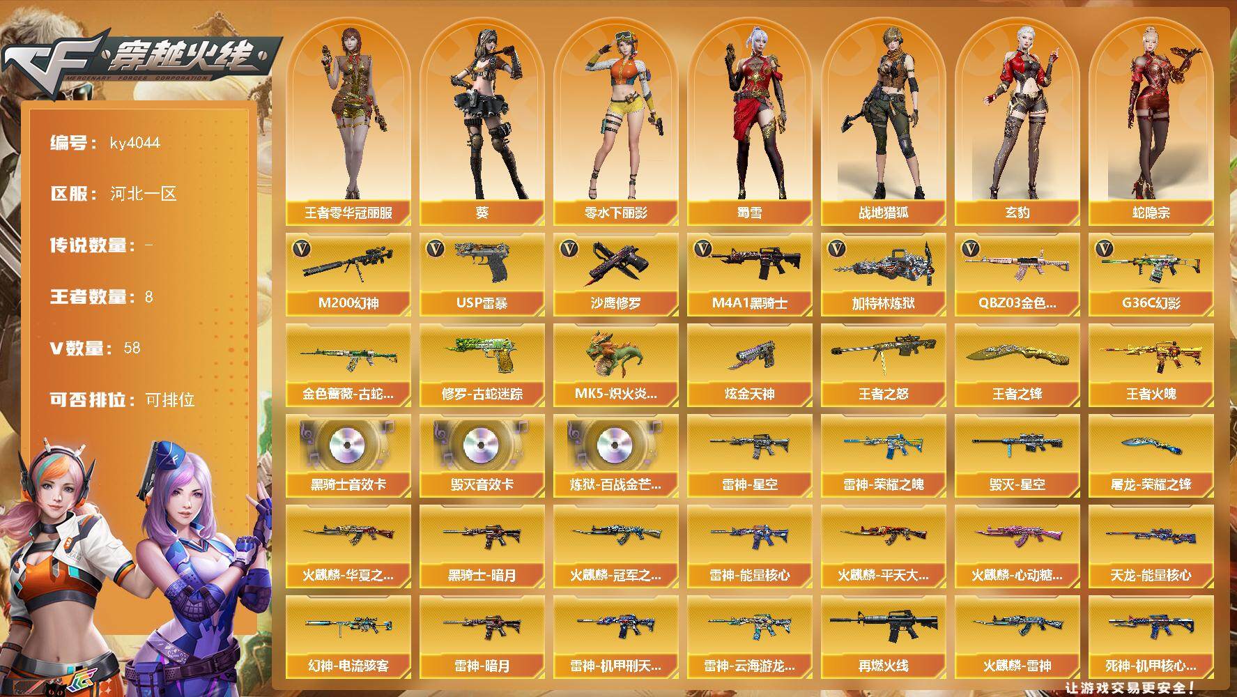 - [11882515]可二次 可修改实名 排位资格:有 1传说武器 8V武器 3皮肤 可排位 宗师 武器:传说幽瞳,无影-神兵利器,机械迷城-穹宇,修罗-古蛇迷踪,Barrett-毁灭,M4A1-雷神,M200-幻神,金色蔷薇-古蛇迷踪