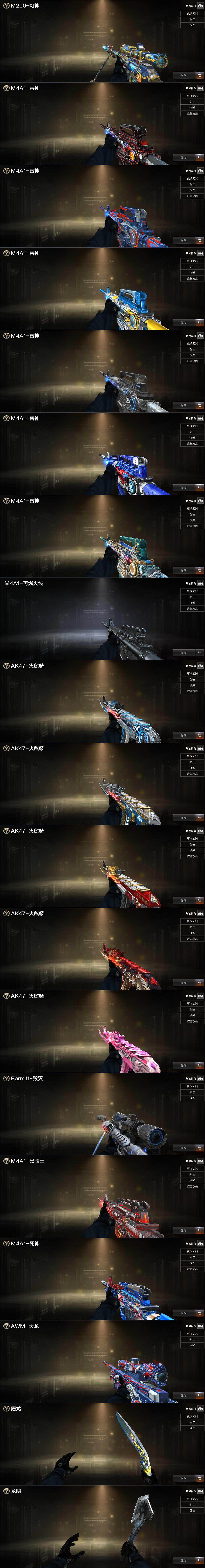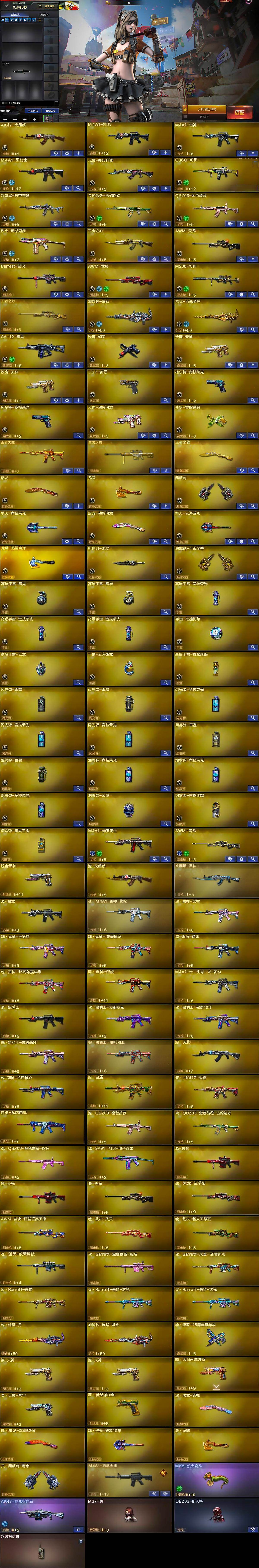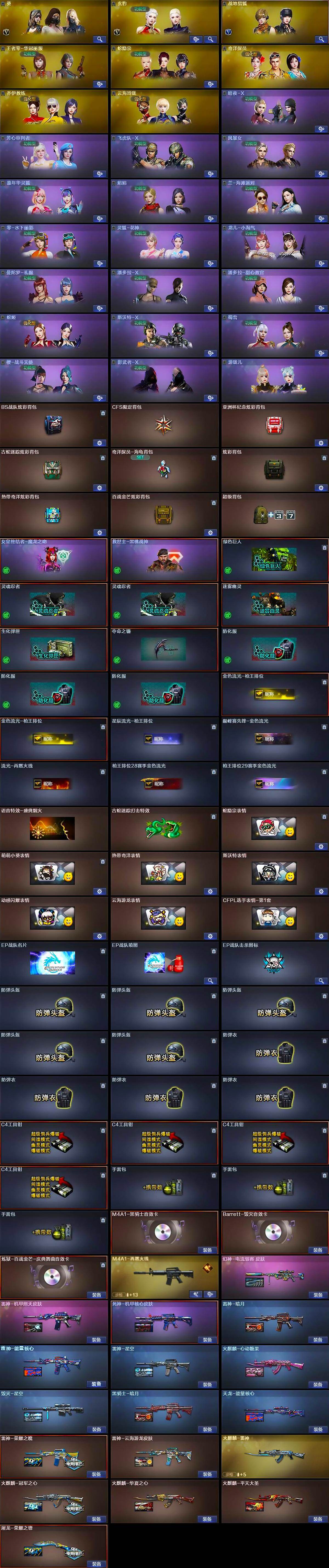 【英雄级武器】:AK47-火麒麟,M4A1-黑龙,M4A1-雷神,M4A1-黑骑士,无影-神兵利器,G36C-幻影,超新星-热带奇洋,金色蔷薇-古蛇迷踪,QBZ03-金色蔷薇,烈火-动感闪耀,王者之心-觉醒版,AWM-天龙,Barrett-毁灭,AWM-裁决,M200-幻神,王者之力-觉醒版,加特林-炼狱,炼狱-百战金芒,AA-12-雷霆,沙鹰-修罗,沙鹰-天神*2,USP-雷暴,柯尔特-竞技荣光*2,天神-动感闪耀,修罗-古蛇迷踪,屠龙,龙啸,麒麟刺,擎天-竞技荣光,屠龙-动感闪耀,擎天-云海游龙,龙啸-热带奇洋,斩神刀-雷暴,麒麟刺-百战金芒,高爆手雷-雷霆,高爆手雷-雷暴,高爆手雷-竞技荣光*3,手雷-动感闪耀,高爆手雷-云龙,手雷-云海游龙,高爆手雷-古蛇迷踪,闪光弹-雷霆,闪光弹-雷暴,闪光弹-竞技荣光*3,烟雾弹-雷霆,烟雾弹-雷暴,烟雾弹-竞技荣光*3,烟雾弹-云龙,烟雾弹-古蛇迷踪,烟雾弹-雷霆王者-觉醒版