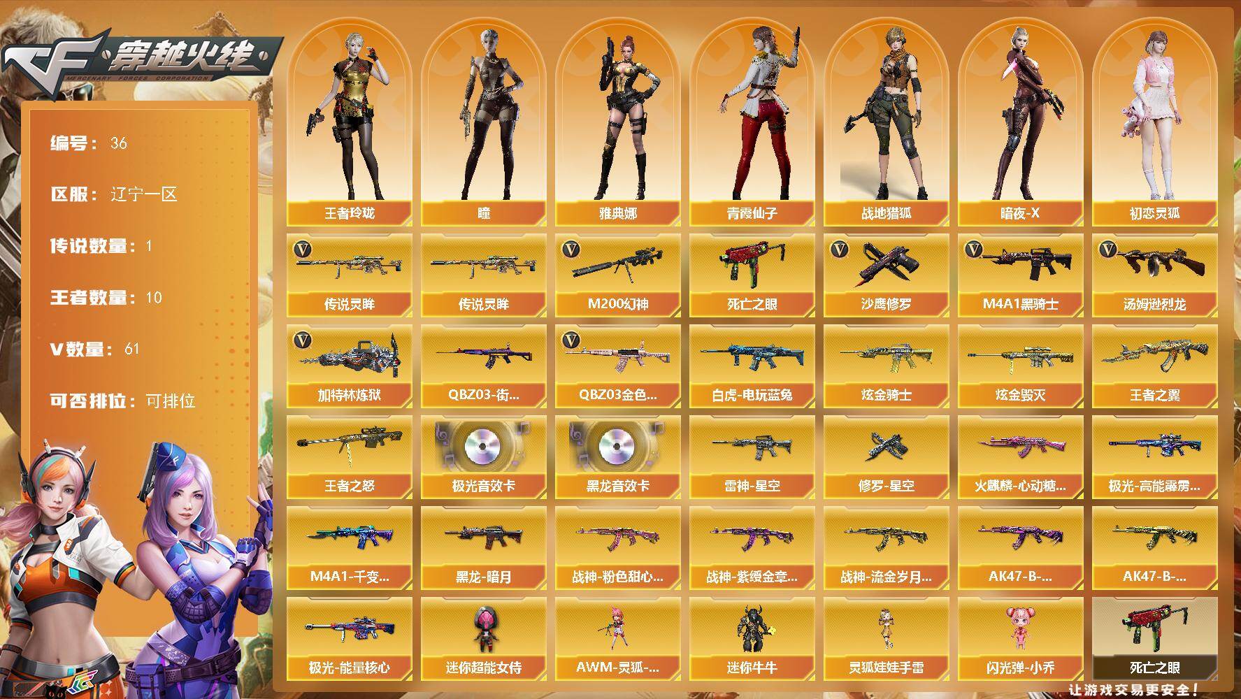[14387850]辽宁一区-61V-10王者-3炫金 【传说武器】:传说灵眸 【热门武器】:传说灵眸,QBZ03-金色蔷薇,M200-幻神,死亡之眼,白虎-电玩蓝兔,QBZ03-街机,M4A1-黑骑士,汤姆逊-烈龙*4,加特林-炼狱,沙鹰-修罗*2 【王者炫金武器】:王者之翼,王者之怒,炫金骑士*2,炫金毁灭 【音效卡】:M4A1-黑龙音效卡,Barrett-极光音效卡 【皮肤】:雷神-星空,火麒麟-心动糖果,M4A1-千变-孔明皮肤,黑龙-暗月,战神-粉色甜心皮肤,战神-紫绶金章皮肤*4,战神-流金岁月皮肤*3,AK47-B-常胜将军-曹操,AK47-B-常胜将军-孙权*3,极光-能量核心,极光-高能霹雳 皮肤,修罗-星空 【角色】:瞳,战地猎狐,王者玲珑,暗夜-X,初恋灵狐,飞虎队-X,嘉年华灵狐,灵狐者-黄金海岸,灵狐者-七夕宝贝,龙儿-小淘气,曼陀罗-礼服,娜塔莉娅,潘多拉-X,潘多拉-甜心教官,青霞仙子,斯沃特-X,兔囡囡,游珑儿,雅典娜 【人偶武器】:AWM-灵狐-15周年嘉年华,迷你牛牛,闪光弹-小乔,迷你超能女侍,灵狐娃娃手雷 【暴走生化】:死亡之眼 【挑战大师】:冰龙粉碎者-白马银枪*2,激光毁灭者III-白马银枪,VEPR-12-金魔,激光毁灭者III,神圣爆裂者-末日III 【英雄级武器】:AK47-火麒麟,M4A1-黑龙,M4A1-雷神,M4A1-黑骑士,AK47-无影,无影-神兵利器,黑武士-锦绣游龙,QBZ03-金色蔷薇,王者之翼-觉醒版,王者之魄-觉醒版,王者之幻-觉醒版,AK-47-猩红传说*6,AK47-B-战神,白虎-电玩蓝兔,黑武士-CF网剧冠军,AWM-天龙,Barrett-毁灭,Barrett-极光,M200-幻神,加特林-炼狱,汤姆逊-烈龙*4,沙鹰-修罗*2,沙鹰-天神*2,天神-CF网剧冠军,屠龙,麒麟刺-堕天神,马来剑-夜魔,擎天,麒麟刺,擎天-竞技荣光,擎天-CF网剧冠军,王者之啸-觉醒版*2,高爆手雷-堕天神,高爆手雷-夜魔*3,高爆手雷-竞技荣光,闪光弹-堕天神,闪光弹-夜魔*3,闪光弹-竞技荣光,烟雾弹-堕天神,烟雾弹-夜魔*3,烟雾弹-竞技荣光*2 【道具】:KZ战队炫彩背包,亚洲杯纪念炫彩背包,炫彩背包,超级背包,救世主-黑桃战神,绿色巨人,灵魂忍者,迷雾幽灵,夺命之镰*2,防化服*3,金色流光-枪王排位*2,星辰流光-