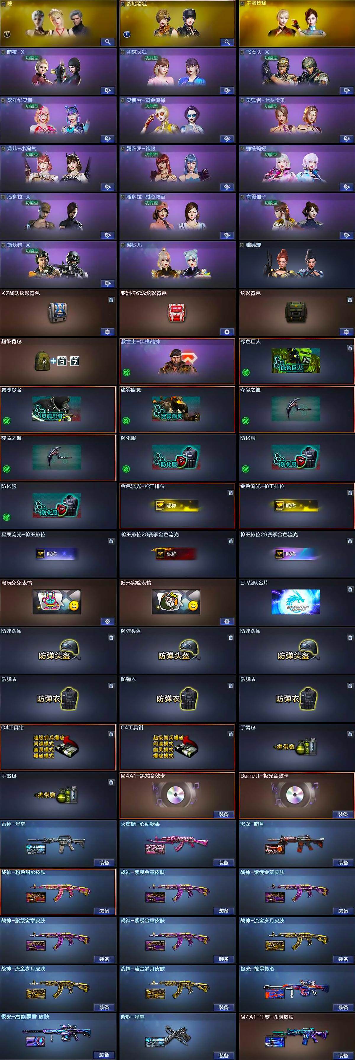 【英雄级武器】:AK47-火麒麟,M4A1-黑龙,M4A1-雷神,M4A1-黑骑士,AK47-无影,无影-神兵利器,黑武士-锦绣游龙,QBZ03-金色蔷薇,王者之翼-觉醒版,王者之魄-觉醒版,王者之幻-觉醒版,AK-47-猩红传说*6,AK47-B-战神,白虎-电玩蓝兔,黑武士-CF网剧冠军,AWM-天龙,Barrett-毁灭,Barrett-极光,M200-幻神,加特林-炼狱,汤姆逊-烈龙*4,沙鹰-修罗*2,沙鹰-天神*2,天神-CF网剧冠军,屠龙,麒麟刺-堕天神,马来剑-夜魔,擎天,麒麟刺,擎天-竞技荣光,擎天-CF网剧冠军,王者之啸-觉醒版*2,高爆手雷-堕天神,高爆手雷-夜魔*3,高爆手雷-竞技荣光,闪光弹-堕天神,闪光弹-夜魔*3,闪光弹-竞技荣光,烟雾弹-堕天神,烟雾弹-夜魔*3,烟雾弹-竞技荣光*2