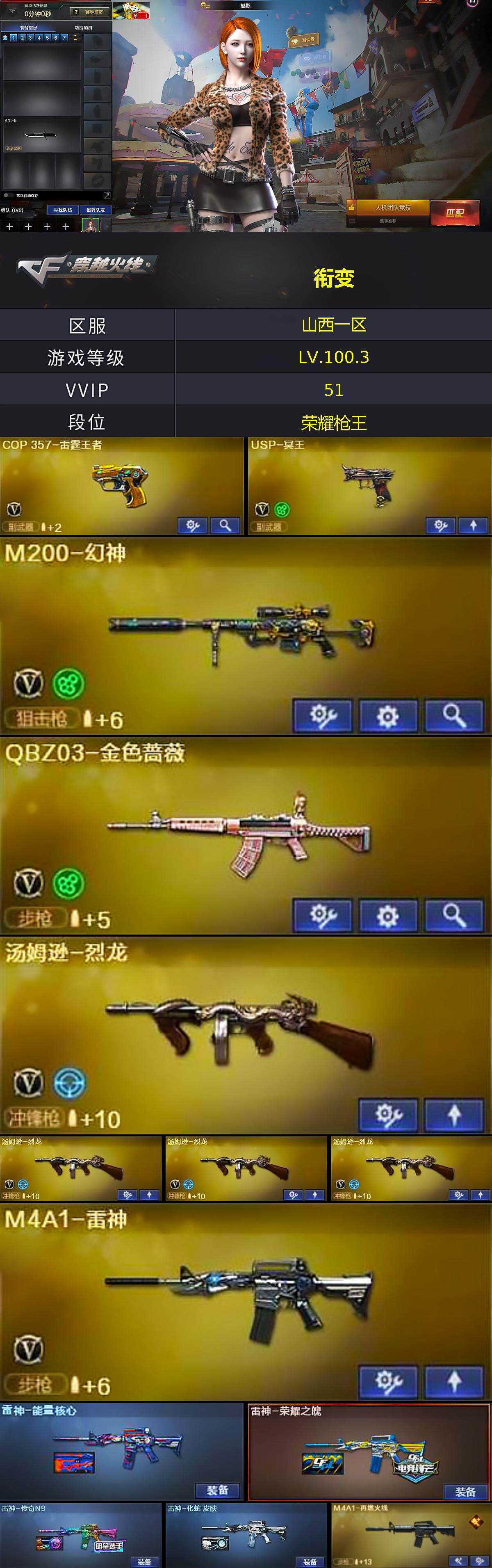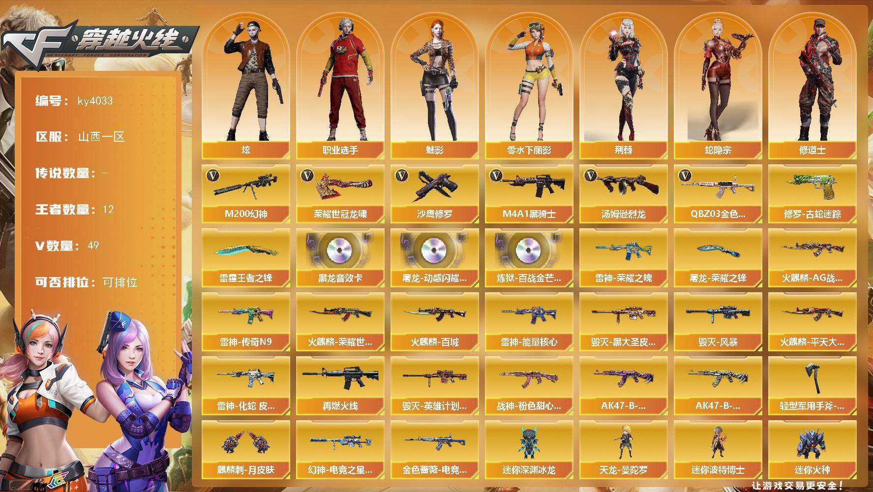 [14387961]山西一区-49V-12王者-0炫金 【热门武器】:QBZ03-金色蔷薇,M200-幻神,修罗-古蛇迷踪,M4A1-黑骑士,汤姆逊-烈龙*4,沙鹰-修罗,荣耀世冠-龙啸 【王者炫金武器】:雷霆王者之锋 【音效卡】:屠龙-动感闪耀 音效卡,M4A1-黑龙音效卡,炼狱-百战金芒-庆典舞曲音效卡 【皮肤】:幻神-电竞之星 皮肤,金色蔷薇-电竞之星 皮肤,雷神-能量核心,雷神-荣耀之魄,雷神-传奇N9,雷神-化蛇 皮肤,M4A1-再燃火线,火麒麟-AG战队皮肤,火麒麟-平天大圣,火麒麟-荣耀世冠AG,火麒麟-百城,毁灭-黑大圣皮肤,毁灭-风暴,毁灭-英雄计划 皮肤,战神-粉色甜心皮肤,AK47-B-常胜将军-曹操*2,AK47-B-常胜将军-刘备*2,屠龙-荣耀之锋,轻型军用手斧-再燃火线,麒麟刺-月皮肤 【角色】:魅影,炫,荆棘,蛇隐宗,修道士,暗夜-X,初恋灵狐,风暴女,娟娟,兰-新年限定,零-水下丽影,灵狐者-X,灵狐者-七夕宝贝,麻雀,曼陀罗-X,潘多拉-X,潘多拉-甜心教官,蛇姬,雪莉杨-摸金校尉,夜玫瑰-宠粉,影武者-X,游珑儿,职业选手 【人偶武器】:天龙-曼陀罗,迷你深渊冰龙,迷你波特博士*3,迷你火种,闪光弹-小乔,闪光弹-貂蝉,高爆手雷-大乔 【暴走生化】:超级对讲机 【英雄级武器】:AK47-火麒麟,M4A1-黑龙,M4A1-雷神,M4A1-黑骑士,AK47-黑武士,M4A1-龙血,黑武士-锦绣游龙,QBZ03-金色蔷薇,AK-47-猩红传说,黑骑士-海王,AK47-B-常胜将军,M4A1-雷霆王者-觉醒版,Barrett-毁灭,Barrett-极光,M200-幻神,炼狱-百战金芒,汤姆逊-烈龙*4,沙鹰-修罗,沙鹰-天神*5,COP 357-雷霆王者-觉醒版,USP-冥王,修罗-古蛇迷踪,屠龙,麒麟刺,荣耀世冠-龙啸,麒麟刺-百战金芒,高爆手雷-幻灵,高爆手雷-竞技荣光,高爆手雷-古蛇迷踪,闪光弹-幻灵*2,闪光弹-竞技荣光,闪光弹-雷霆王者-觉醒版,烟雾弹-幻灵,烟雾弹-竞技荣光,烟雾弹-古蛇迷踪,M4A1-赤狱骑士 【道具】:BS战队炫彩背包,CFS限定背包,Q9战队炫彩背包,亚洲杯纪念炫彩背包,古蛇迷踪炫彩背包,女皇终结者-背包,白狐背包,百战金芒炫彩背包,超级背包,女皇终结者-魔龙之吻,救世主-黑桃战神,绿色巨人,灵魂忍者,妖姬,迷雾幽灵,夺
