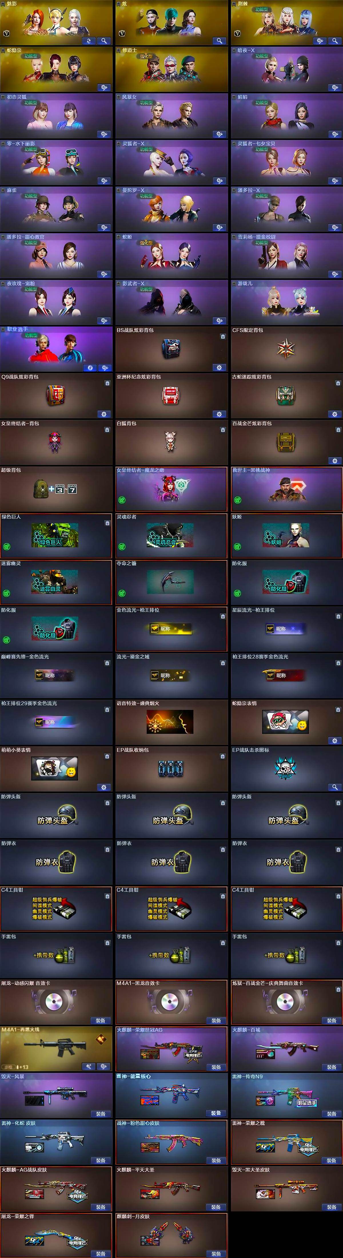 【道具】:BS战队炫彩背包,CFS限定背包,Q9战队炫彩背包,亚洲杯纪念炫彩背包,古蛇迷踪炫彩背包,女皇终结者-背包,白狐背包,百战金芒炫彩背包,超级背包,女皇终结者-魔龙之吻,救世主-黑桃战神,绿色巨人,灵魂忍者,妖姬,迷雾幽灵,夺