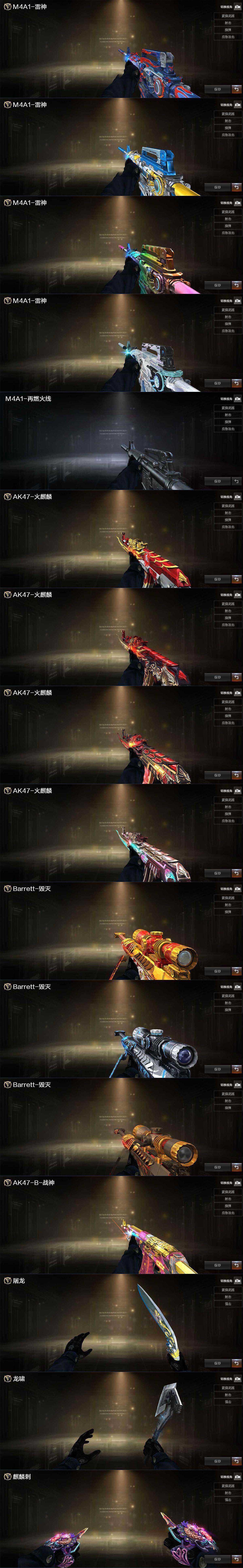 【英雄级武器】:AK47-火麒麟,M4A1-黑龙,M4A1-雷神,M4A1-黑骑士,AK47-黑武士,M4A1-龙血,黑武士-锦绣游龙,QBZ03-金色蔷薇,AK-47-猩红传说,黑骑士-海王,AK47-B-常胜将军,M4A1-雷霆王者-觉醒版,Barrett-毁灭,Barrett-极光,M200-幻神,炼狱-百战金芒,汤姆逊-烈龙*4,沙鹰-修罗,沙鹰-天神*5,COP 357-雷霆王者-觉醒版,USP-冥王,修罗-古蛇迷踪,屠龙,麒麟刺,荣耀世冠-龙啸,麒麟刺-百战金芒,高爆手雷-幻灵,高爆手雷-竞技荣光,高爆手雷-古蛇迷踪,闪光弹-幻灵*2,闪光弹-竞技荣光,闪光弹-雷霆王者-觉醒版,烟雾弹-幻灵,烟雾弹-竞技荣光,烟雾弹-古蛇迷踪,M4A1-赤狱骑士